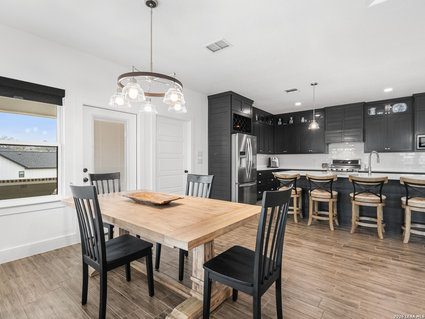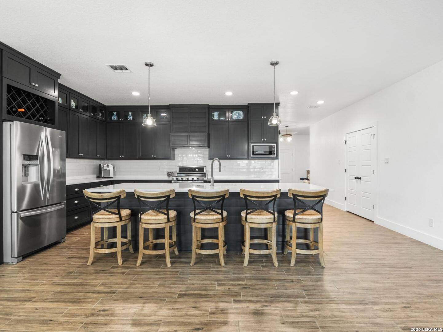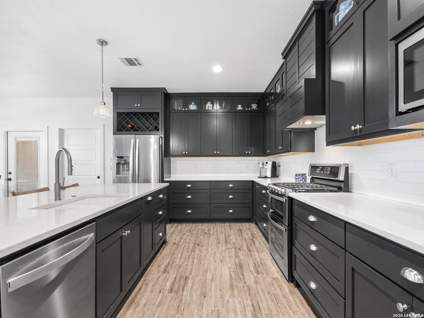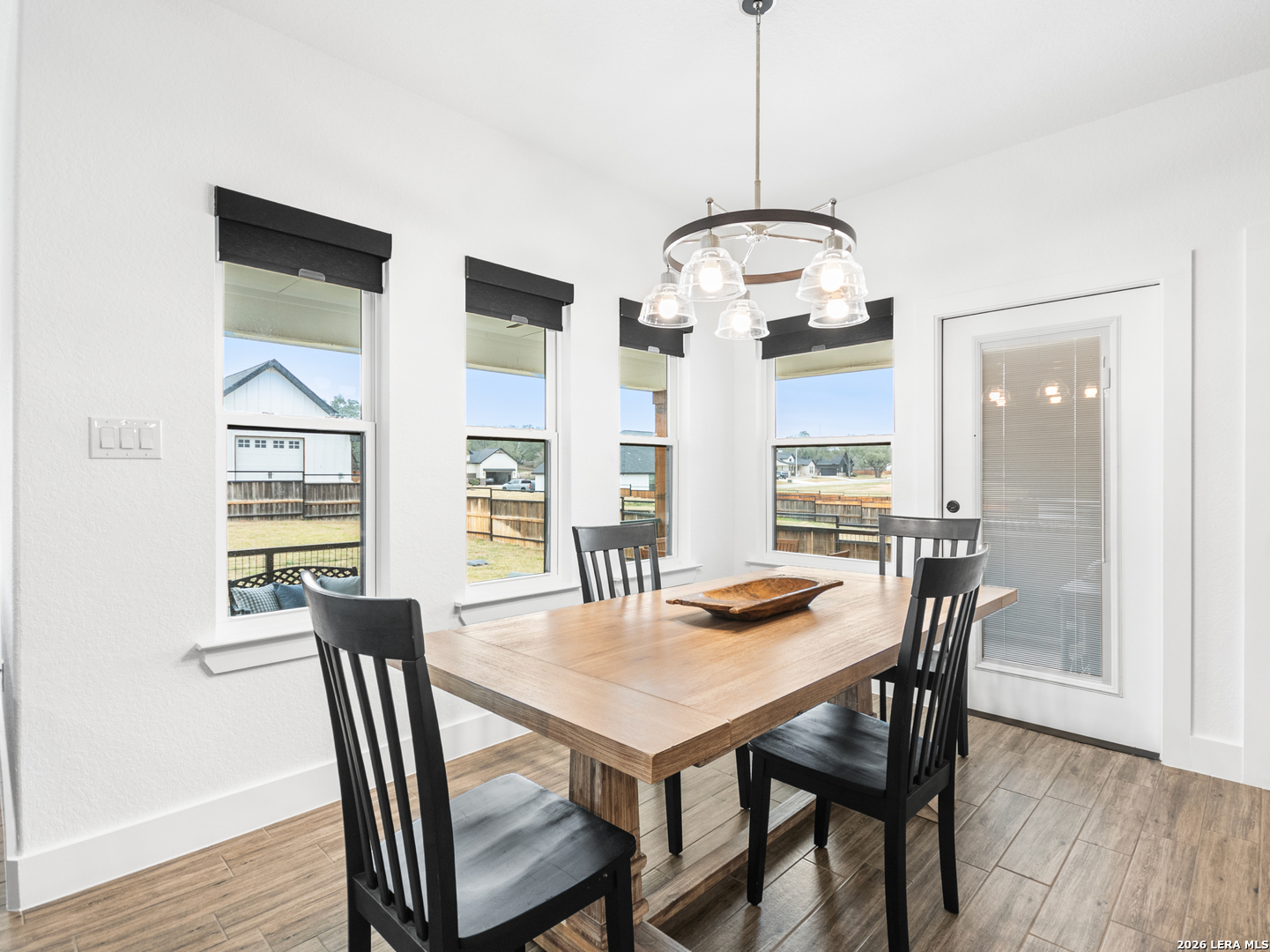 Located in the desirable Woodbridge Farms community of La Vernia, this custom residence by D&D Custom Homes offers a thoughtful blend of quality construction, functional design, and modern finishes. The heart of the home features an exquisite custom kitchen open to the living and dining areas, highlighted by soaring ceilings, a wood-burning fireplace with German-smeared brick hearth, custom-milled cabinetry that extends to the ceiling for added storage and visual impact, quartz countertops, and sleek, low-maintenance tile flooring throughout the main living spaces. A dedicated main-level study provides an ideal home office or quiet workspace. Designed for effortless everyday living, all secondary bedrooms and the primary suite are located on the main level. Above the kitchen, a spacious flex room offers exceptional versatility and comfort, complete with a wet bar and its own mini-split air conditioning system, which is perfect for a game room, media room, or additional living area. The home is CAT-6 wired throughout and includes a Reolink camera system for enhanced connectivity and security, along with a whole-house water filtration system and lawn sprinkler system for added convenience and efficiency. Outdoor living is equally inviting with a covered back patio already equipped with a propane gas line for a future custom outdoor kitchen. Additional highlights include an oversized two-car garage and a partially finished walk-in attic providing valuable storage or future expansion potential. Enjoy the balance of country surroundings and a well-appointed interior in a residence that pairs thoughtful upgrades with enduring design in one of La Vernia's most desirable settings.