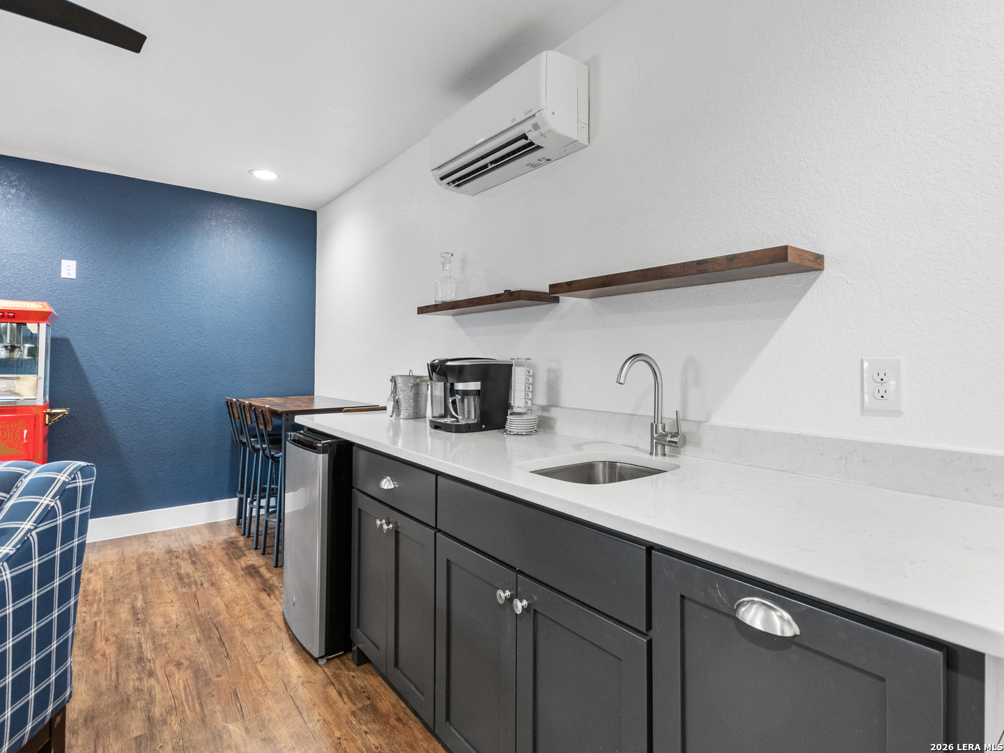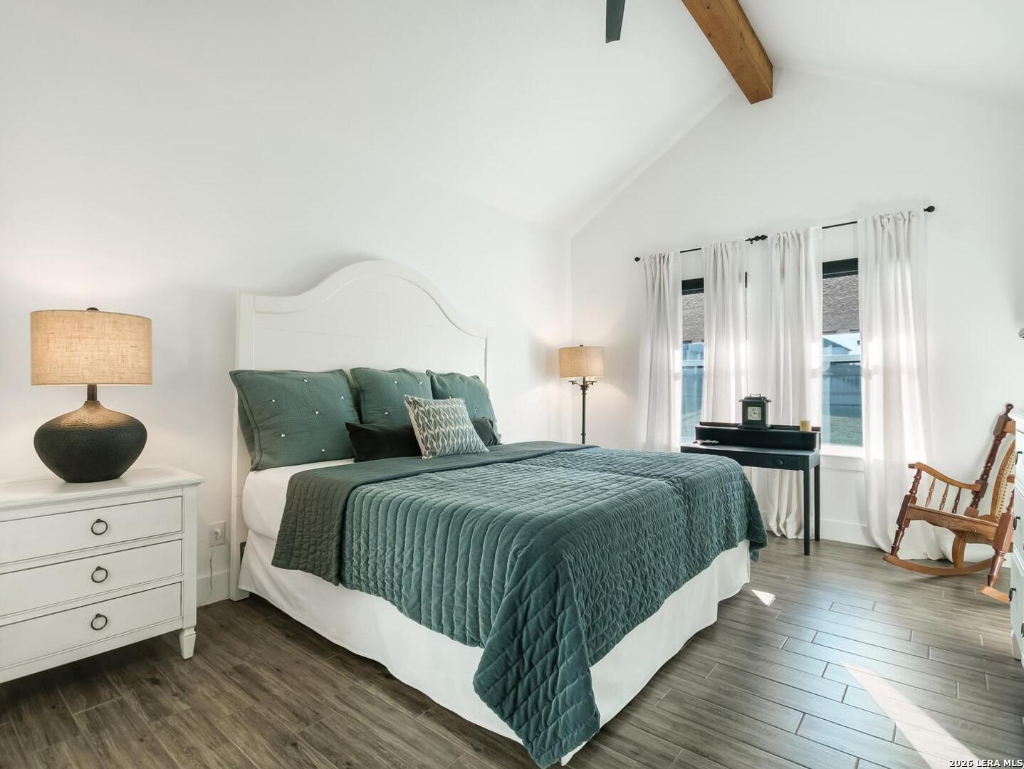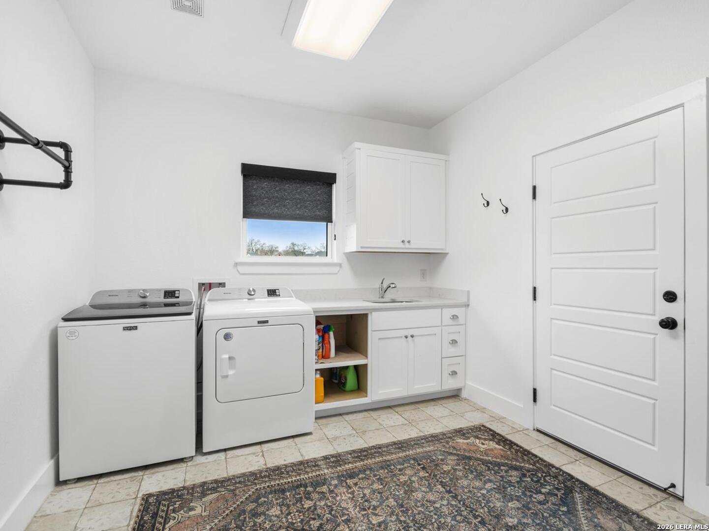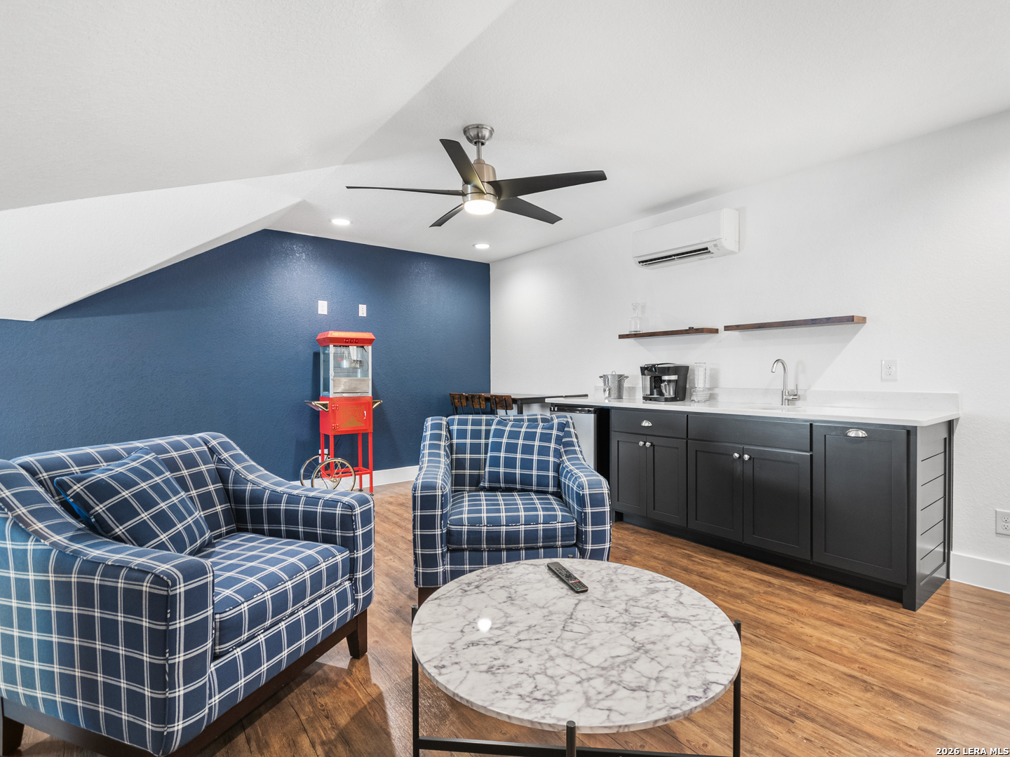 Located in the desirable Woodbridge Farms community of La Vernia, this custom residence by D&D Custom Homes offers a thoughtful blend of quality construction, functional design, and modern finishes. The heart of the home features an exquisite custom kitchen open to the living and dining areas, highlighted by soaring ceilings, a wood-burning fireplace with German-smeared brick hearth, custom-milled cabinetry that extends to the ceiling for added storage and visual impact, quartz countertops, and sleek, low-maintenance tile flooring throughout the main living spaces. A dedicated main-level study provides an ideal home office or quiet workspace. Designed for effortless everyday living, all secondary bedrooms and the primary suite are located on the main level. Above the kitchen, a spacious flex room offers exceptional versatility and comfort, complete with a wet bar and its own mini-split air conditioning system, which is perfect for a game room, media room, or additional living area. The home is CAT-6 wired throughout and includes a Reolink camera system for enhanced connectivity and security, along with a whole-house water filtration system and lawn sprinkler system for added convenience and efficiency. Outdoor living is equally inviting with a covered back patio already equipped with a propane gas line for a future custom outdoor kitchen. Additional highlights include an oversized two-car garage and a partially finished walk-in attic providing valuable storage or future expansion potential. Enjoy the balance of country surroundings and a well-appointed interior in a residence that pairs thoughtful upgrades with enduring design in one of La Vernia's most desirable settings.