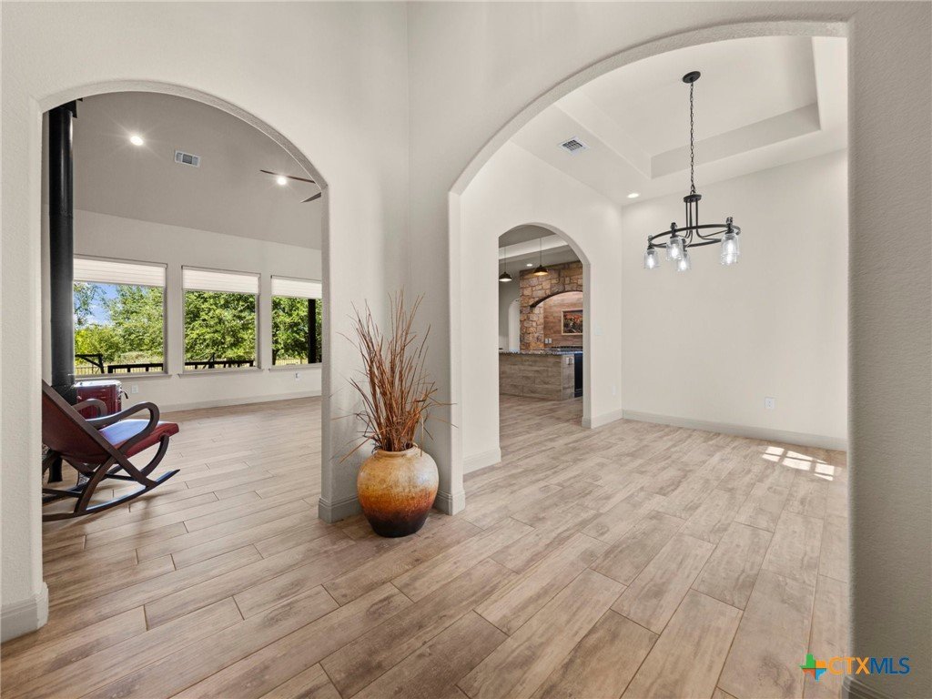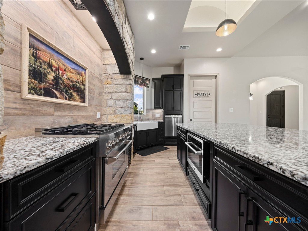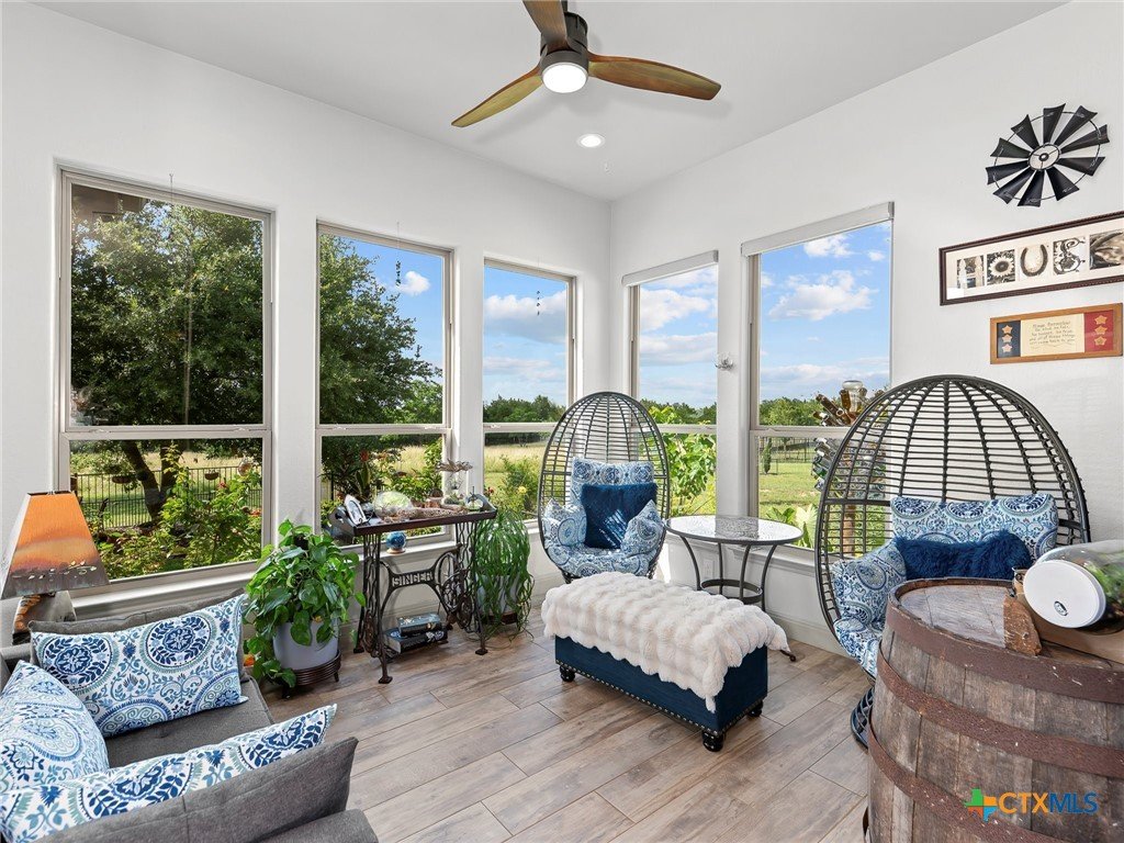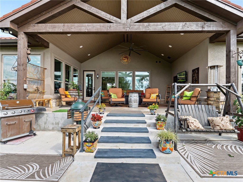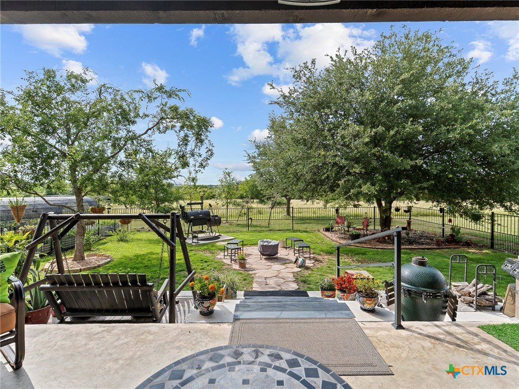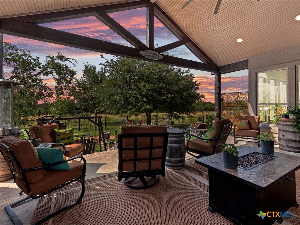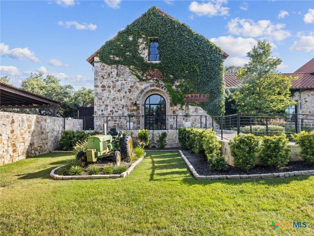 Experience luxury living in the heart of the Texas Hill Country. This stunning home is tucked away inside at gated vineyard community offering access to a farm-to-table restaurant, tasting room, pool, fitness center, regular events to include but not limited to live music, wine dinners/tastings and so much more. Enjoy 360 degree views on a large 1.64 acre lot, the long driveway leading to the home is lined with beautiful trees welcoming you home. Inside, the open-concept layout features cathedral ceilings, a chef's kitchen with a ZLINE convection oven, gas cooktop, stainless steel appliances, farmhouse sink with window, large walk in pantry (8'4"x13'2"), and a dedicated dining room just off the kitchen. The sunroom floods with natural light and leads to a massive covered patio, fully fenced backyard, and a fully enclosed garden with greenhouse. The spacious laundry room includes extra storage, and over-sized sink that is perfect for a pet-washing station. The oversized garage (31'6"x30'x5") is tandem 4 car with extra room for storage or even a workshop. The home offers 3 bedrooms, 3 full baths. A large primary bedroom has an abudance of natural light and gorgeous views. Primary bath has a walk in shower, fireplace and seperate vanities. A true Hill Country retreat with style, space and vineyard lifestyle.
