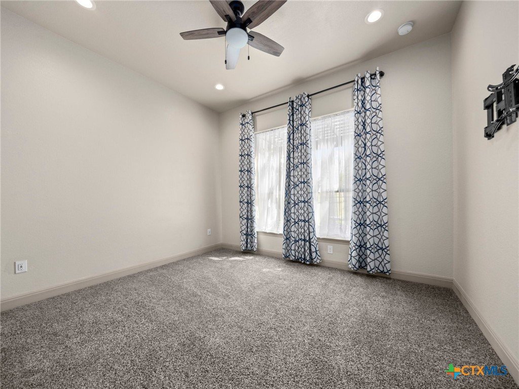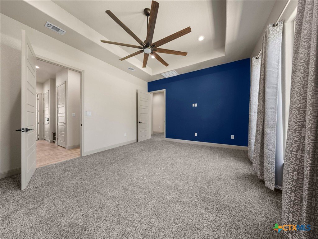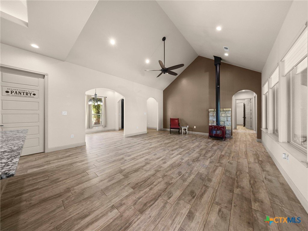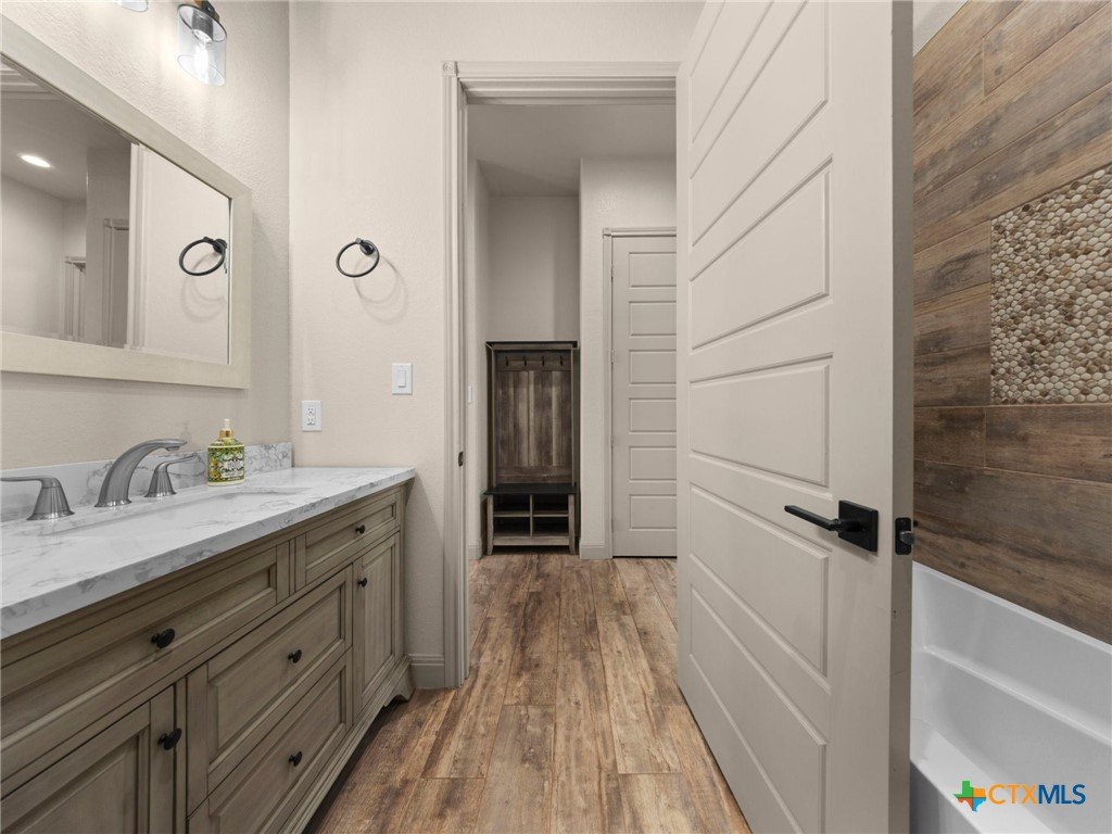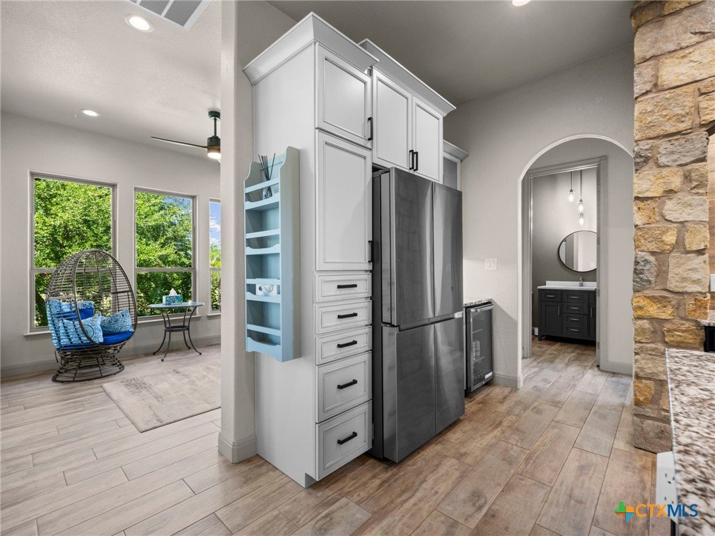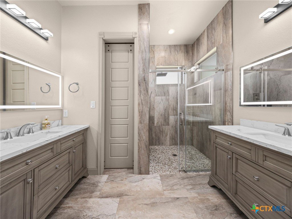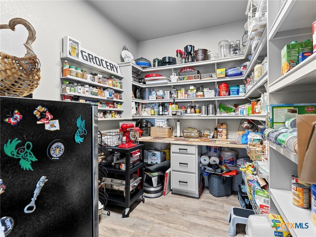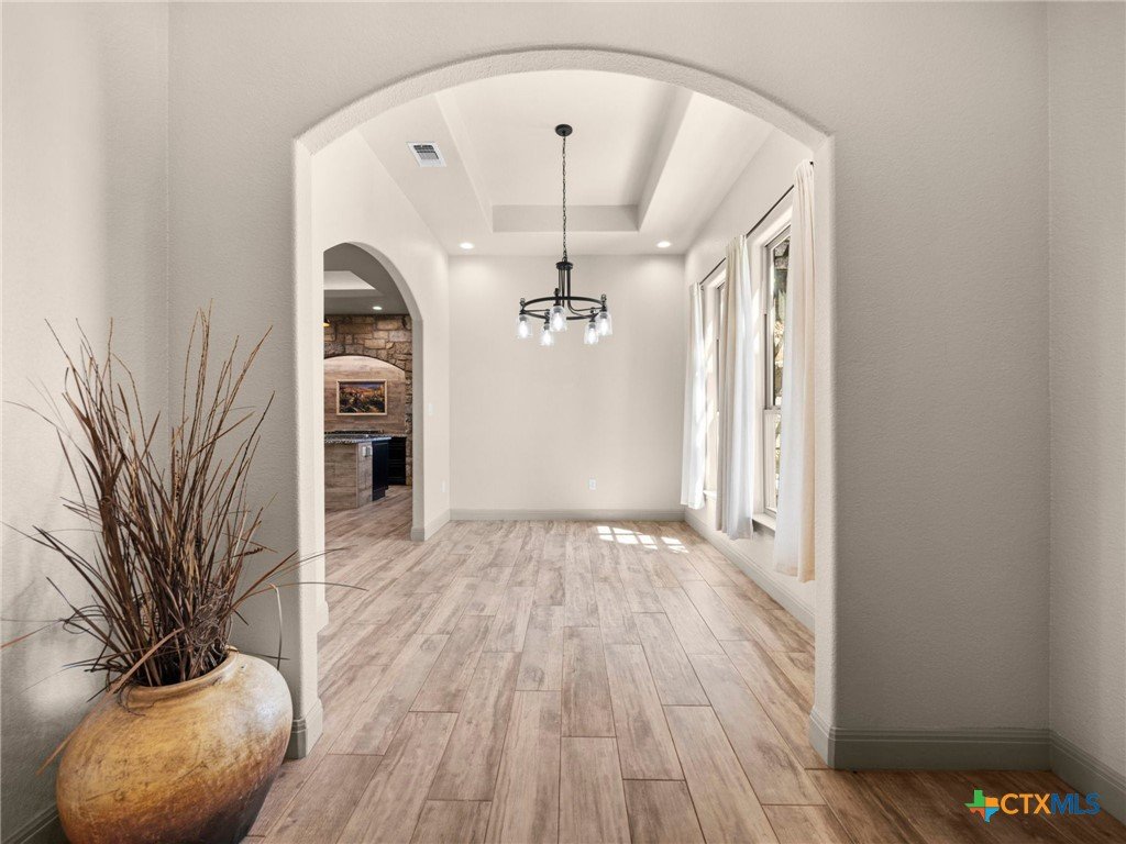 Experience luxury living in the heart of the Texas Hill Country. This stunning home is tucked away inside at gated vineyard community offering access to a farm-to-table restaurant, tasting room, pool, fitness center, regular events to include but not limited to live music, wine dinners/tastings and so much more. Enjoy 360 degree views on a large 1.64 acre lot, the long driveway leading to the home is lined with beautiful trees welcoming you home. Inside, the open-concept layout features cathedral ceilings, a chef's kitchen with a ZLINE convection oven, gas cooktop, stainless steel appliances, farmhouse sink with window, large walk in pantry (8'4"x13'2"), and a dedicated dining room just off the kitchen. The sunroom floods with natural light and leads to a massive covered patio, fully fenced backyard, and a fully enclosed garden with greenhouse. The spacious laundry room includes extra storage, and over-sized sink that is perfect for a pet-washing station. The oversized garage (31'6"x30'x5") is tandem 4 car with extra room for storage or even a workshop. The home offers 3 bedrooms, 3 full baths. A large primary bedroom has an abudance of natural light and gorgeous views. Primary bath has a walk in shower, fireplace and seperate vanities. A true Hill Country retreat with style, space and vineyard lifestyle.
