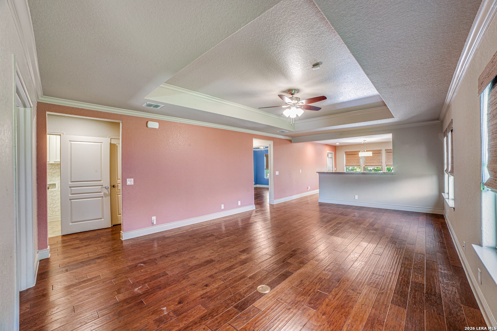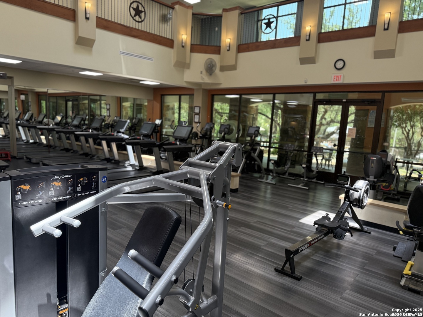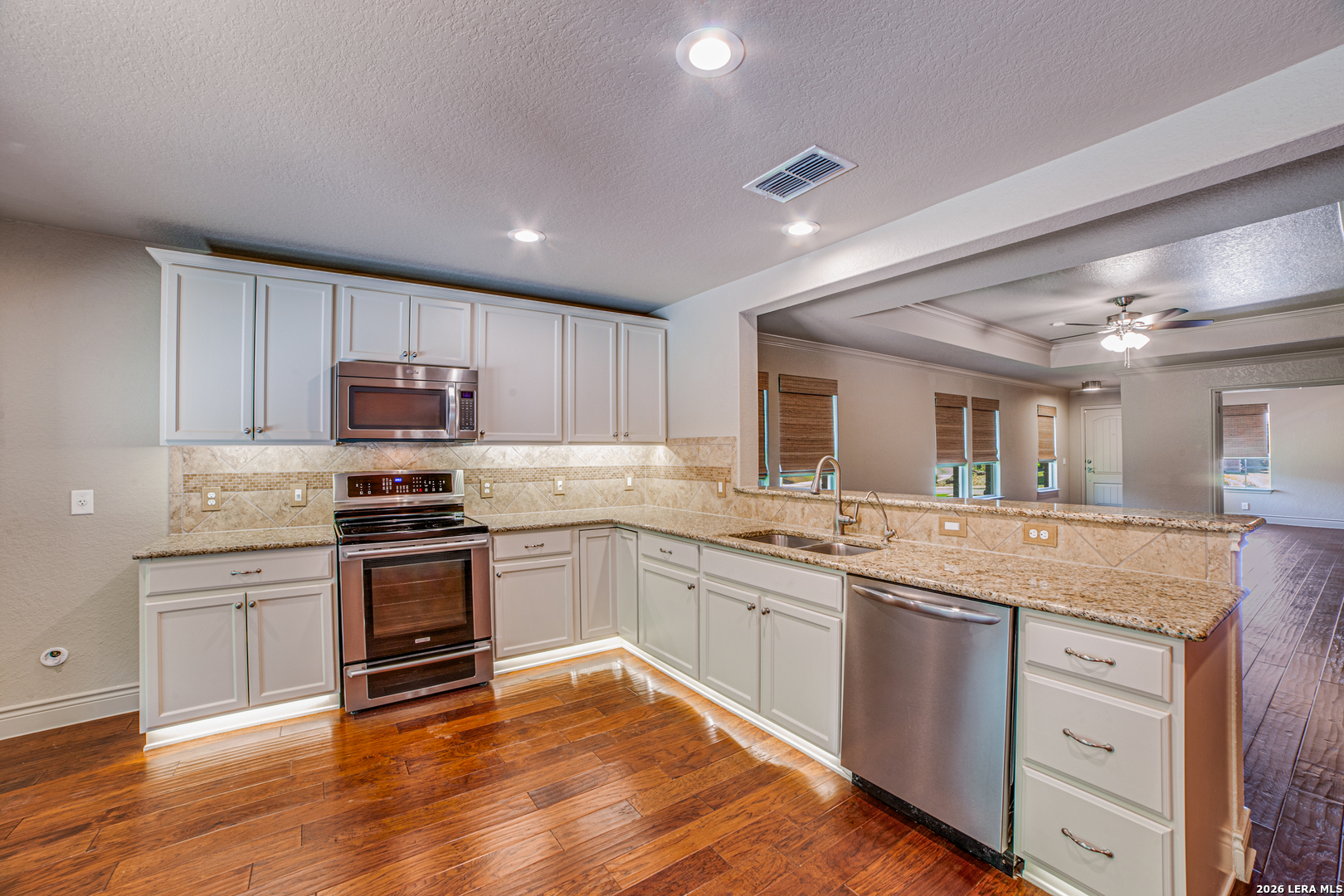 Beautifully single-story home, with plenty of bell and whistles. Located in San Antonio's premier gated Hill Country Retreat by Del Webb 55+ retirement community. This home provides a study/flex room. There is well over 50K in upgrades, which include, Wood floors throughout, upgraded granite, kitchen under-cabinet lighting, upgraded light fixtures, tray ceiling in living room and master bedroom, grab bars both baths, upgraded energy package, 4 sides brick, extended garage, golf cart outlet, full yard irrigation, floor plug, Electrolux Stove, Crown molding throughout, reverse Osmosis, custom back splash, designer wall paper and so much more!! Plus the retirement community is loaded and includes; 28,000 SF Amenity Center, indoor/outdoor swimming pools, tennis and pickle ball court, walking trails, billiards room, ball room, library, hot tub, work out center/gym, indoor walking court, exercise courts, hobby rooms, meeting rooms, areas to relax to visit with family and friends, several individual clubs and plenty to do. You won't want to miss this one. Make your appointment today.
