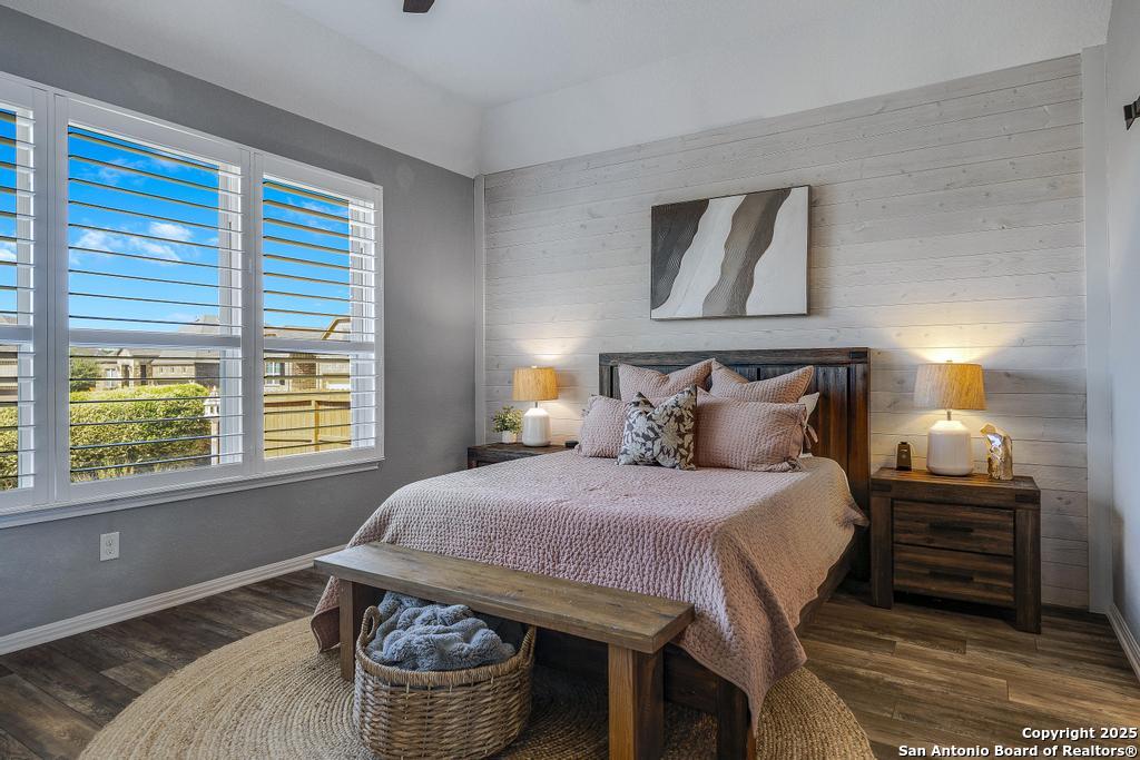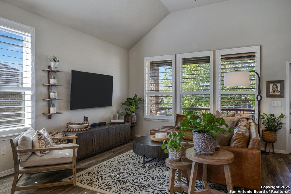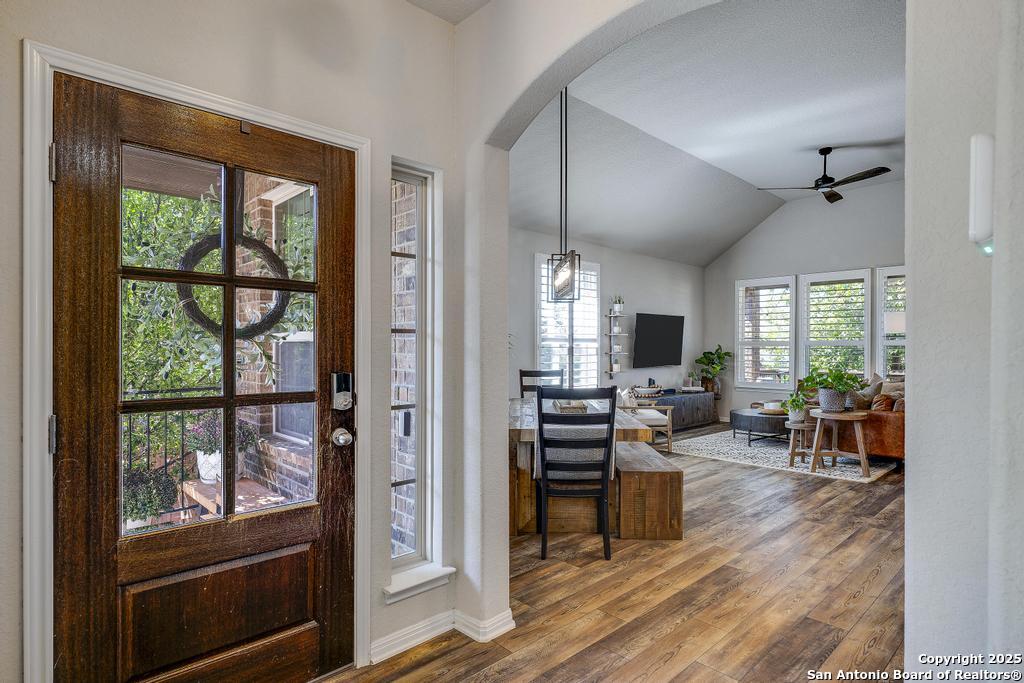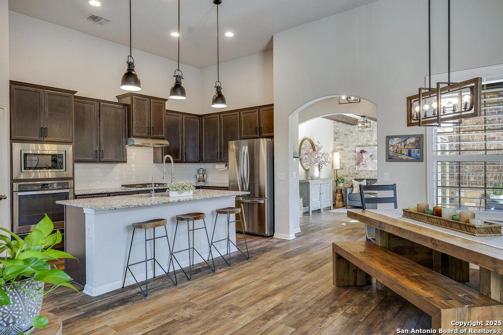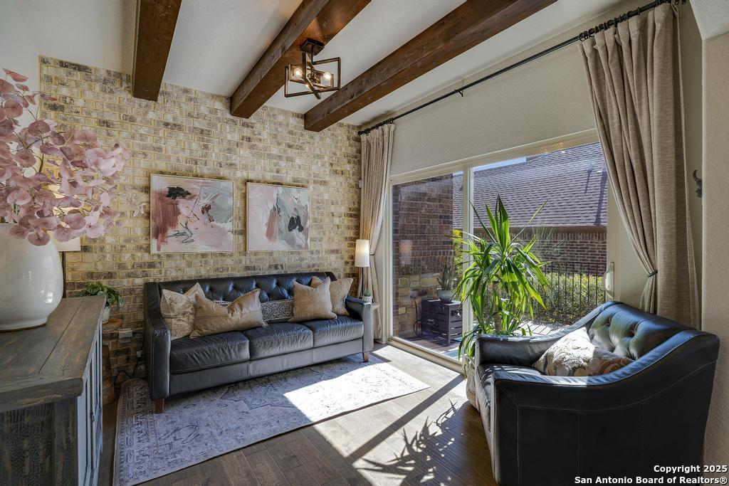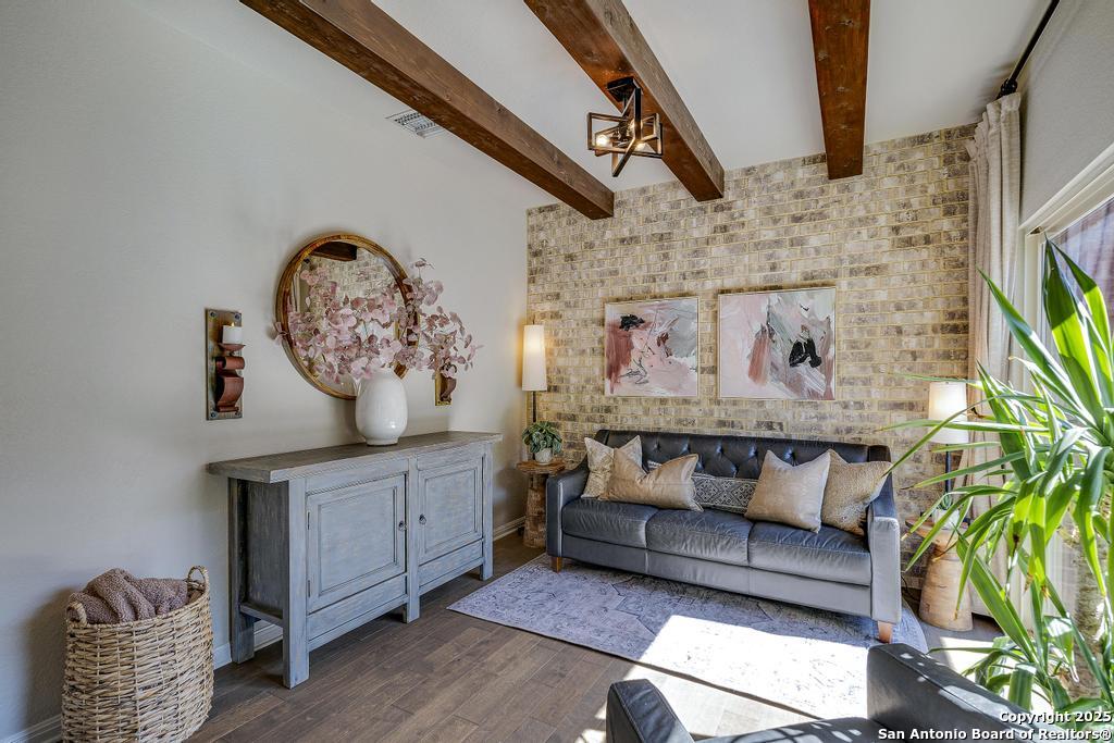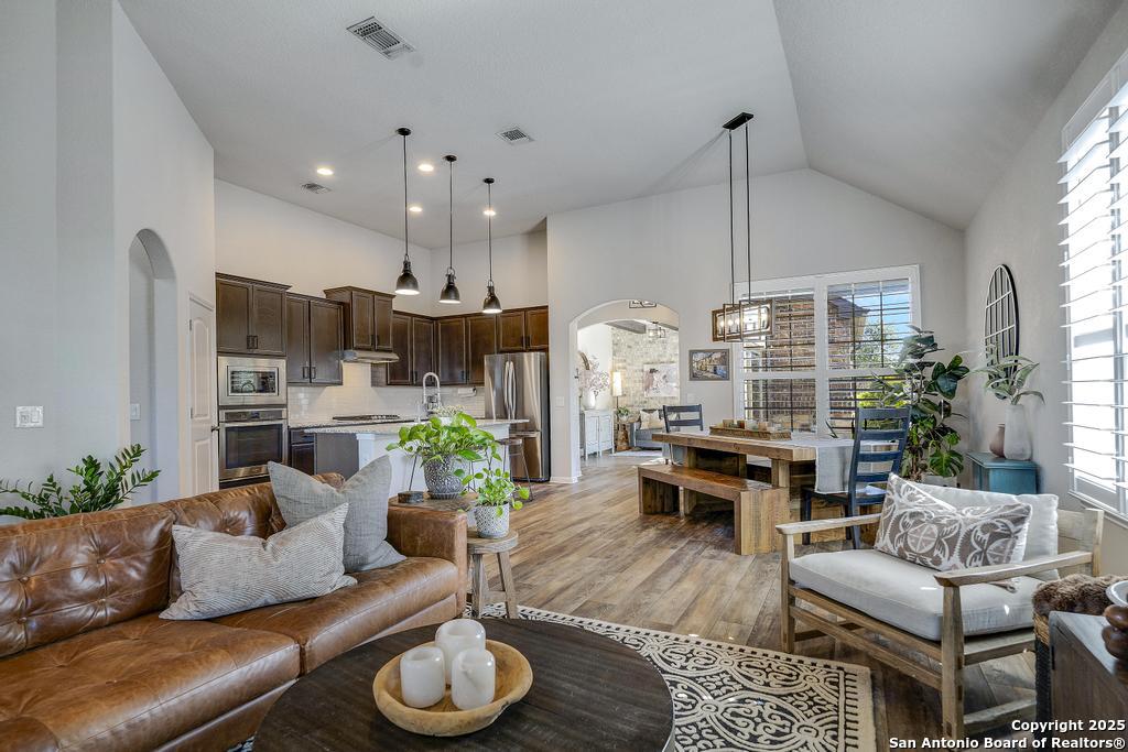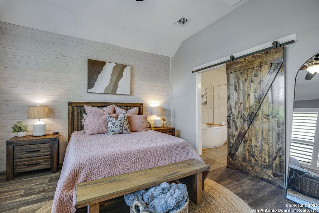Assumable 2.75% VA Loan, 45 day closing available. Located in a small gated community, this former Sitterle model home offers luxury living with over $30K in recent upgrades. A large private front porch and new custom front door welcome you inside to high ceilings, luxury vinyl plank and engineered wood floors throughout. The open living area features a spacious island kitchen with gas cooking, stainless appliances, and updated hardware on custom cabinets. The private primary suite includes barn doors leading to a spa bath with a standalone tub and custom closet. A flexible second living space showcases a brick accent wall and wood beam ceilings. Additional highlights include a mudroom, water softener, alarm system with outdoor cameras, large Trex deck in back, and HOA-maintained front and back landscaping and care.