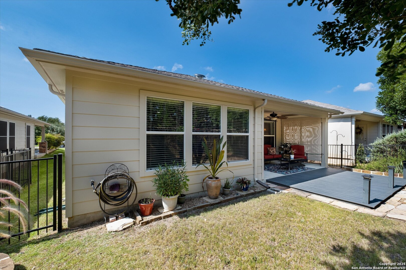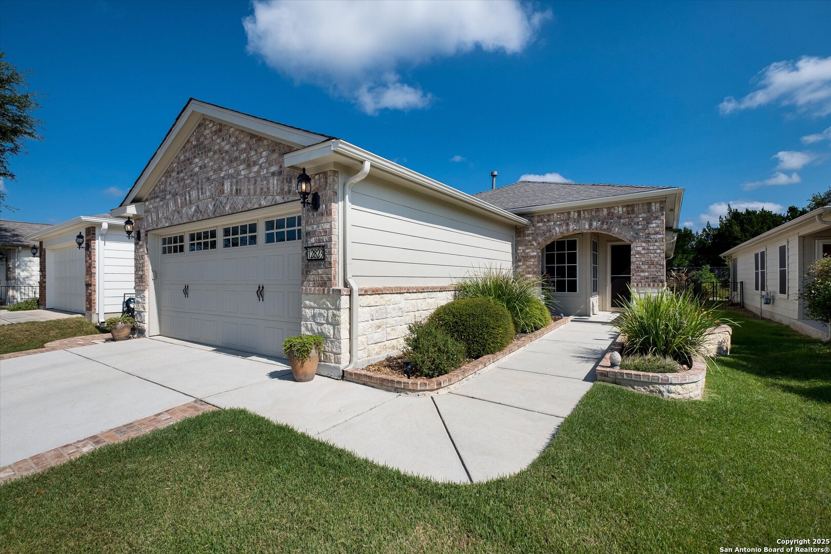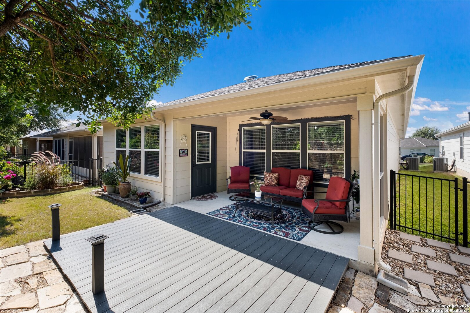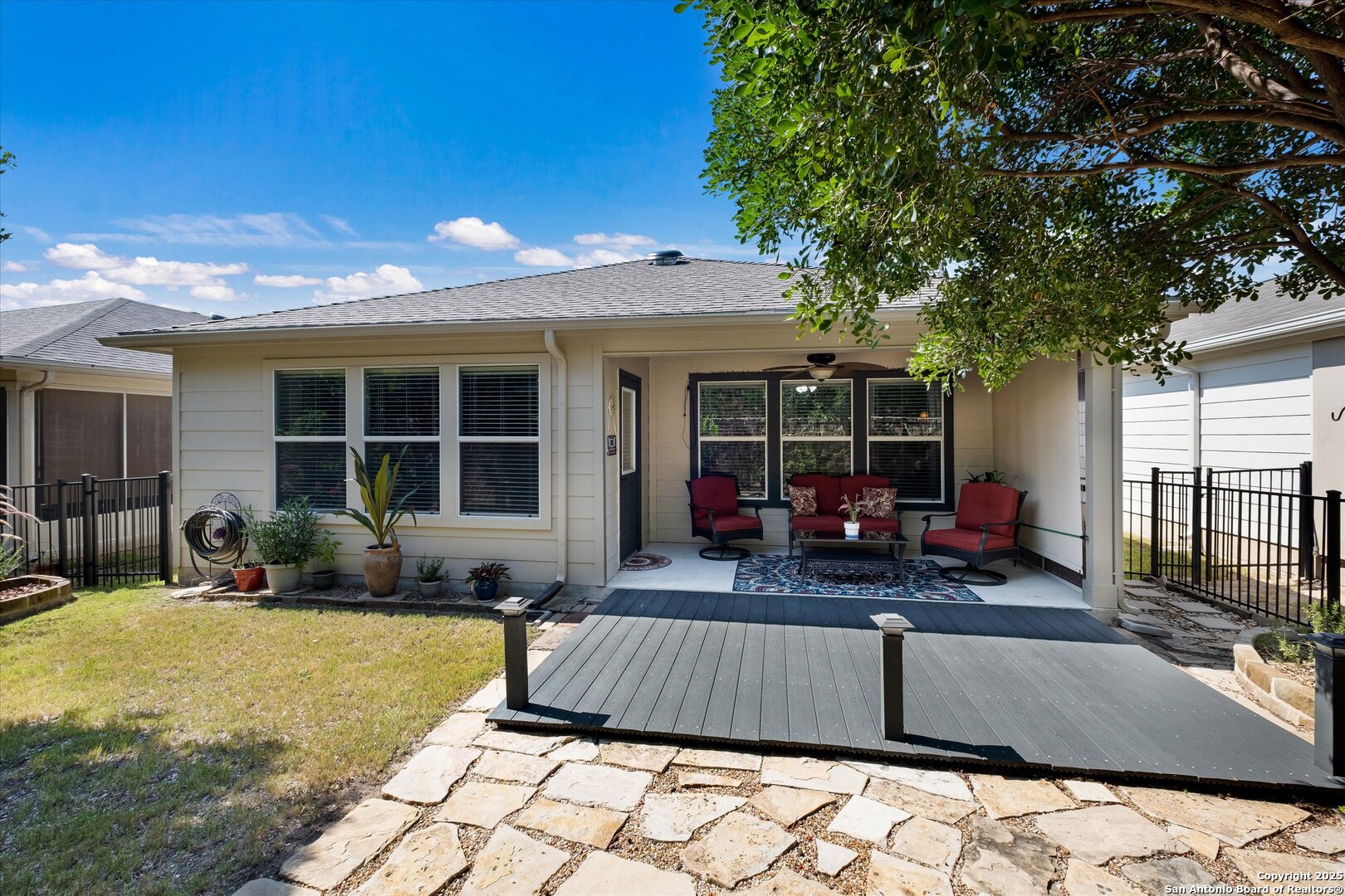 Welcome to Hill Country Retreat, a vibrant 55+ Del Webb community! This thoughtfully designed home features 2BR/2BTH and an additional flex-space currently used as a home office. The open layout is perfect for both relaxing and entertaining, with a spacious living area and elegant tray ceiling, a modern kitchen with gas cooking and granite countertops, and a peaceful primary suite with a walk-in closet and en-suite bath, no carpet throughout! Solar shades offer indoor comfort from the Texas sun. Freshly painted interior and exterior, new roof 2025, newer water heater, all appliances convey! Attached garage has 5 additional feet, with overhead storage and shelving. Enjoy resort-style amenities including a clubhouse, fitness center, indoor and outdoor pools, pickleball and tennis courts, walking trails, and a full calendar of social activities and events. Whether you prefer a quiet morning on the covered patio or lively evenings with new friends, this community offers the perfect balance of comfort, connection, and convenience. Located near shopping, dining, healthcare, and major highways, this home offers everything you need to live your best life!