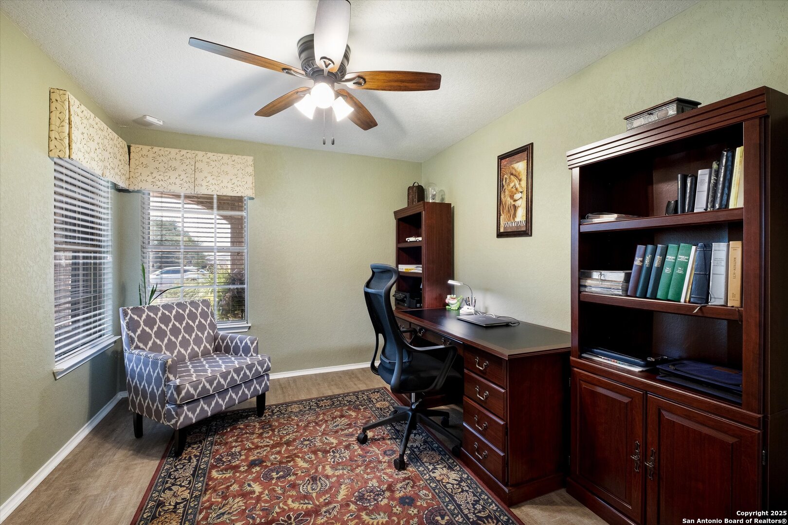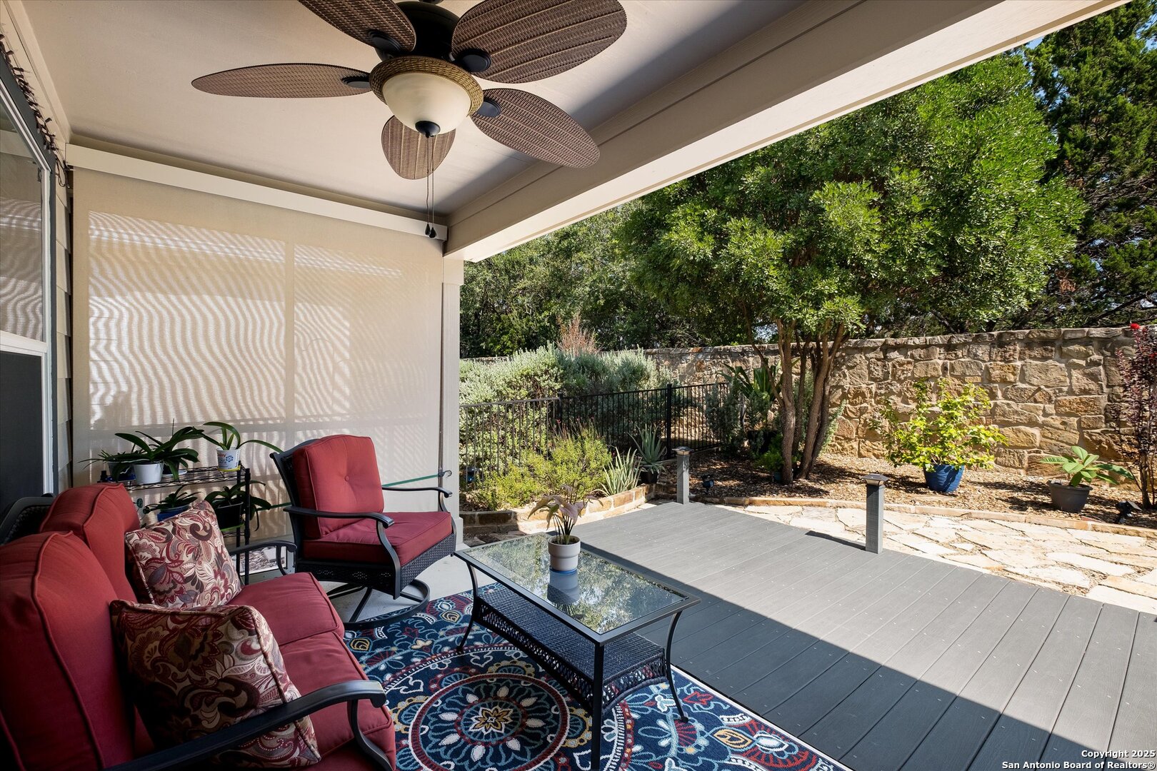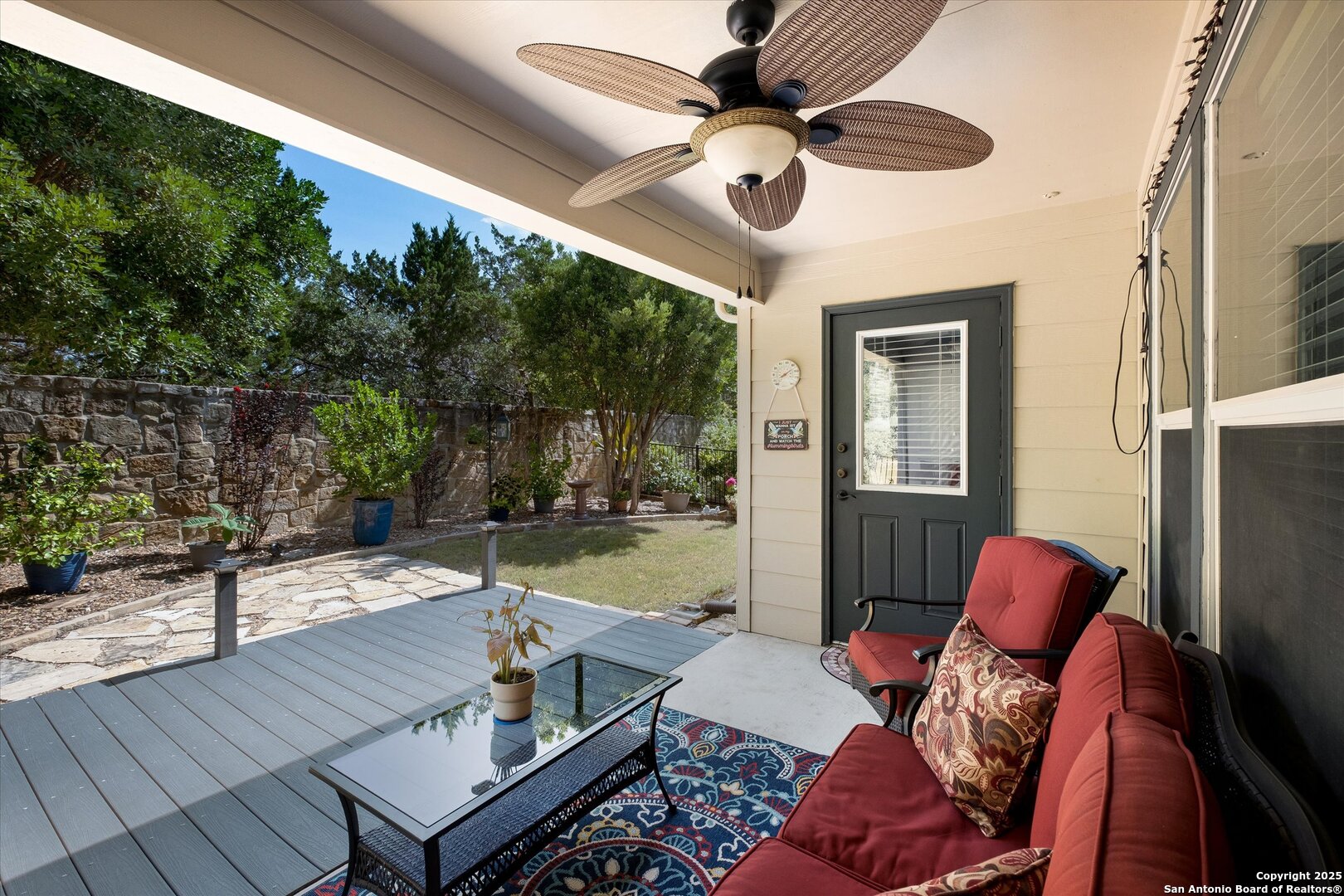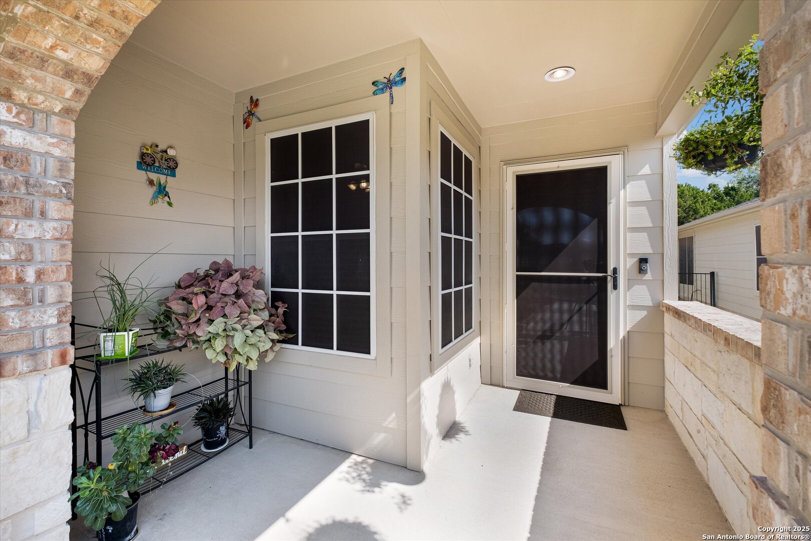 Welcome to Hill Country Retreat, a vibrant 55+ Del Webb community! This thoughtfully designed home features 2BR/2BTH and an additional flex-space currently used as a home office. The open layout is perfect for both relaxing and entertaining, with a spacious living area and elegant tray ceiling, a modern kitchen with gas cooking and granite countertops, and a peaceful primary suite with a walk-in closet and en-suite bath, no carpet throughout! Solar shades offer indoor comfort from the Texas sun. Freshly painted interior and exterior, new roof 2025, newer water heater, all appliances convey! Attached garage has 5 additional feet, with overhead storage and shelving. Enjoy resort-style amenities including a clubhouse, fitness center, indoor and outdoor pools, pickleball and tennis courts, walking trails, and a full calendar of social activities and events. Whether you prefer a quiet morning on the covered patio or lively evenings with new friends, this community offers the perfect balance of comfort, connection, and convenience. Located near shopping, dining, healthcare, and major highways, this home offers everything you need to live your best life!
