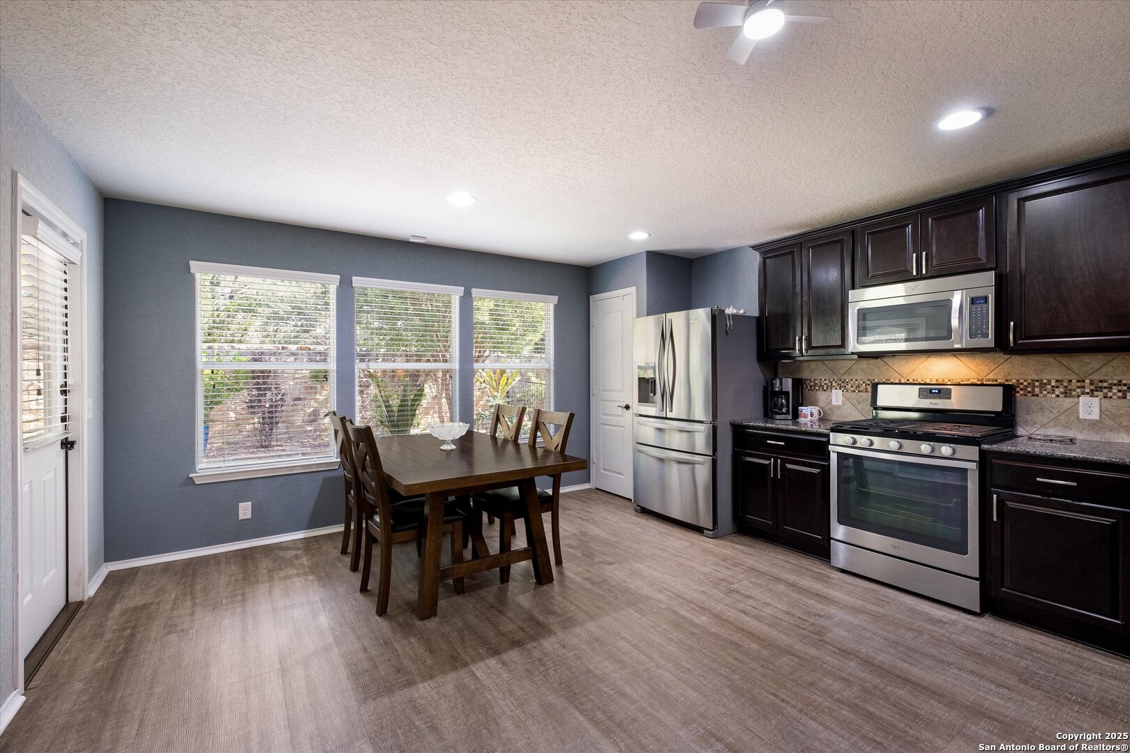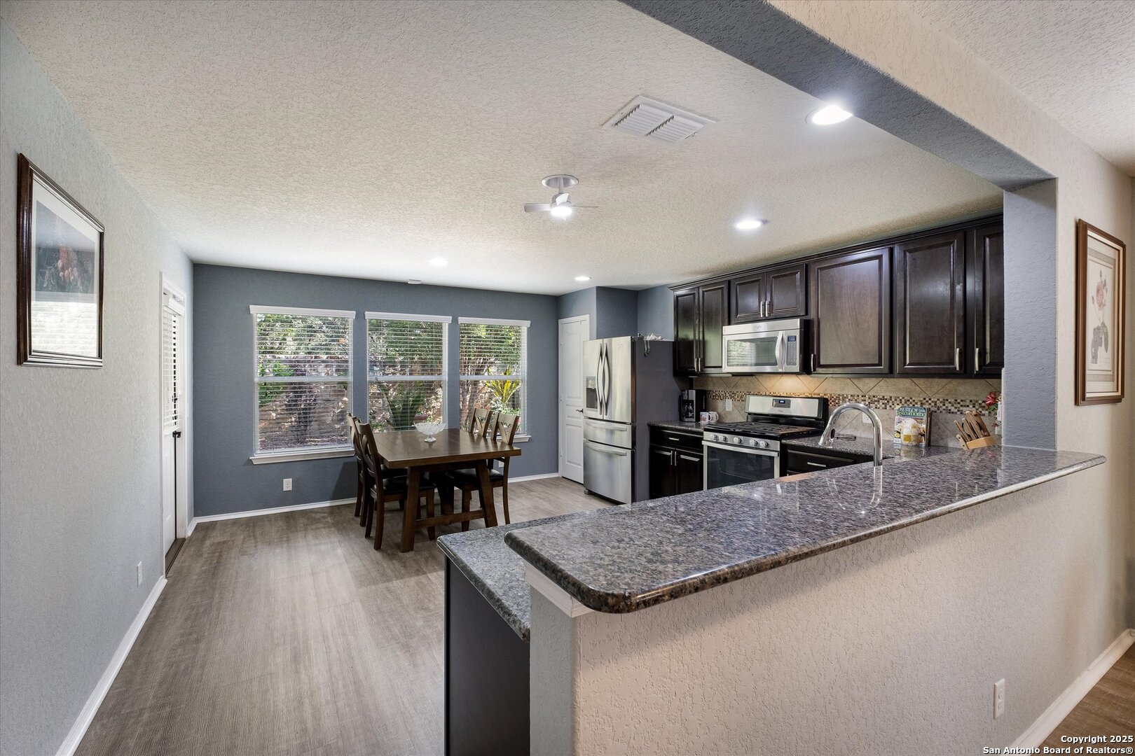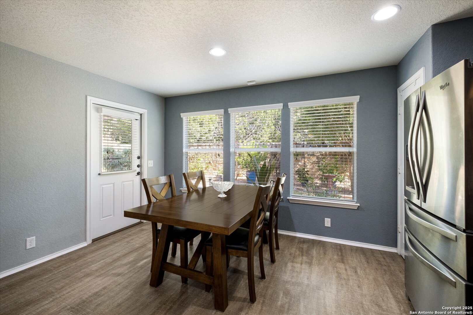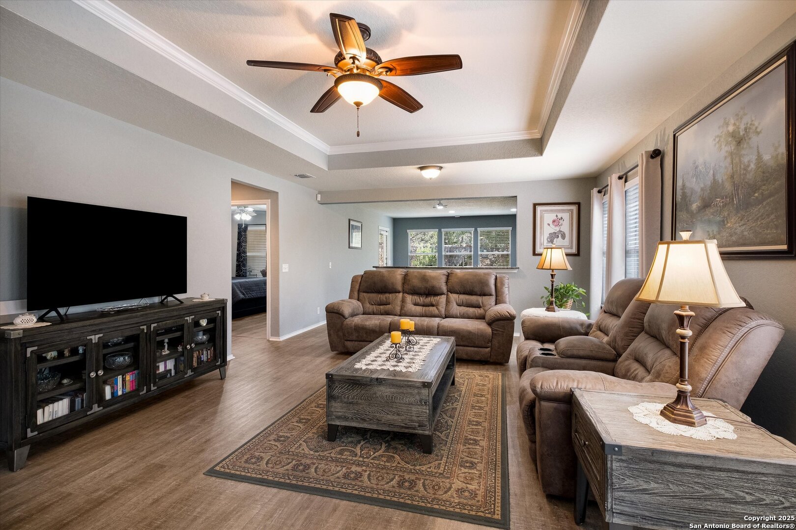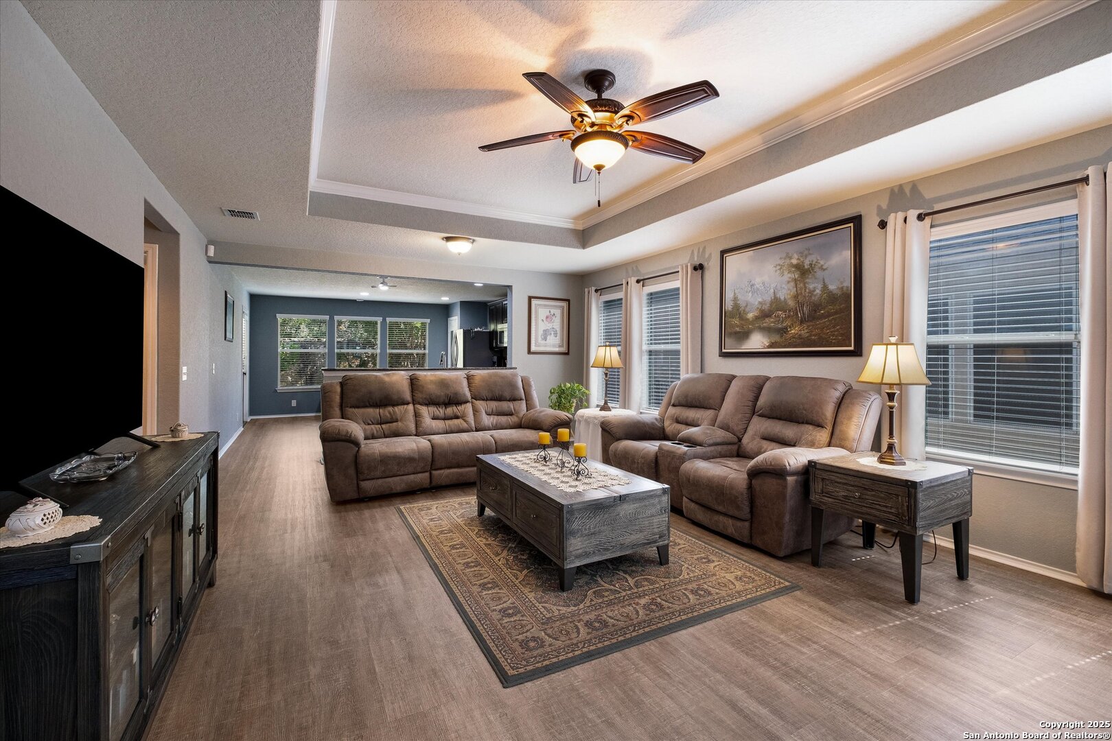 Welcome to Hill Country Retreat, a vibrant 55+ Del Webb community! This thoughtfully designed home features 2BR/2BTH and an additional flex-space currently used as a home office. The open layout is perfect for both relaxing and entertaining, with a spacious living area and elegant tray ceiling, a modern kitchen with gas cooking and granite countertops, and a peaceful primary suite with a walk-in closet and en-suite bath, no carpet throughout! Solar shades offer indoor comfort from the Texas sun. Freshly painted interior and exterior, new roof 2025, newer water heater, all appliances convey! Attached garage has 5 additional feet, with overhead storage and shelving. Enjoy resort-style amenities including a clubhouse, fitness center, indoor and outdoor pools, pickleball and tennis courts, walking trails, and a full calendar of social activities and events. Whether you prefer a quiet morning on the covered patio or lively evenings with new friends, this community offers the perfect balance of comfort, connection, and convenience. Located near shopping, dining, healthcare, and major highways, this home offers everything you need to live your best life!