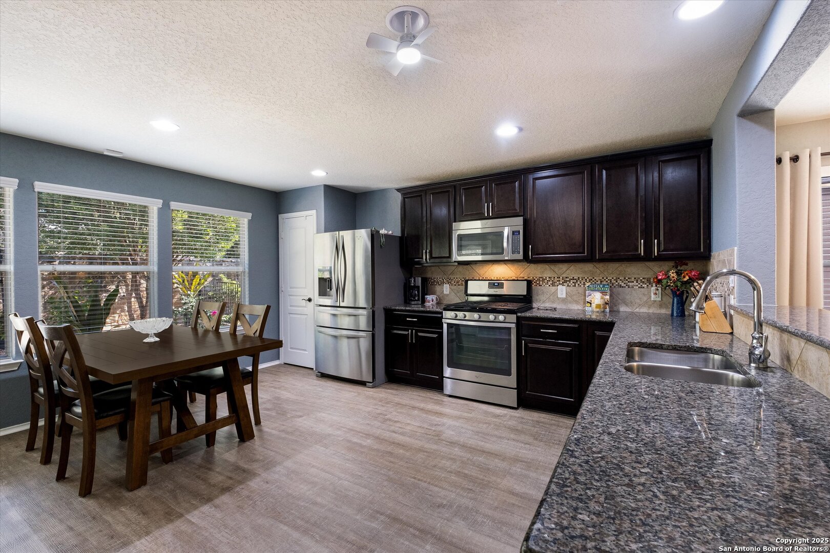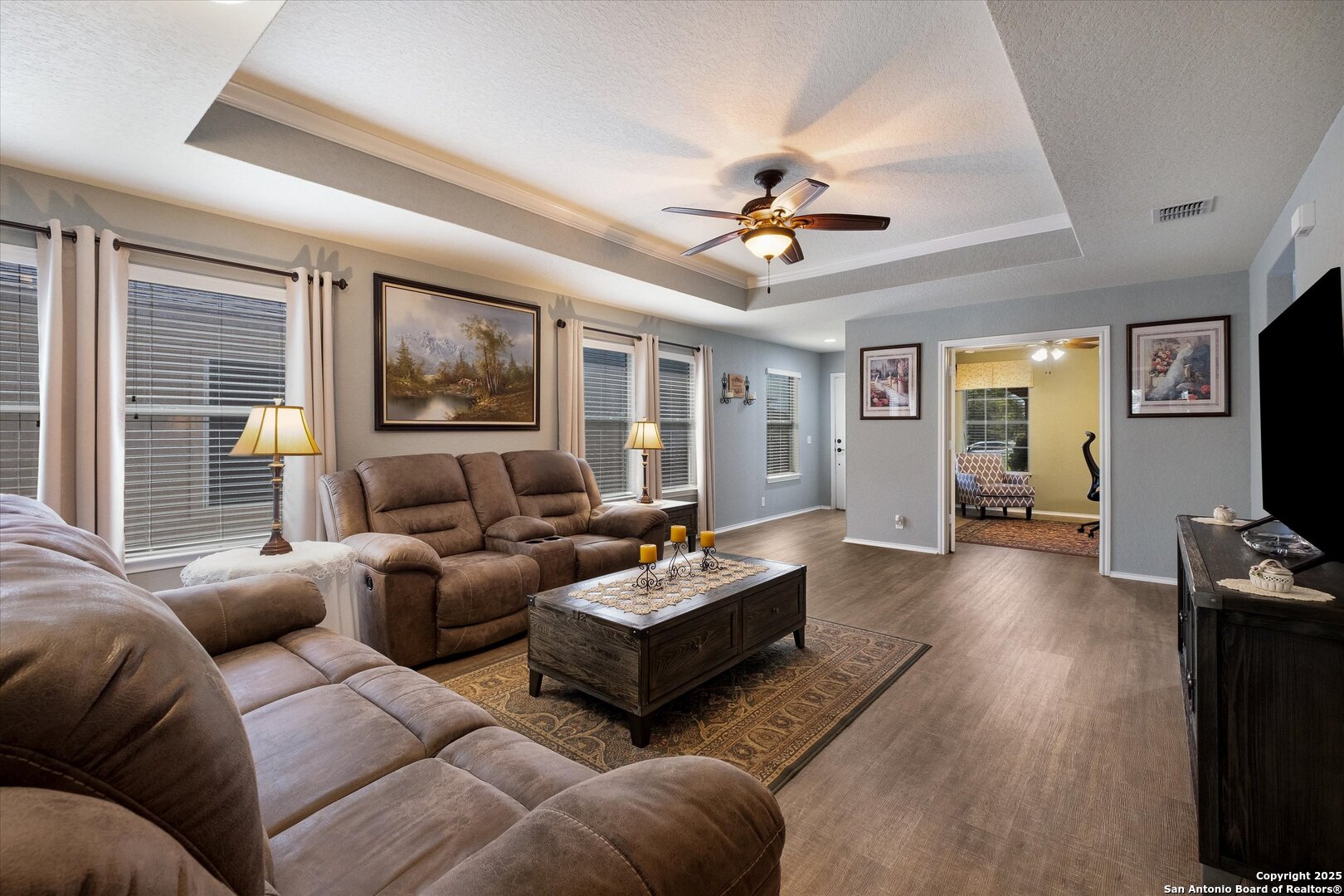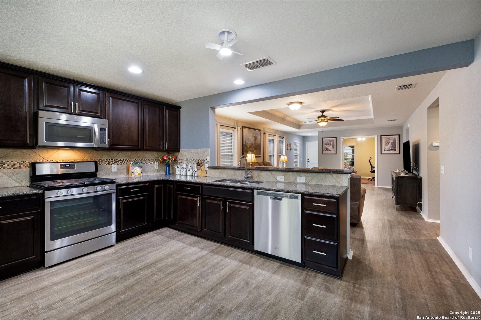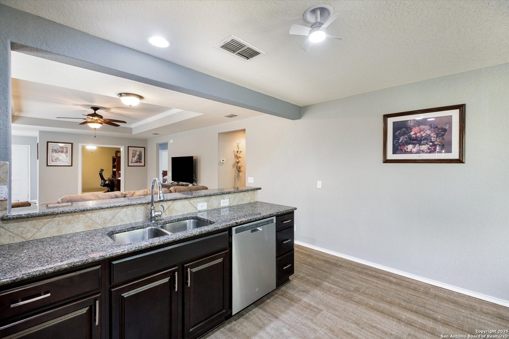 Welcome to Hill Country Retreat, a vibrant 55+ Del Webb community! This thoughtfully designed home features 2BR/2BTH and an additional flex-space currently used as a home office. The open layout is perfect for both relaxing and entertaining, with a spacious living area and elegant tray ceiling, a modern kitchen with gas cooking and granite countertops, and a peaceful primary suite with a walk-in closet and en-suite bath, no carpet throughout! Solar shades offer indoor comfort from the Texas sun. Freshly painted interior and exterior, new roof 2025, newer water heater, all appliances convey! Attached garage has 5 additional feet, with overhead storage and shelving. Enjoy resort-style amenities including a clubhouse, fitness center, indoor and outdoor pools, pickleball and tennis courts, walking trails, and a full calendar of social activities and events. Whether you prefer a quiet morning on the covered patio or lively evenings with new friends, this community offers the perfect balance of comfort, connection, and convenience. Located near shopping, dining, healthcare, and major highways, this home offers everything you need to live your best life!
