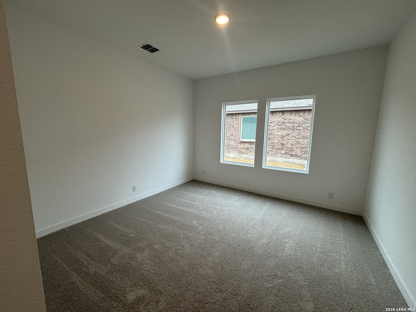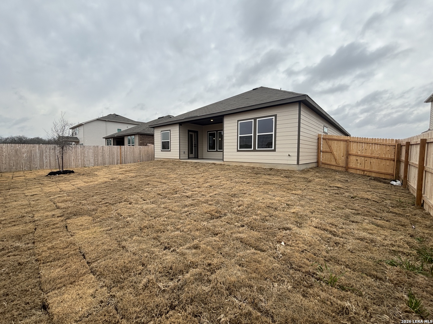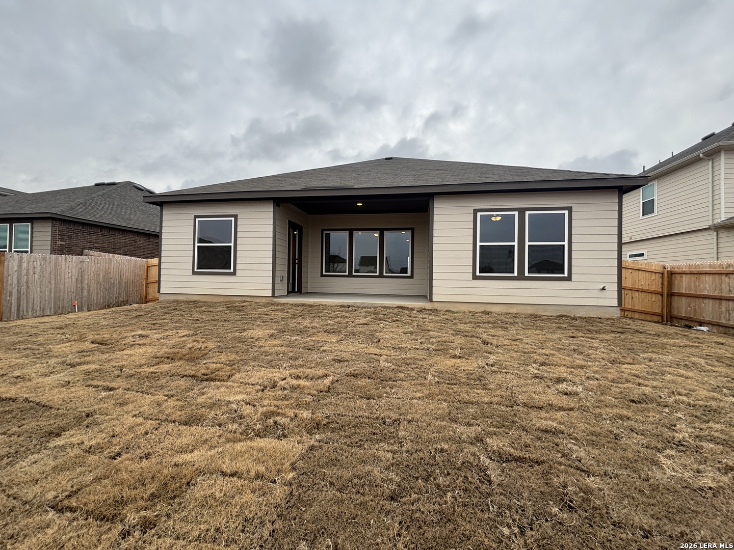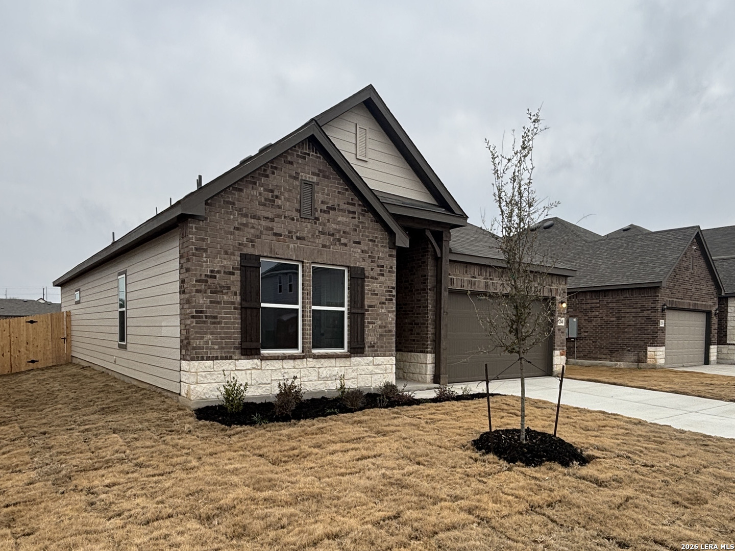 Charming one story home with gourmet kitchen featuring quartz countertops, upgraded cabinets, and a pantry. Open and spacious family room with large windows that look out onto the backyard. No direct back neighbors. Secluded primary suite features a private bath with an oversized shower, double vanities, and a walk-in closet. Two secondary bedrooms with a shared bath. Covered patio ideal for outdoor relaxation. Full landscaping package with a sprinkler system. This home is part of our Serene Collection - designed to bring balance, calm, and open space into everyday life. Muted earth tones and natural textures work together to create rooms that breathe and moments that linger. Serene is about slowing down, soaking in the quiet, and making space for what truly matters, one peaceful moment at a time. This home is in Saddlebrook Ranch, a master-planned community in Schertz, offering easy access to I-35, shopping, dining, Randolph AFB, a pool, playground, and top-rated schools.