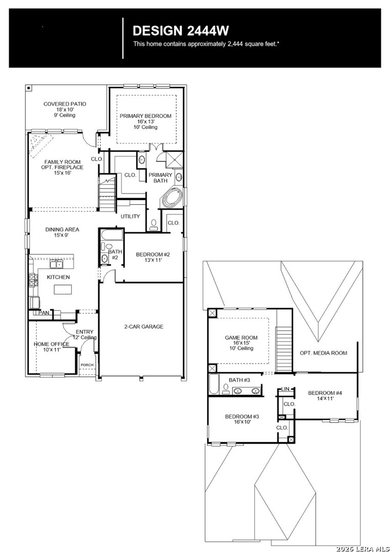 Welcoming entry framed by home office with French door entry. Island kitchen features a built-in seating space, a 5-burner gas cooktop, and a large walk-in pantry. Family room with three large windows extends to the dining area. Private primary suite with three large windows. Primary bathroom offers a French door entry, dual vanities, garden tub, separate glass enclosed shower and a large walk-in closet. Secondary bedroom offers a walk-in closet and a full bathroom. Second floor hosts a large game room and secondary bedrooms. Utility room. Covered backyard patio. Two-car garage.