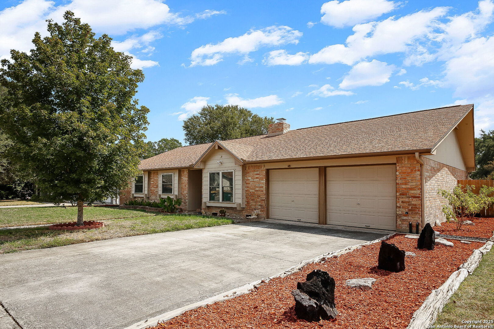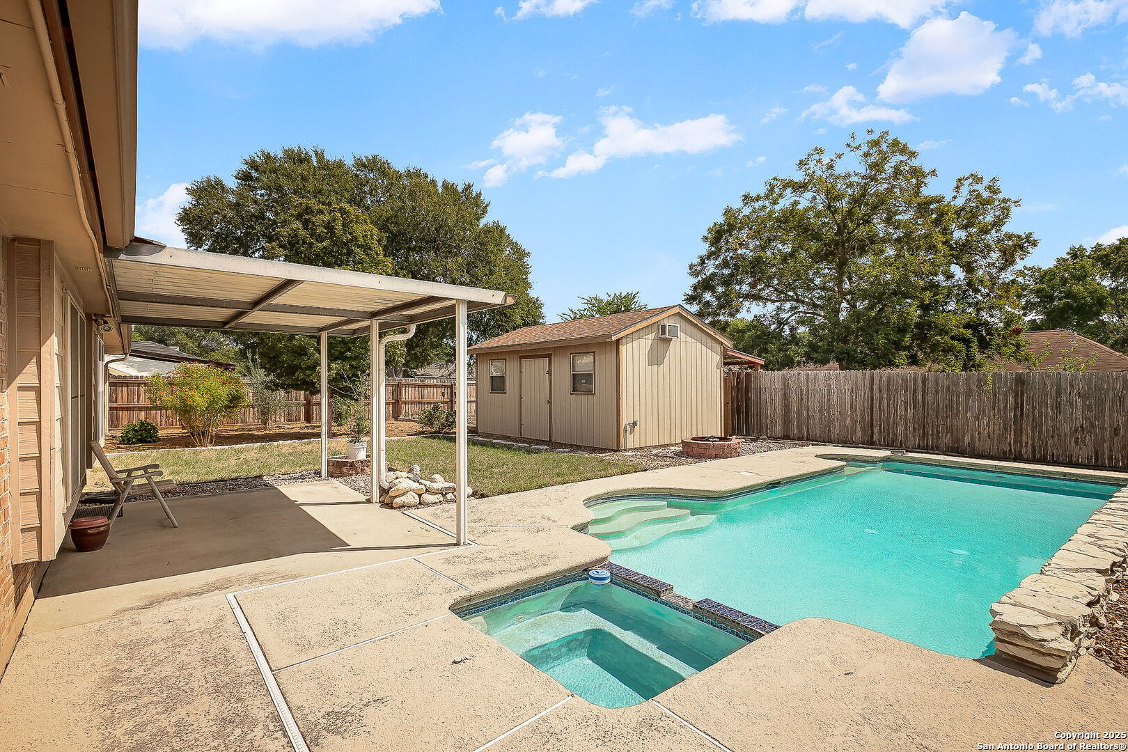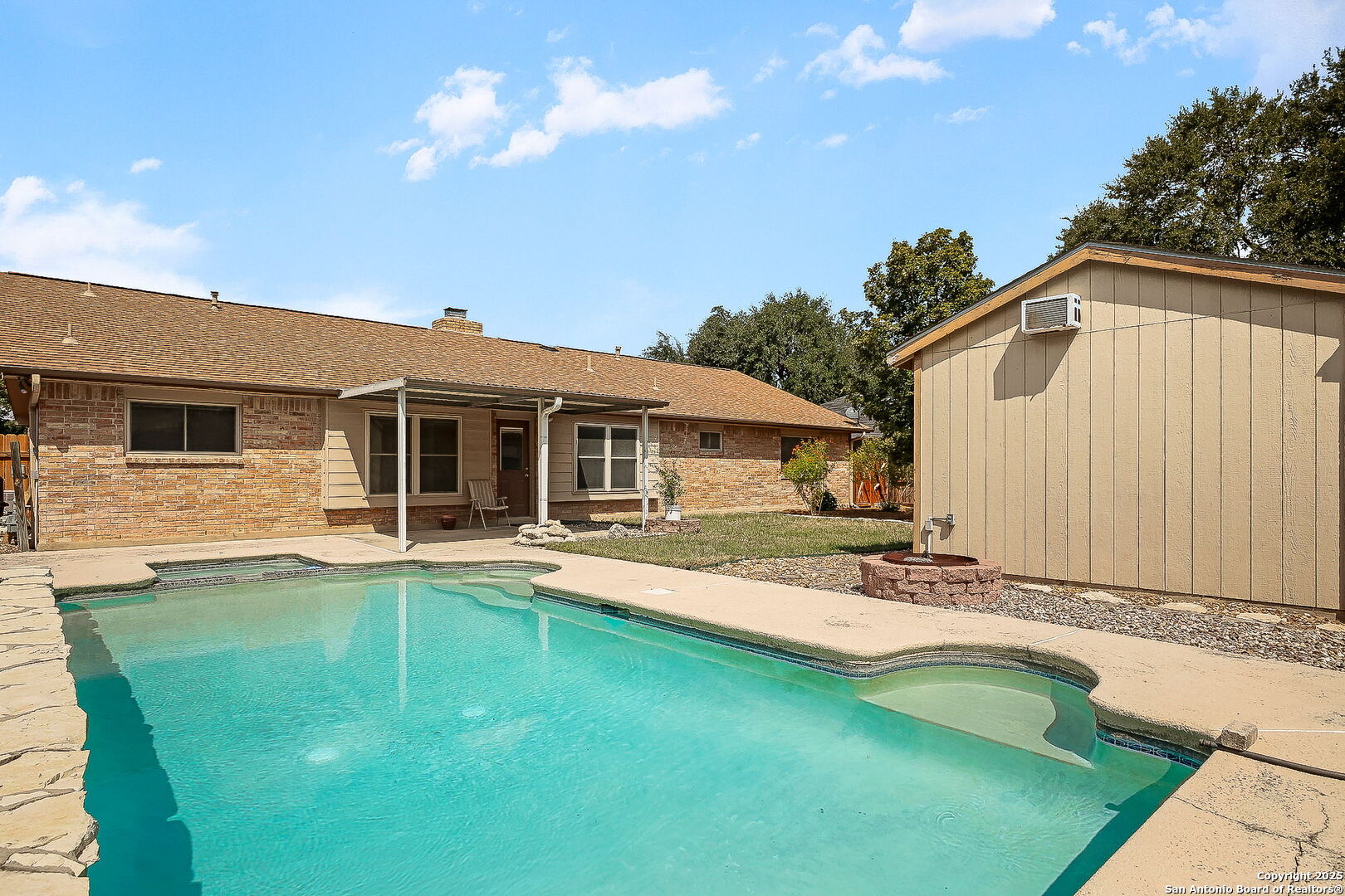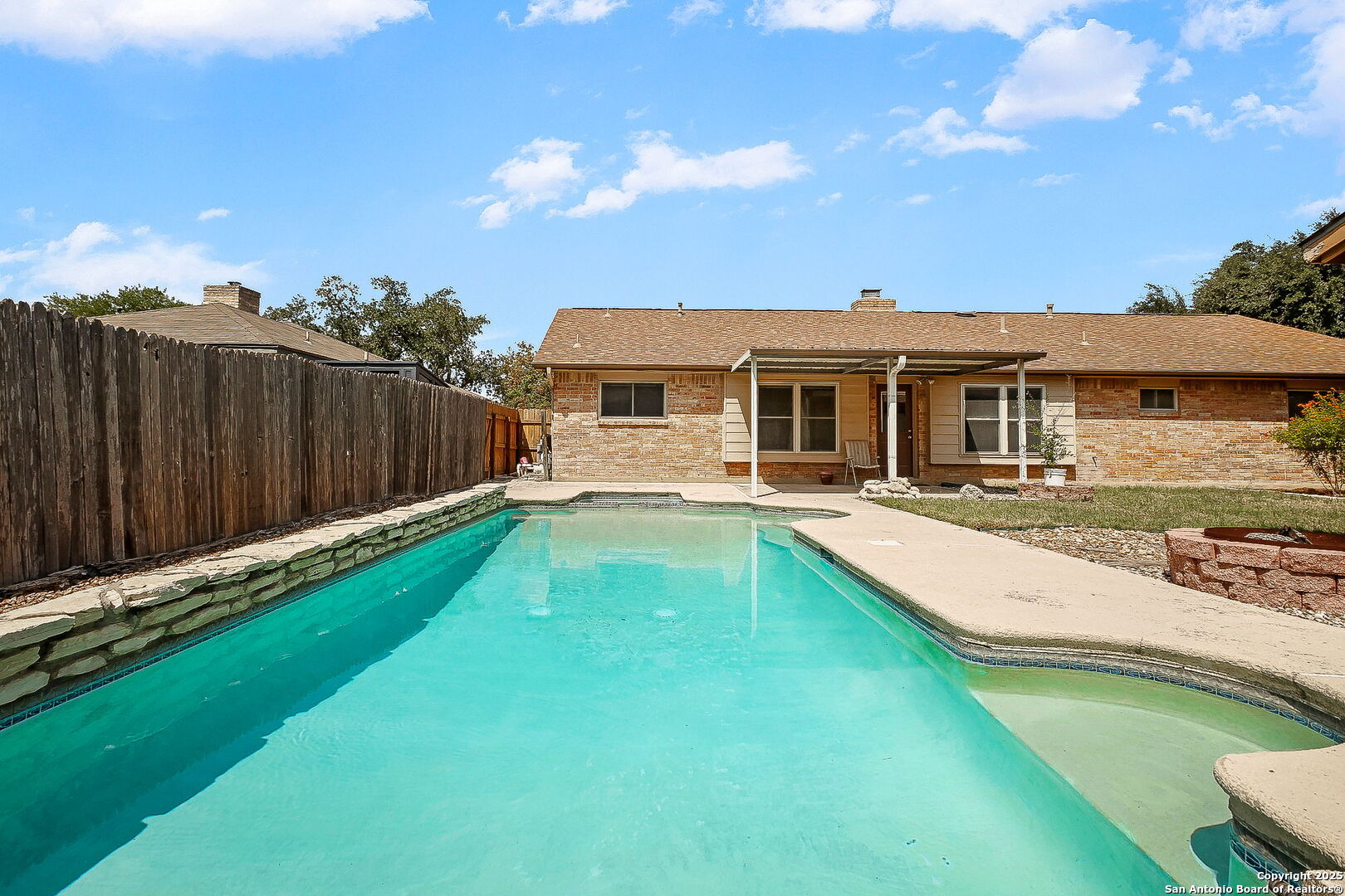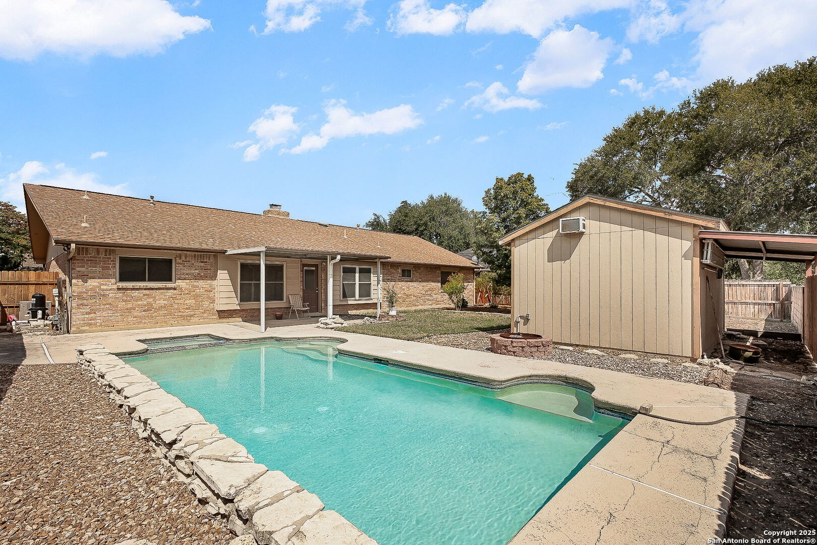 This inviting all-brick 3-bedroom, 2-bath home offers a perfect blend of comfort, character, and outdoor living! The living room features a beautiful see-through brick fireplace with glass doors and flows into the dining area with elegant custom built-in cabinetry. The remodeled kitchen showcases Corian countertops, a new sink, and refinished cabinets. Enjoy durable ceramic tile flooring throughout the common areas. The spacious primary suite includes a private flex room ideal for a nursery, home office, or oversized closet. Step outside to your backyard retreat featuring an in-ground pool, covered patio, fire pit, and a 200 SF insulated shed with AC - perfect for a workshop, studio, or storage. There's also space for a vegetable garden and herb beds, with extra hose bibs conveniently tied into the sprinkler system. A new gas water heater was installed in June 2025. Refrigerator, washer, gas dryer, and water filtration system are included with the sale. Pre-wired for an ADT security system. Located just down the street from Meadow Oaks Park, the area's largest park west of 1604, offering a playground, basketball court, pavilion with BBQ grill, and more. Schedule your private tour today and experience this beautifully maintained home for yourself!