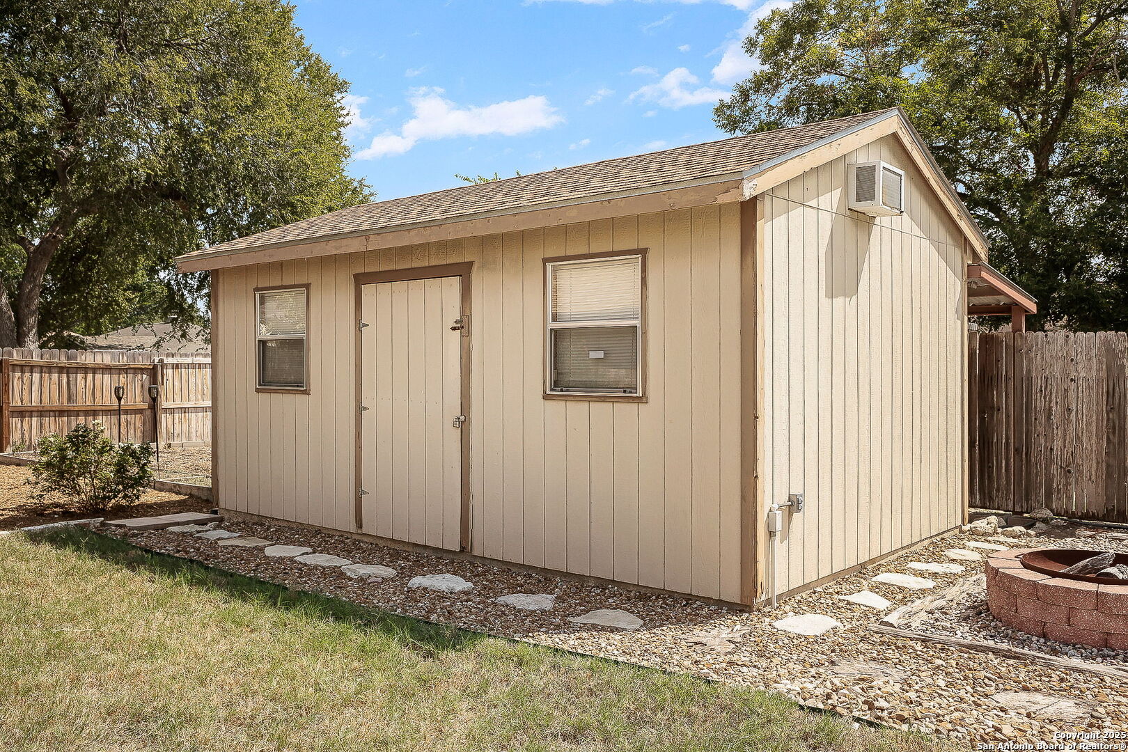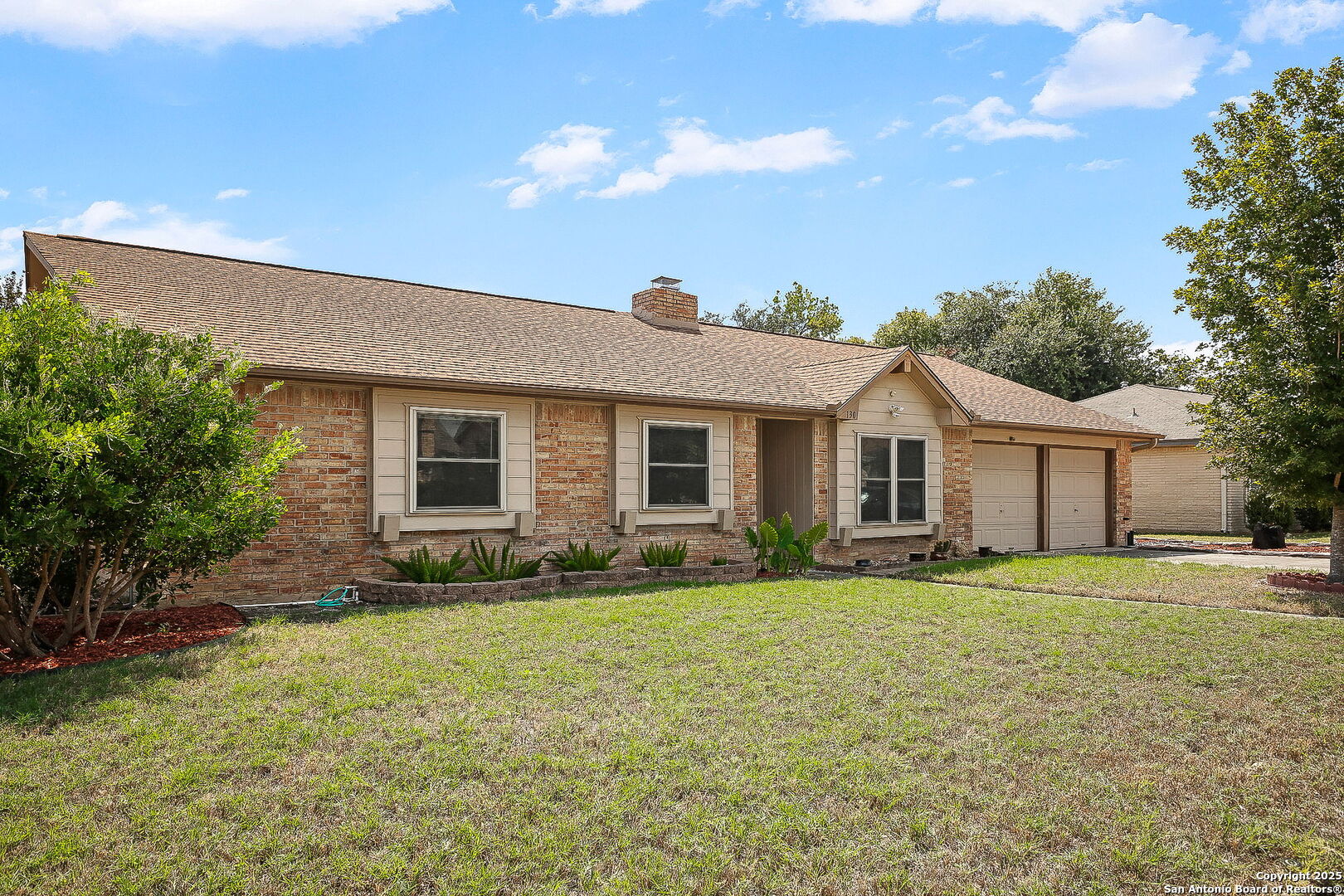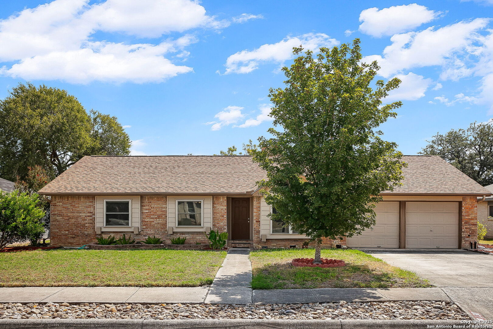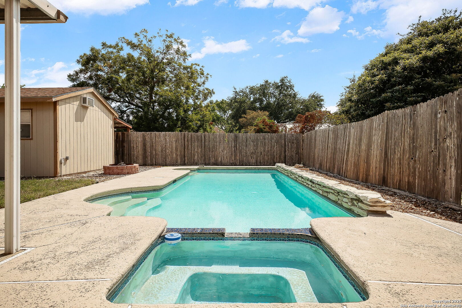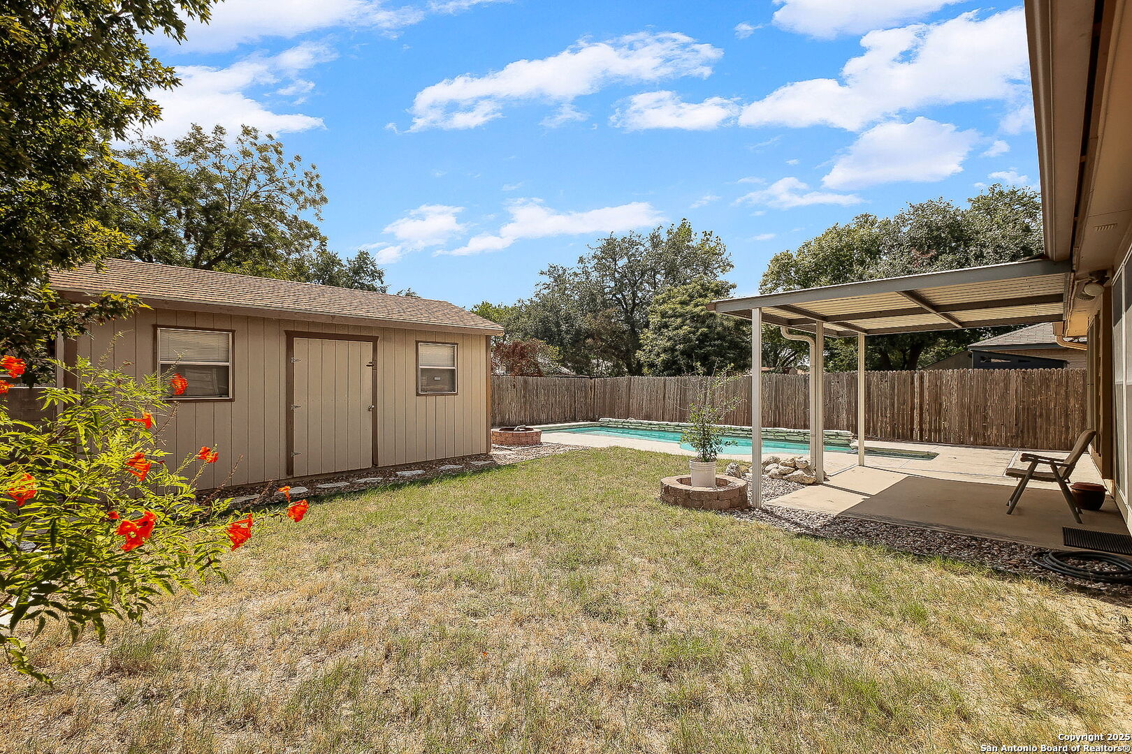 This inviting all-brick 3-bedroom, 2-bath home offers a perfect blend of comfort, character, and outdoor living! The living room features a beautiful see-through brick fireplace with glass doors and flows into the dining area with elegant custom built-in cabinetry. The remodeled kitchen showcases Corian countertops, a new sink, and refinished cabinets. Enjoy durable ceramic tile flooring throughout the common areas. The spacious primary suite includes a private flex room ideal for a nursery, home office, or oversized closet. Step outside to your backyard retreat featuring an in-ground pool, covered patio, fire pit, and a 200 SF insulated shed with AC - perfect for a workshop, studio, or storage. There's also space for a vegetable garden and herb beds, with extra hose bibs conveniently tied into the sprinkler system. A new gas water heater was installed in June 2025. Refrigerator, washer, gas dryer, and water filtration system are included with the sale. Pre-wired for an ADT security system. Located just down the street from Meadow Oaks Park, the area's largest park west of 1604, offering a playground, basketball court, pavilion with BBQ grill, and more. Schedule your private tour today and experience this beautifully maintained home for yourself!