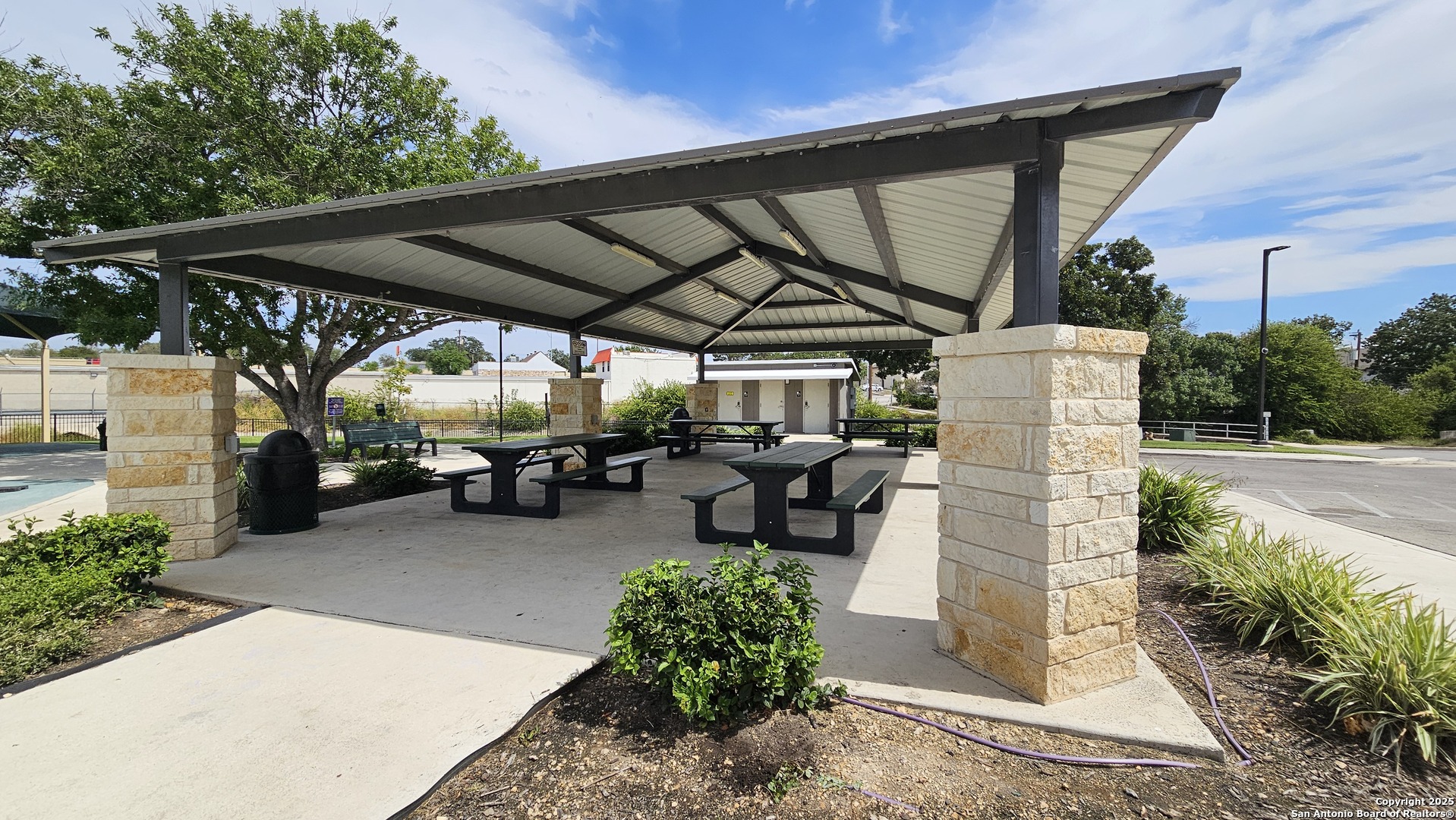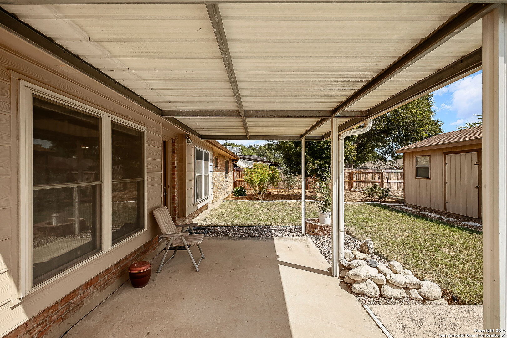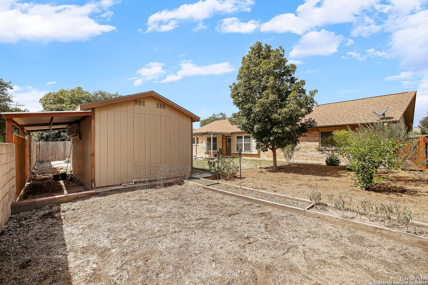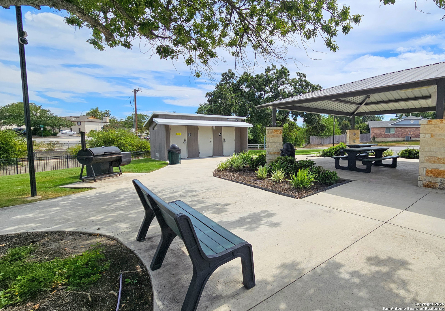 This inviting all-brick 3-bedroom, 2-bath home offers a perfect blend of comfort, character, and outdoor living! The living room features a beautiful see-through brick fireplace with glass doors and flows into the dining area with elegant custom built-in cabinetry. The remodeled kitchen showcases Corian countertops, a new sink, and refinished cabinets. Enjoy durable ceramic tile flooring throughout the common areas. The spacious primary suite includes a private flex room ideal for a nursery, home office, or oversized closet. Step outside to your backyard retreat featuring an in-ground pool, covered patio, fire pit, and a 200 SF insulated shed with AC - perfect for a workshop, studio, or storage. There's also space for a vegetable garden and herb beds, with extra hose bibs conveniently tied into the sprinkler system. A new gas water heater was installed in June 2025. Refrigerator, washer, gas dryer, and water filtration system are included with the sale. Pre-wired for an ADT security system. Located just down the street from Meadow Oaks Park, the area's largest park west of 1604, offering a playground, basketball court, pavilion with BBQ grill, and more. Schedule your private tour today and experience this beautifully maintained home for yourself!