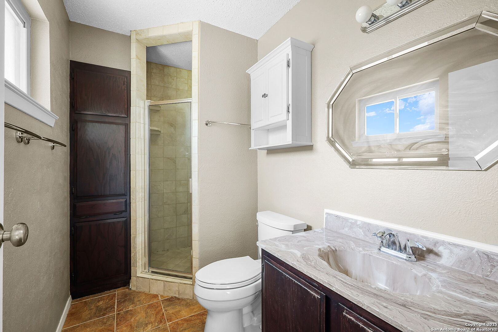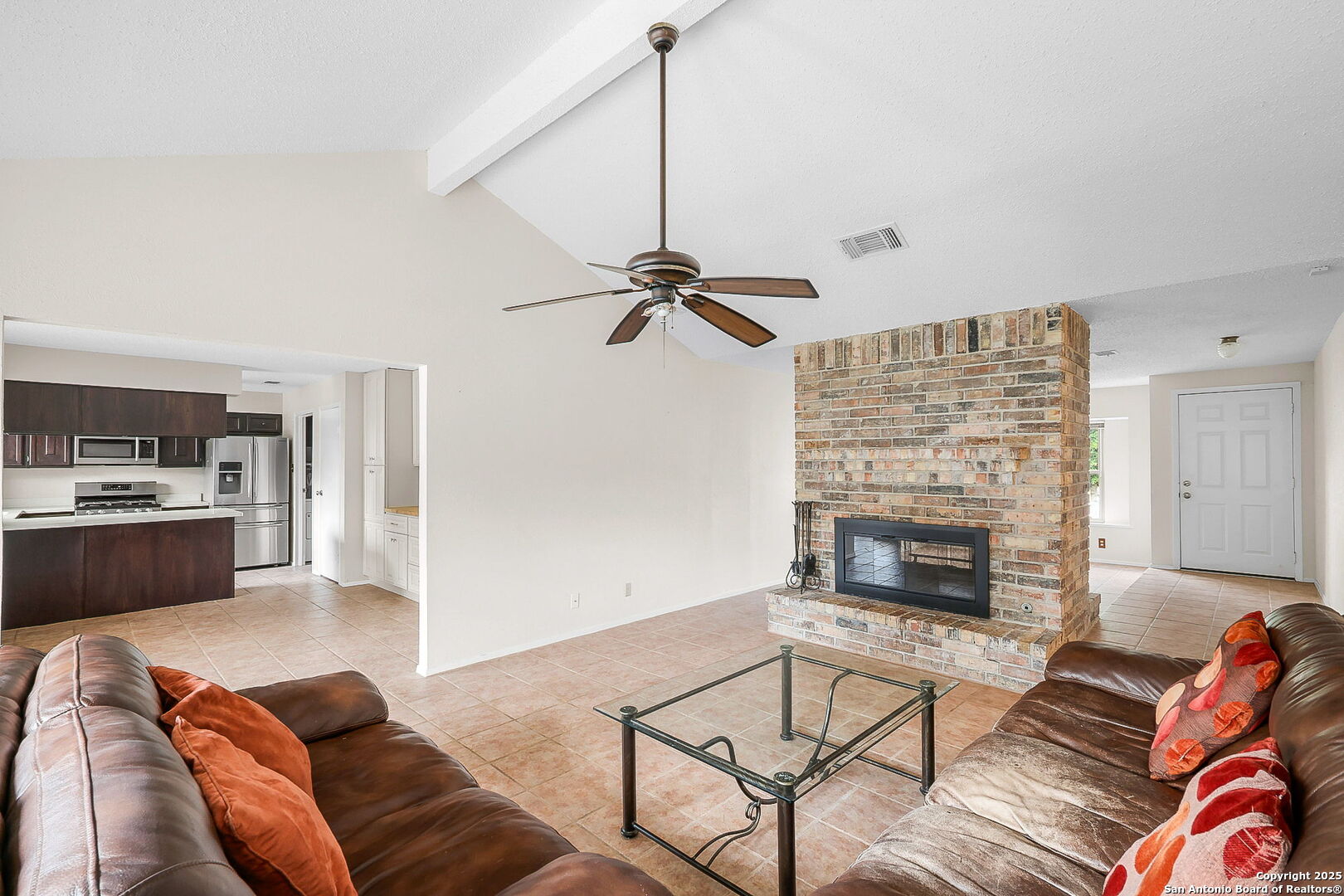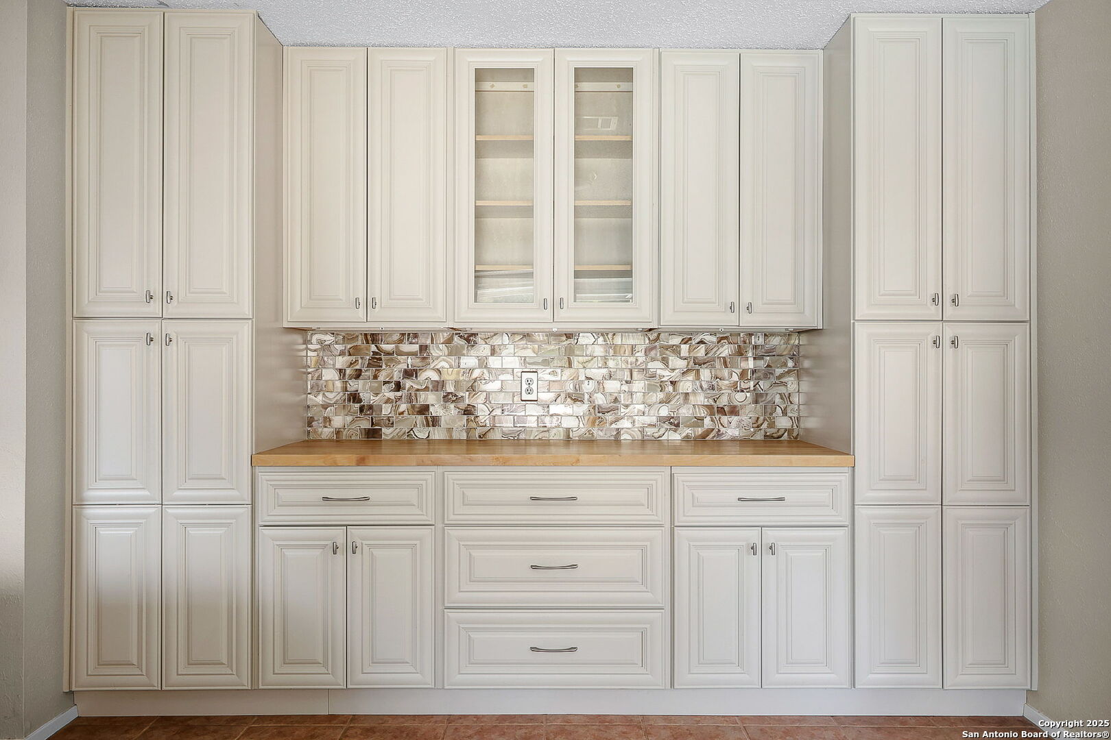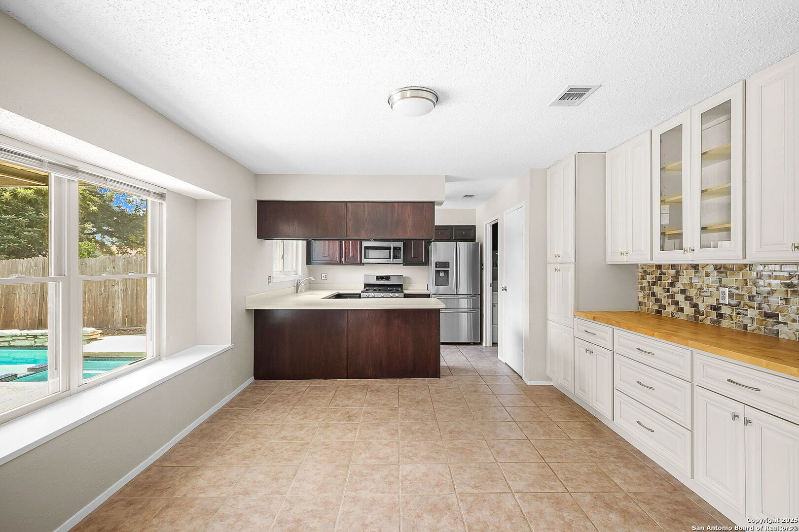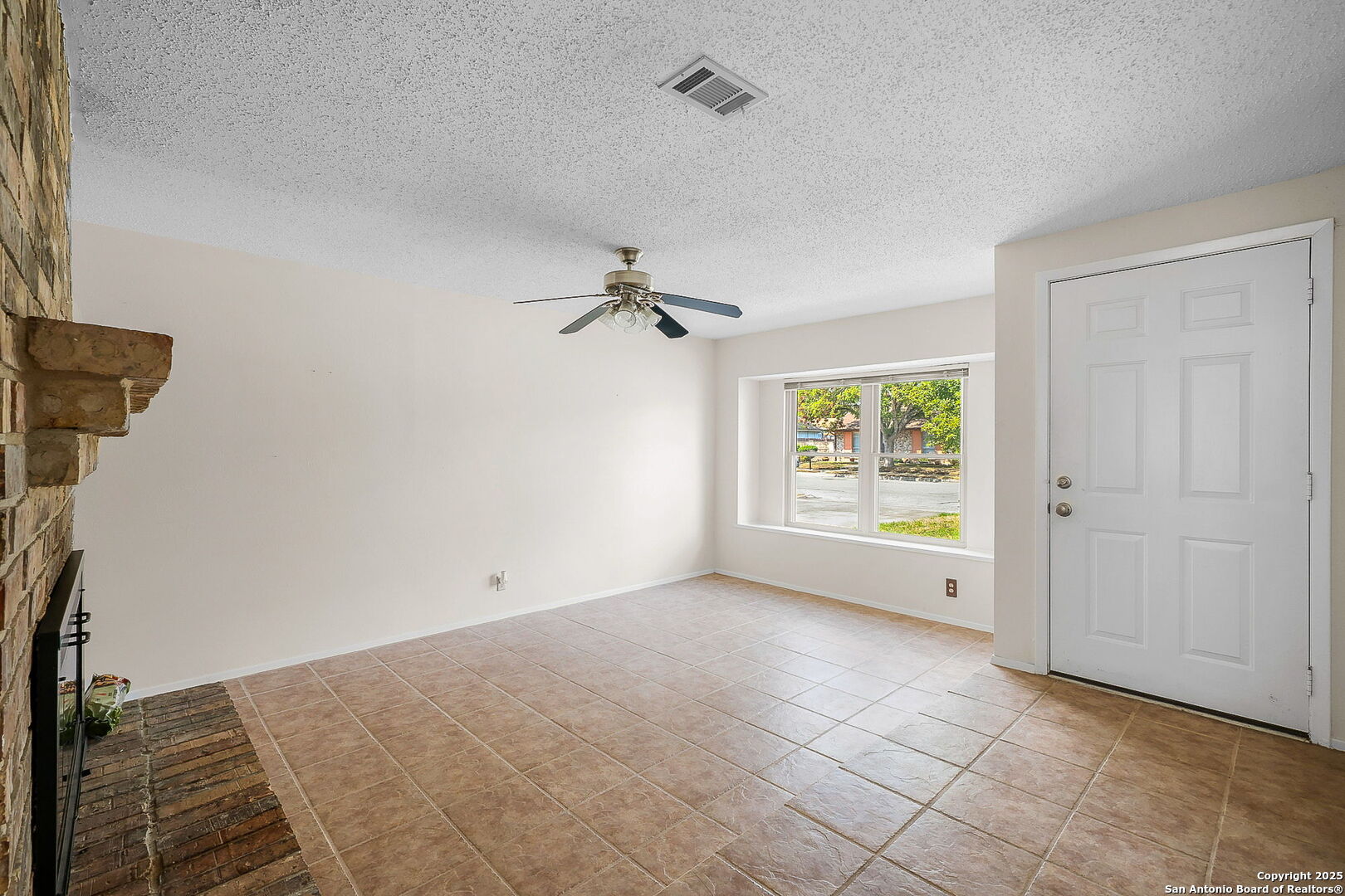 This inviting all-brick 3-bedroom, 2-bath home offers a perfect blend of comfort, character, and outdoor living! The living room features a beautiful see-through brick fireplace with glass doors and flows into the dining area with elegant custom built-in cabinetry. The remodeled kitchen showcases Corian countertops, a new sink, and refinished cabinets. Enjoy durable ceramic tile flooring throughout the common areas. The spacious primary suite includes a private flex room ideal for a nursery, home office, or oversized closet. Step outside to your backyard retreat featuring an in-ground pool, covered patio, fire pit, and a 200 SF insulated shed with AC - perfect for a workshop, studio, or storage. There's also space for a vegetable garden and herb beds, with extra hose bibs conveniently tied into the sprinkler system. A new gas water heater was installed in June 2025. Refrigerator, washer, gas dryer, and water filtration system are included with the sale. Pre-wired for an ADT security system. Located just down the street from Meadow Oaks Park, the area's largest park west of 1604, offering a playground, basketball court, pavilion with BBQ grill, and more. Schedule your private tour today and experience this beautifully maintained home for yourself!