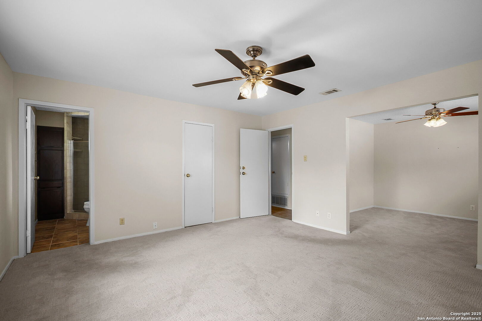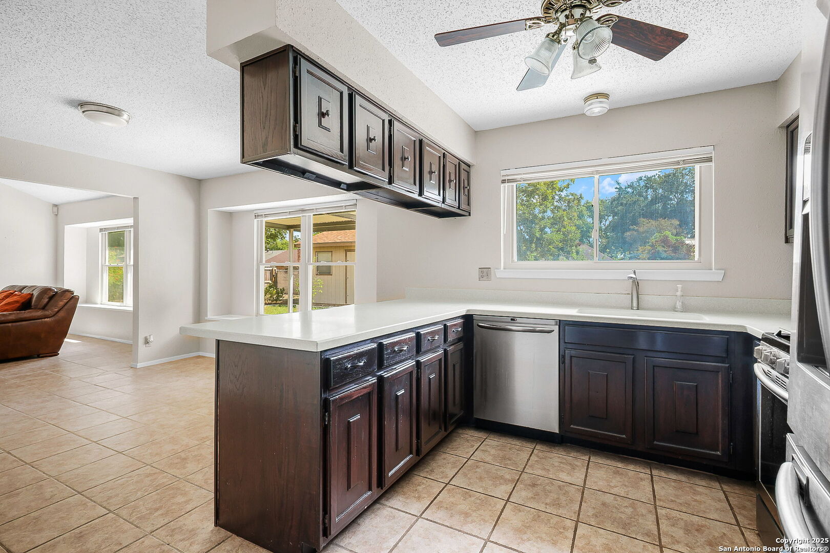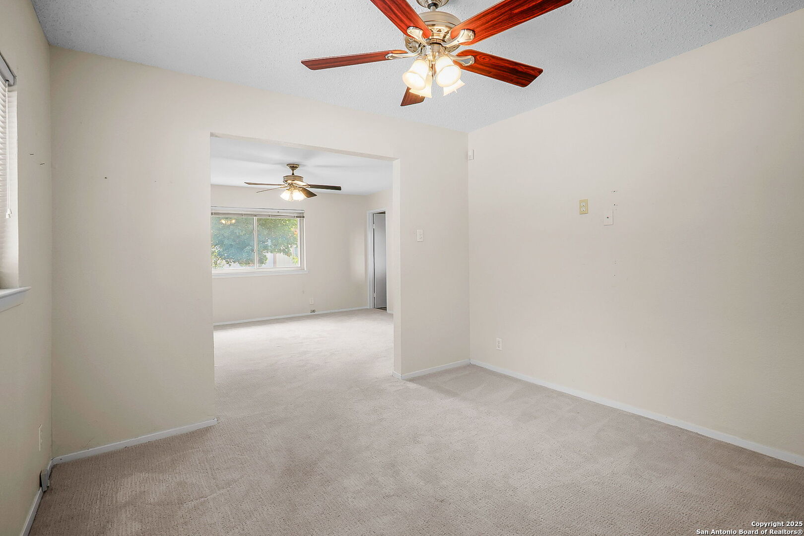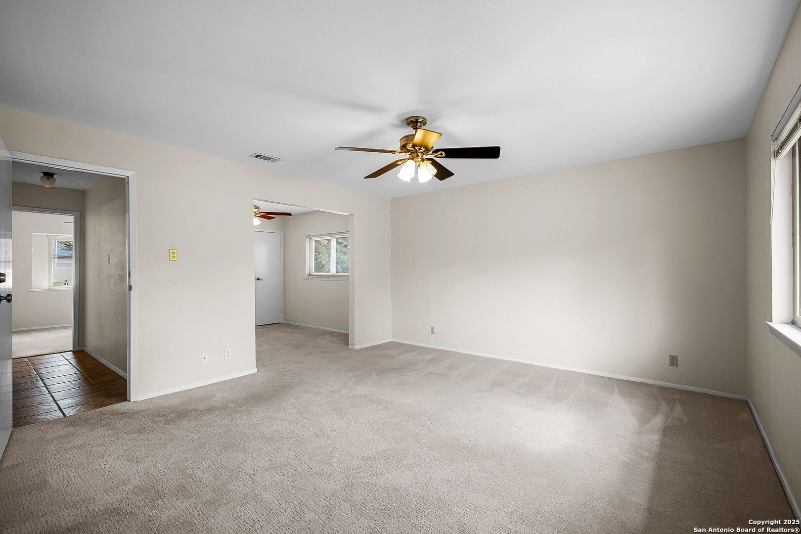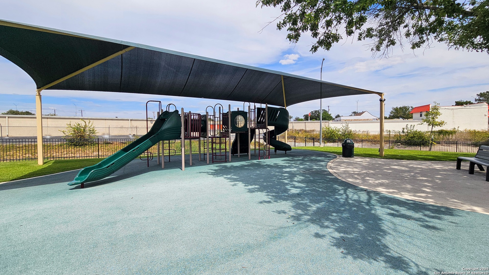 This inviting all-brick 3-bedroom, 2-bath home offers a perfect blend of comfort, character, and outdoor living! The living room features a beautiful see-through brick fireplace with glass doors and flows into the dining area with elegant custom built-in cabinetry. The remodeled kitchen showcases Corian countertops, a new sink, and refinished cabinets. Enjoy durable ceramic tile flooring throughout the common areas. The spacious primary suite includes a private flex room ideal for a nursery, home office, or oversized closet. Step outside to your backyard retreat featuring an in-ground pool, covered patio, fire pit, and a 200 SF insulated shed with AC - perfect for a workshop, studio, or storage. There's also space for a vegetable garden and herb beds, with extra hose bibs conveniently tied into the sprinkler system. A new gas water heater was installed in June 2025. Refrigerator, washer, gas dryer, and water filtration system are included with the sale. Pre-wired for an ADT security system. Located just down the street from Meadow Oaks Park, the area's largest park west of 1604, offering a playground, basketball court, pavilion with BBQ grill, and more. Schedule your private tour today and experience this beautifully maintained home for yourself!
