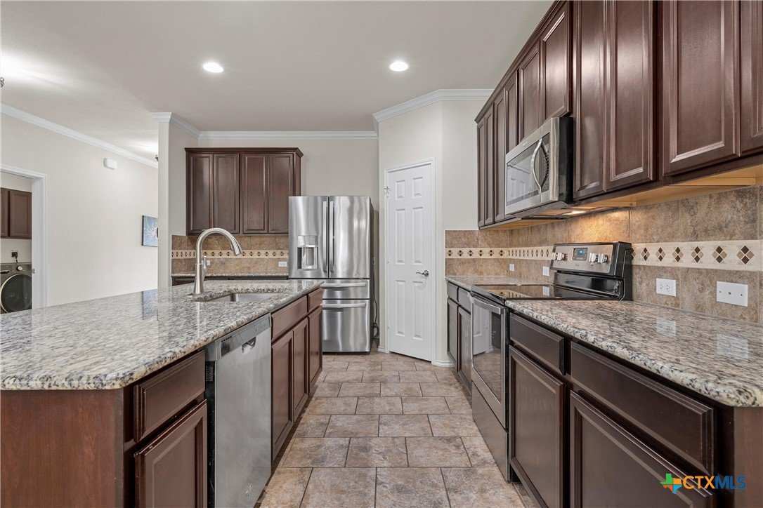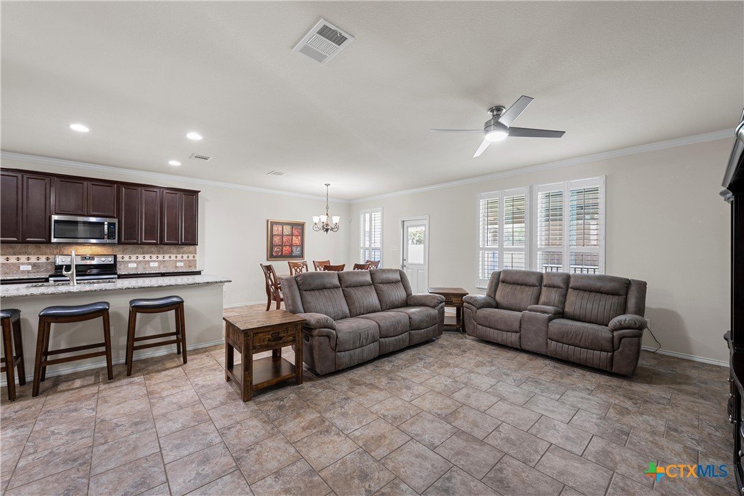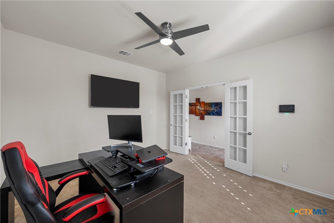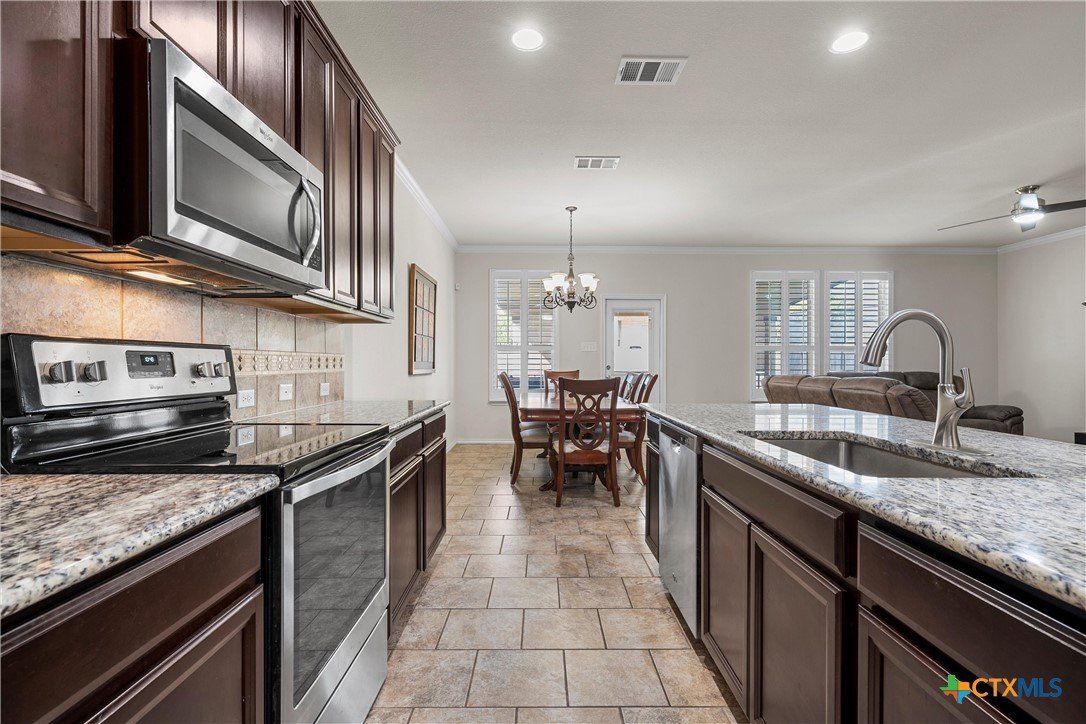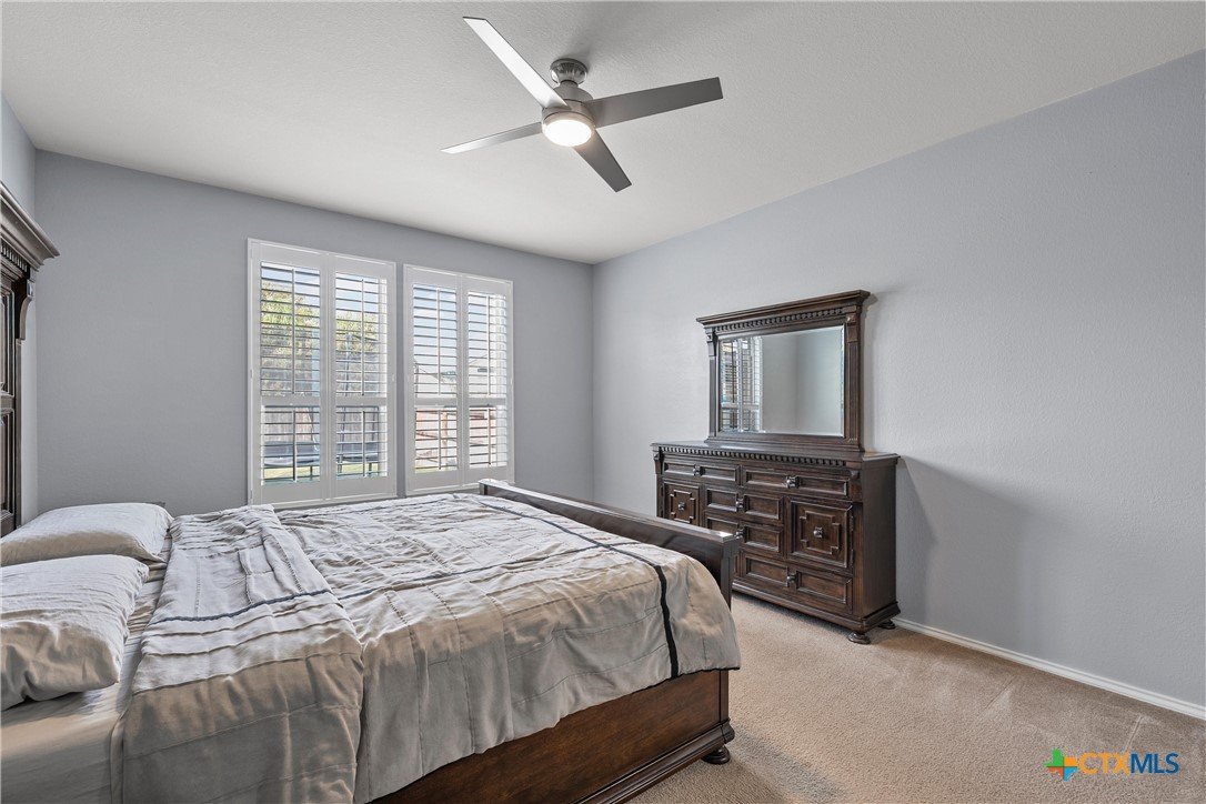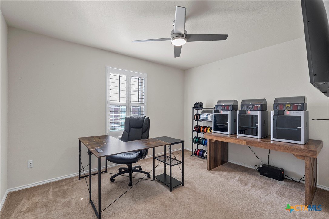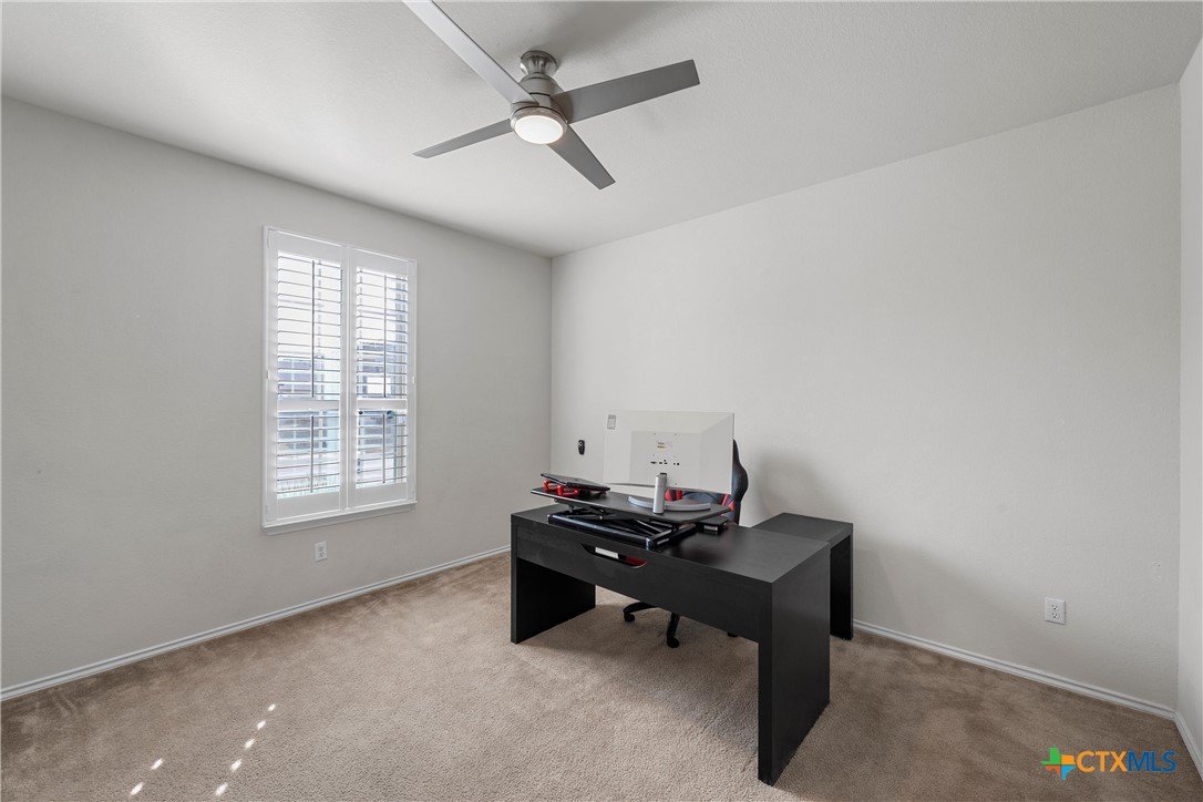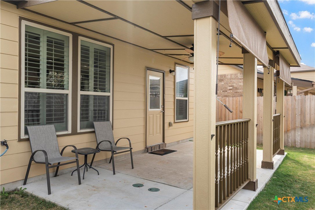 BIG buyer incentive! Seller is covering ALL closing costs plus offering a rate buy down. Buyers may qualify for a 5.25% fixed rate or a 1:0 buy down—4.25% the first year, then 5.25% fixed. Contact our preferred lender for full details and qualification. Welcome to this beautifully upgraded two-story home offering 4 bedrooms, 2.5 baths, and a dedicated office, perfectly blending comfort, functionality, and style. Inside, an elegant office with French doors creates an ideal work-from-home space. A hallway leads to a coat closet and a spacious half bath with a custom vanity. Nearby, the well-designed laundry room offers garage access, a single basin sink, custom vanity, and overhead cabinetry. The heart of the home is the open kitchen, dining, and living area—perfect for entertaining and everyday living. The kitchen features granite countertops, an oversized island for dining and gathering, a coffee bar, generous walk-in pantry, and all-electric appliances, including a refrigerator that conveys. Tile flooring flows throughout the main areas, and plantation shutters with a lifetime warranty help keep the home energy-efficient and comfortable. The main-level primary suite includes a dual vanity bath, stand-up shower, and a massive walk-in closet that wraps under the stairs for extra storage. Upstairs, a large loft with recessed lighting connects to three spacious bedrooms, each with walk-in closets, and a full bath with a dual vanity and tub/shower combo. Step outside to an extended covered patio with retractable sunshades, ideal for relaxing or hosting guests. The meticulously maintained lawn and three-sided stone exterior with lap siding add durability, charm, and curb appeal. Located a short walk from the community pool, park, and soccer pitch—and minutes from Belton ISD schools, Crossroads Park, and shopping and dining along West Adams—this home offers convenience, quality, and an exceptional location.