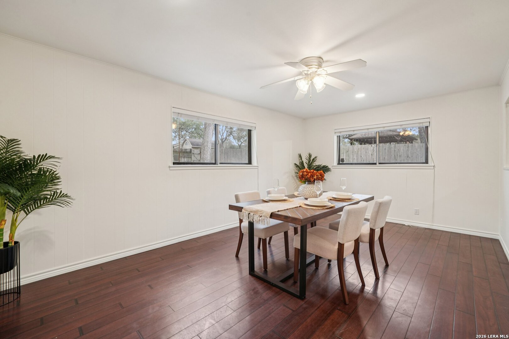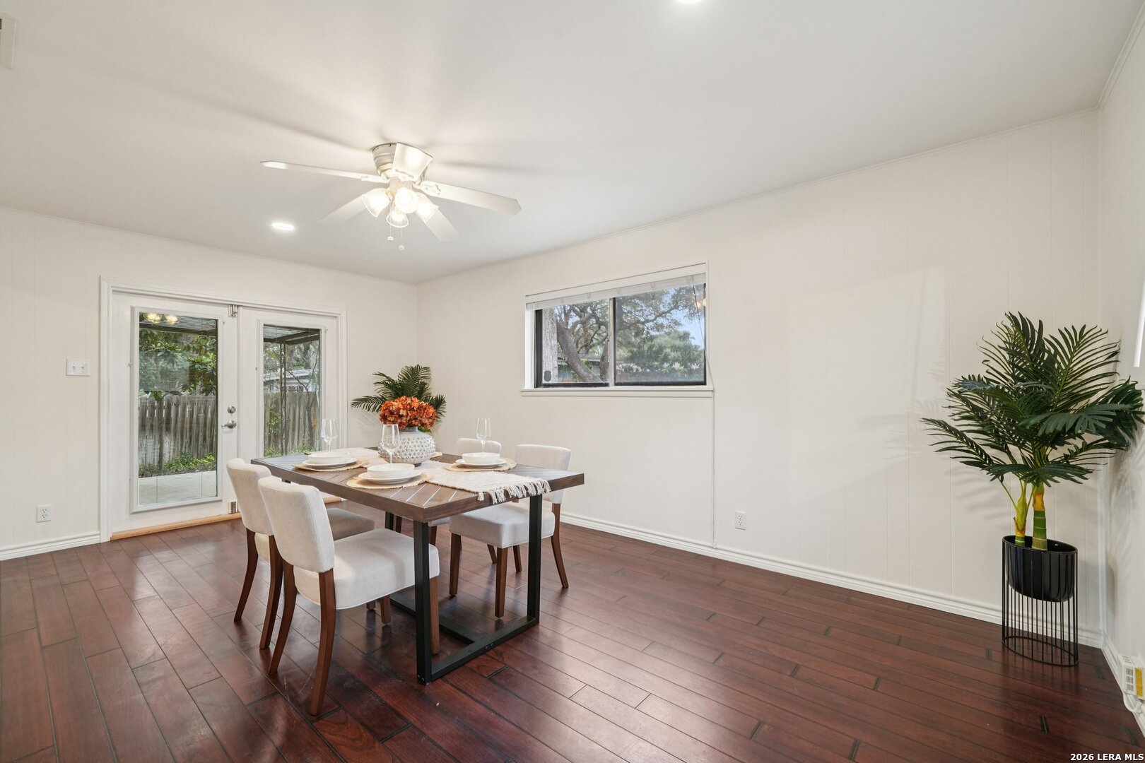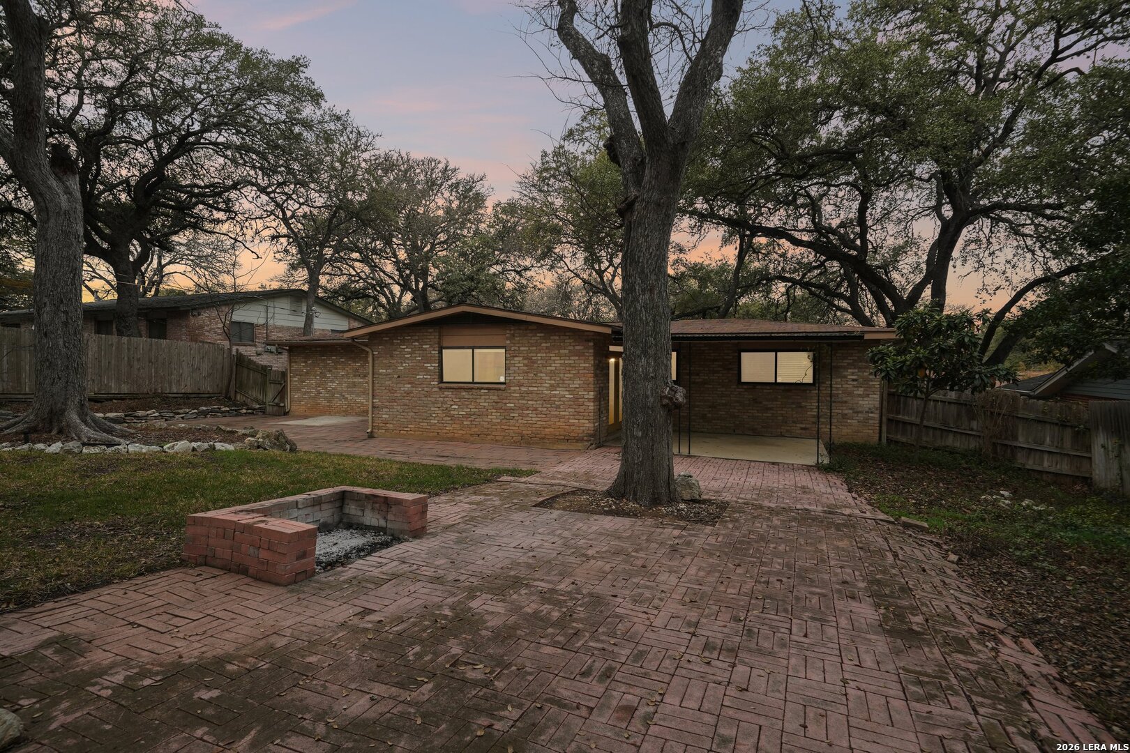 Beautiful one-story home with an all brick exterior that offers classic curb appeal and easy maintenance. A covered front porch creates a charming entry, while recessed lighting throughout adds a warm and inviting feel inside. The thoughtfully designed layout features a formal dining room perfect for gatherings, along with a comfortable eat-in kitchen ideal for everyday meals. The kitchen includes stainless steel appliances and a cozy dining area overlooking the backyard, making it a natural place to connect and relax. Step outside to a covered patio with an extended patio slab, providing plenty of space to unwind or entertain. Mature trees offer shade and character, while a privacy fence creates a peaceful outdoor retreat. An attached two-car garage adds convenience and extra storage. Located in Universal City TX, this brick home offers quick access to Loop 1604 and Interstate 35 for an easy commute. Just minutes from Randolph Air Force Base, a short drive to Fort Sam Houston, and close to shopping and dining at IKEA. Within walking distance to Red Horse Park, Universal City Park, the Cibolo Creek Trail System, and a local frisbee golf course, providing convenient access to outdoor recreation and scenic trails right nearby.