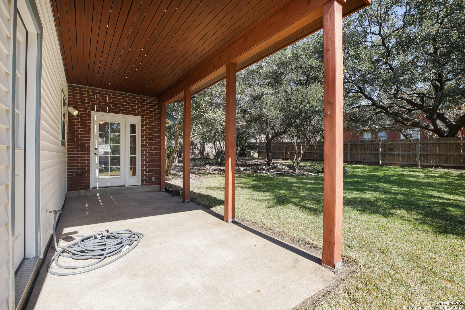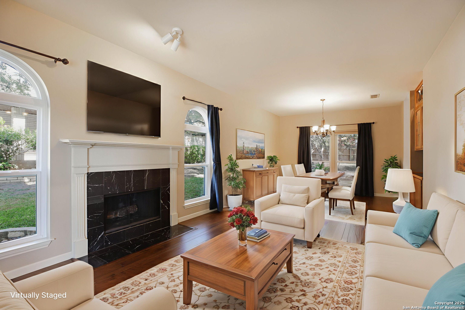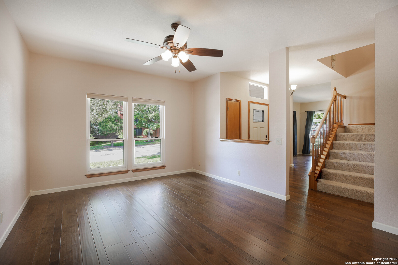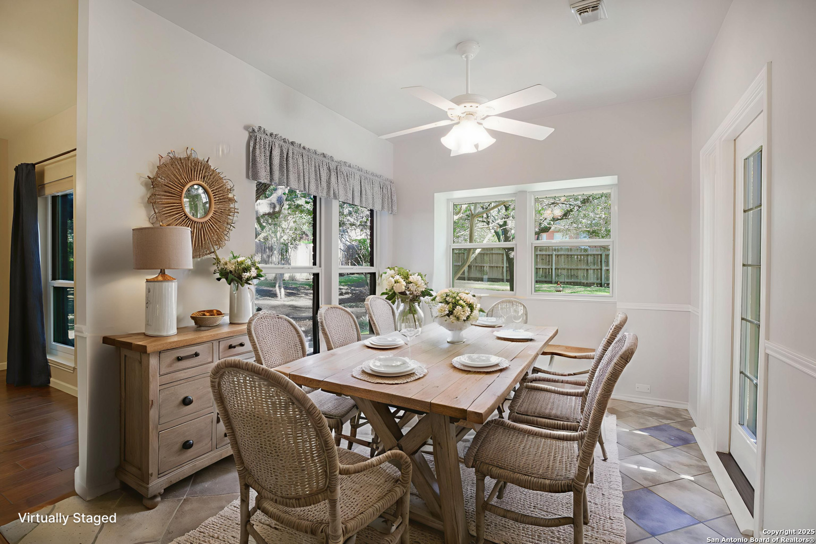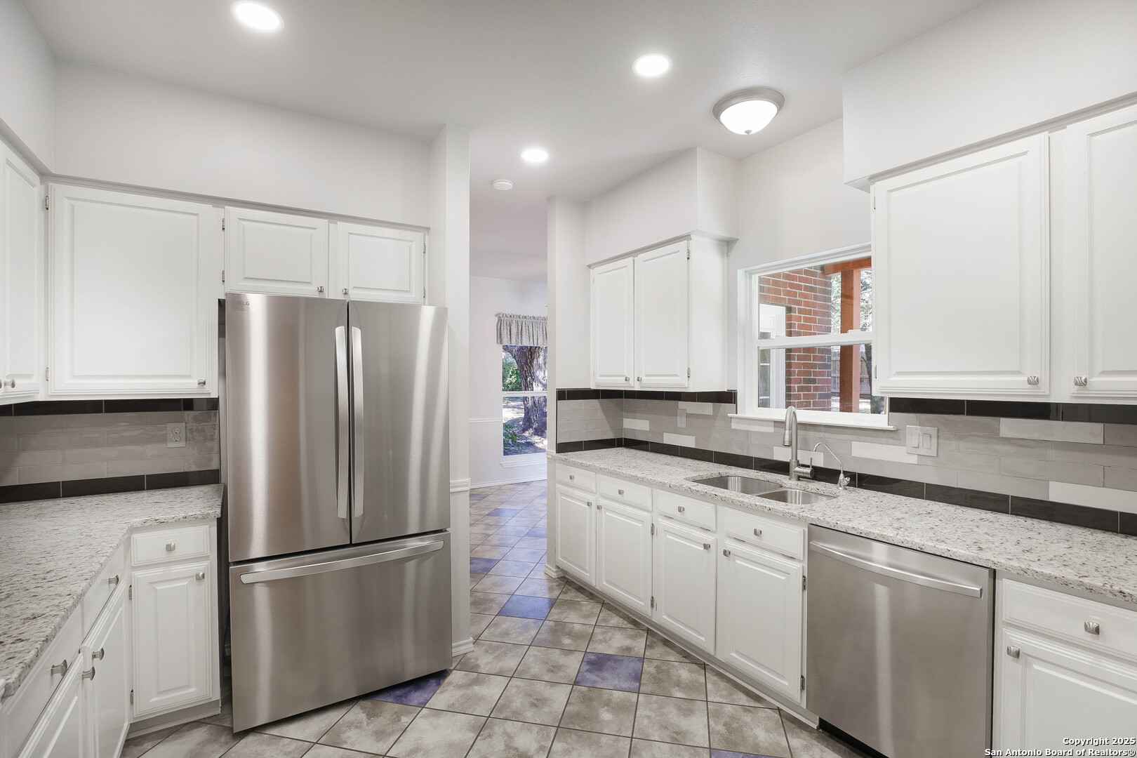 Step into this beautifully refreshed 4-bedroom, 2.5-bath custom-built home located in the heart of Stone Oak, offering the perfect blend of space, style, and convenience. Situated near NEISD schools, shopping, dining, and commuter routes, this home checks all the boxes for modern living. Enjoy peace of mind with a brand-new roof (2025), partial siding replacement, updated windows throughout, and new garage doors. Inside, the home boasts a thoughtful layout featuring two spacious living areas and two dining spaces, perfect for both everyday comfort and entertaining guests. The kitchen is a standout with granite countertops, a new stainless steel dishwasher and refrigerator, and ample cabinetry. Downstairs showcases engineered hardwood floors and an abundance of natural light. Upstairs, the private primary suite offers a tranquil retreat with a walk-in closet, cozy office nook, and access to a private deck with views of lush, mature trees-a serene spot to enjoy your morning coffee or unwind in the evening. The home has been freshly updated with new paint in the bedrooms, kitchen, and dining areas, giving it a bright and inviting feel. Outside, you'll find beautiful landscaping with established trees that provide both charm and privacy. (Note: backyard is open with no fence-perfect for enjoying the natural scenery.) Don't miss this move-in ready home!