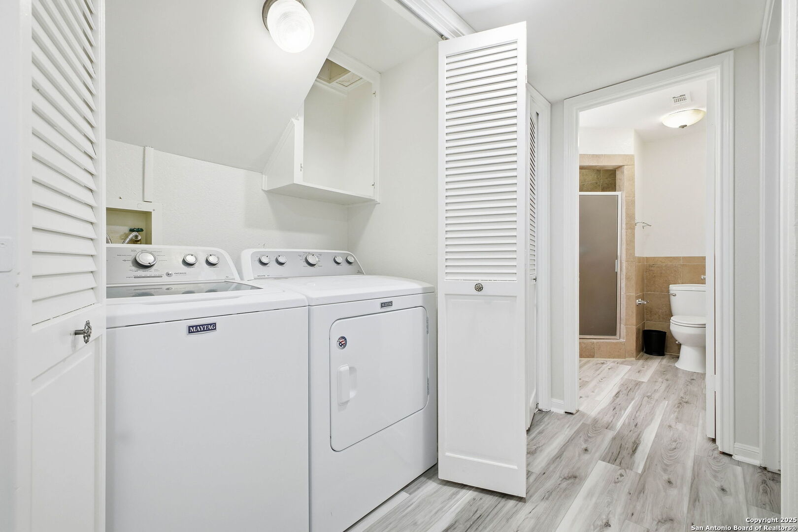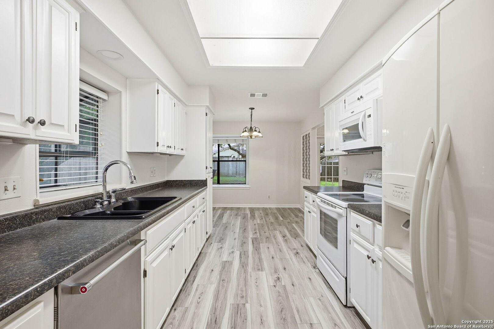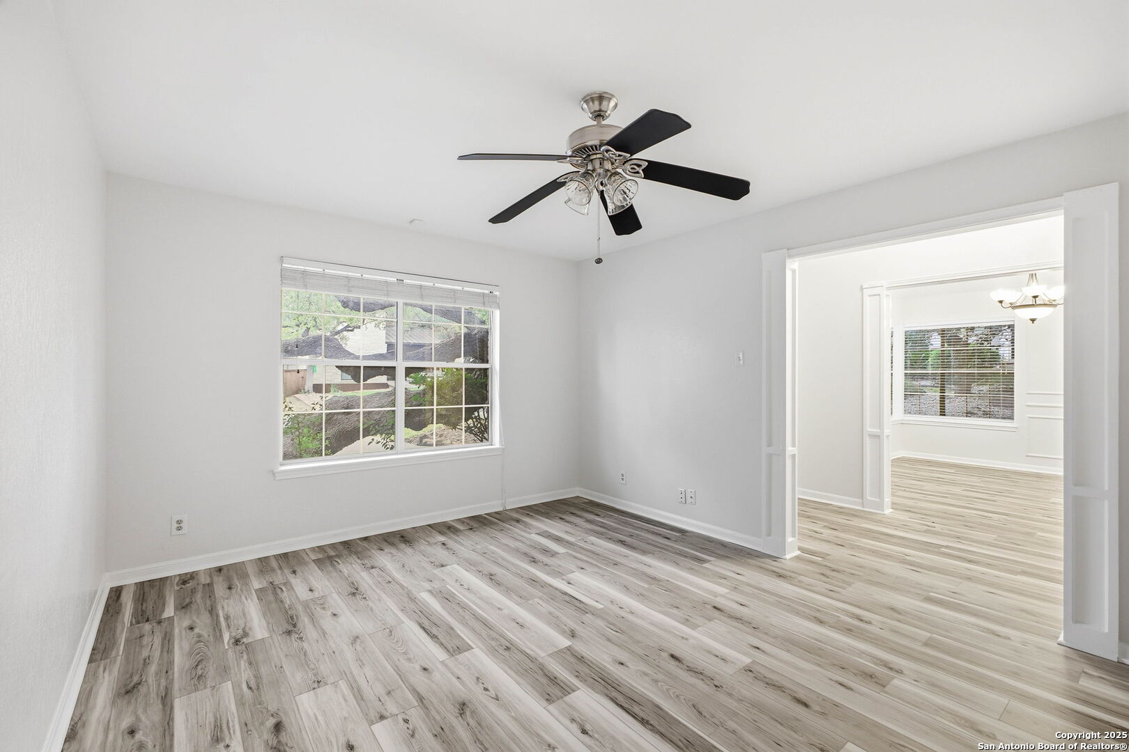 Do not miss the chance to view this home in the highly desirable Hunters Creek neighborhood! Walk into this lovely, newly updated home with 4 bedrooms and a front office! Updates include new flooring, new carpet, bathroom lighting, new paint, retexture and paint of ceiling, new water heater(with existing heat pump), new banister, and insulation from 2023. Upon walking in you will be greeted by a charming living room, a kitchen with cabinet space and appliances ready to use, plus a view of the spacious backyard. Entertain guests with the dining room or wet bar. Downstairs bedroom enjoys backyard access, full bathroom, and proximity to washer/dryer plus 2 car garage. Master bedroom enjoys a walk in closet, large bathroom with double vanity, access to a balcony, and room for relaxing. Neighborhood offers a greenbelt, pool, clubhouse, and tennis courts. Nearby access to 410, 1604, I-10, and Wurzbach parkway. Nearby access to parks and trails include Hardberger Park and Salado Creek Greenway. Nearby shopping/entertainment includes Huebner Oaks, Rim/La Cantera, The Alon ;HEB and Neighborhood Walmart both 5 or less minutes away from neighborhood. Large employers in the area include HEB, USAA, and Camp Bullis. In addition to all updates, the fridge, washer, and dryer will be staying! Ring video cameras will stay as added security for the buyer (front door, driveway, back patio, master room balcony). Voluntary HOA!