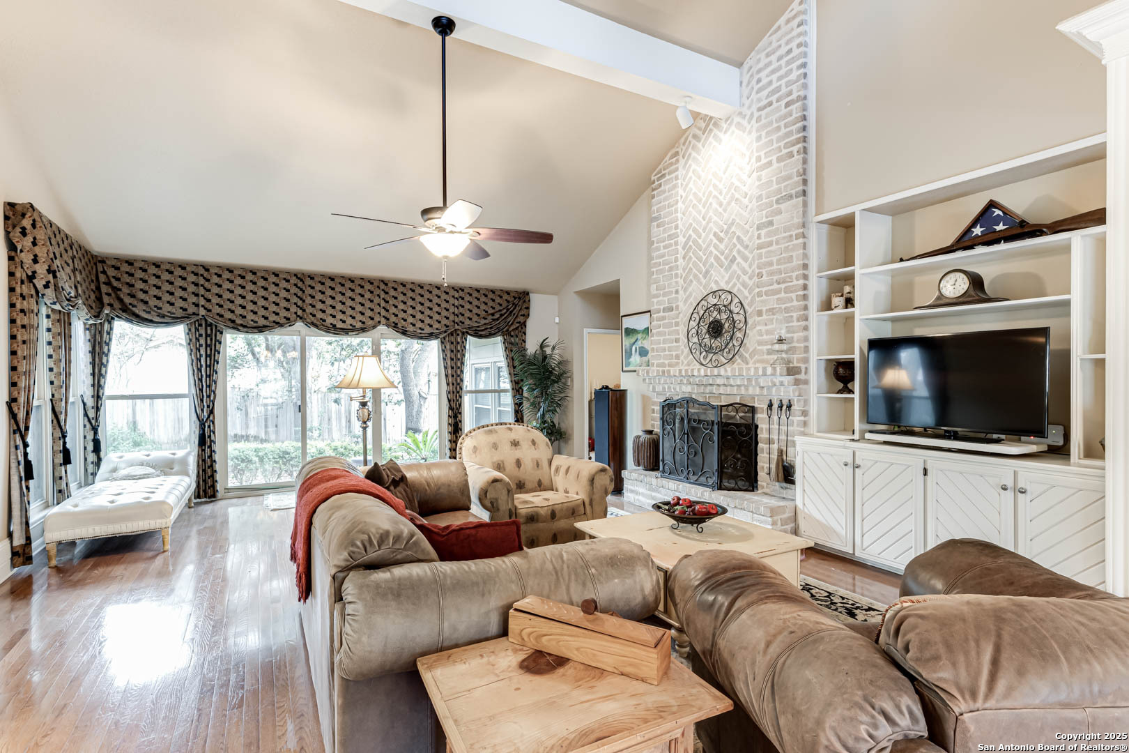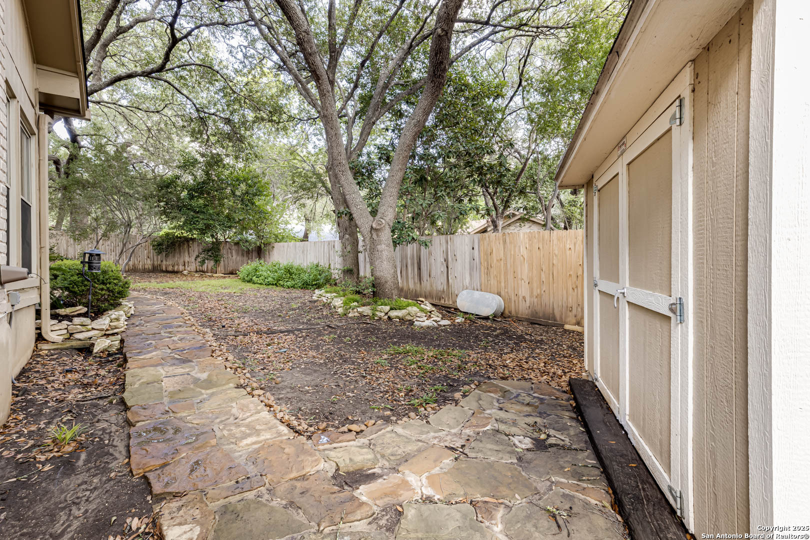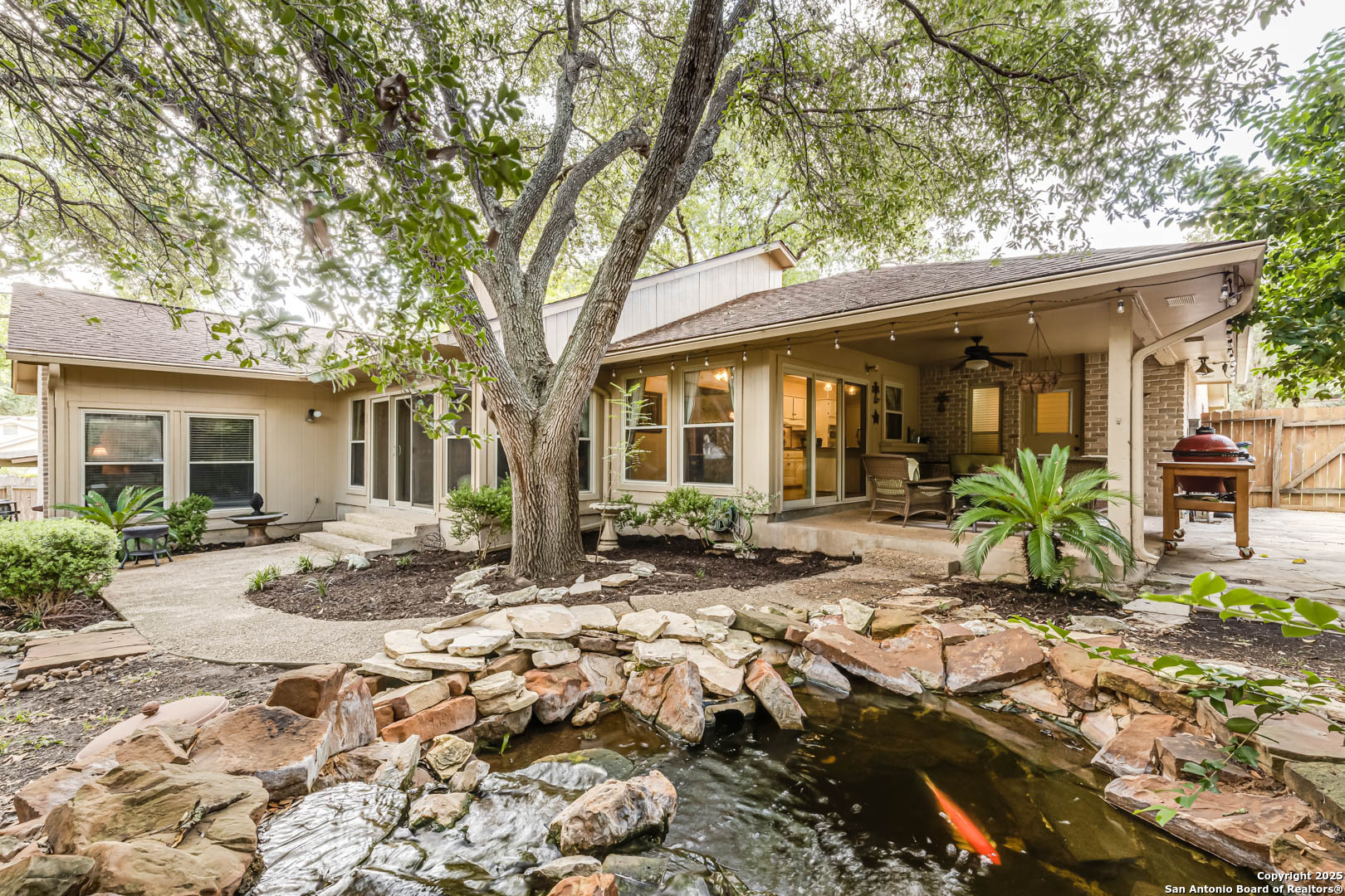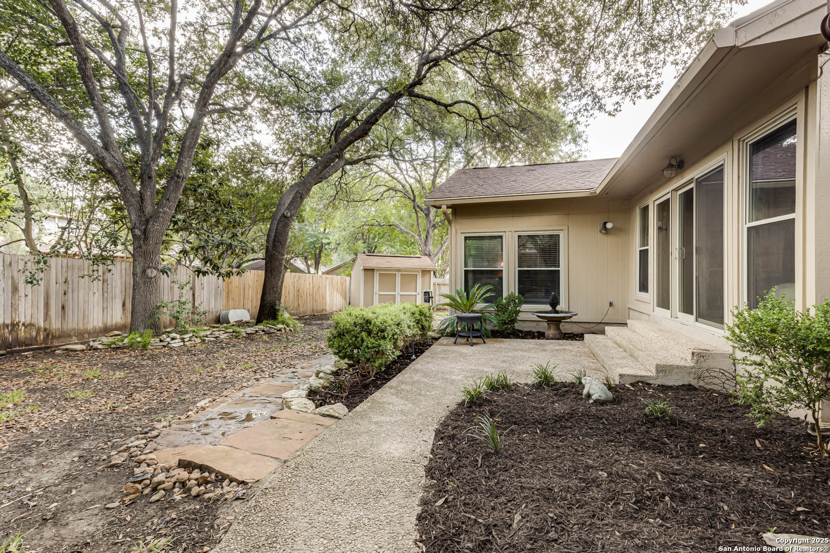 Desirable Hunters Creek home with curb appeal. Great central location! Beautiful single story home with lots of windows. Living room has high ceilings, fireplace and built-ins. Wood floors. Spacious kitchen with granite counters and under cabinet lighting. Oven, microwave, and dishwasher replaced in 2017. All bedrooms have high ceilings. Primary Primary bathroom shower replaced and has skylight. Second bathroom updated in 2018 - carpet removed, painted, new tile, and new mirrors. All windows replaced in 2017 except for one window in garage. Carpet replaced in 2017. HVAC replaced 2018. Water heater replaced approximately 2020. Roof replaced approximately 2016. Garage door opener replaced 2022. Exterior paint 2017. Large covered patio overlooks shady backyard with fish pond. Fish do not stay. Gas attachment for a BBQ is next to the patio. Shed approximately 2018. Walk to neighborhood pool, tennis courts, and clubhouse, voluntary membership. 2300 sq ft per Appraiser, 2245 sq ft per BCAD.
