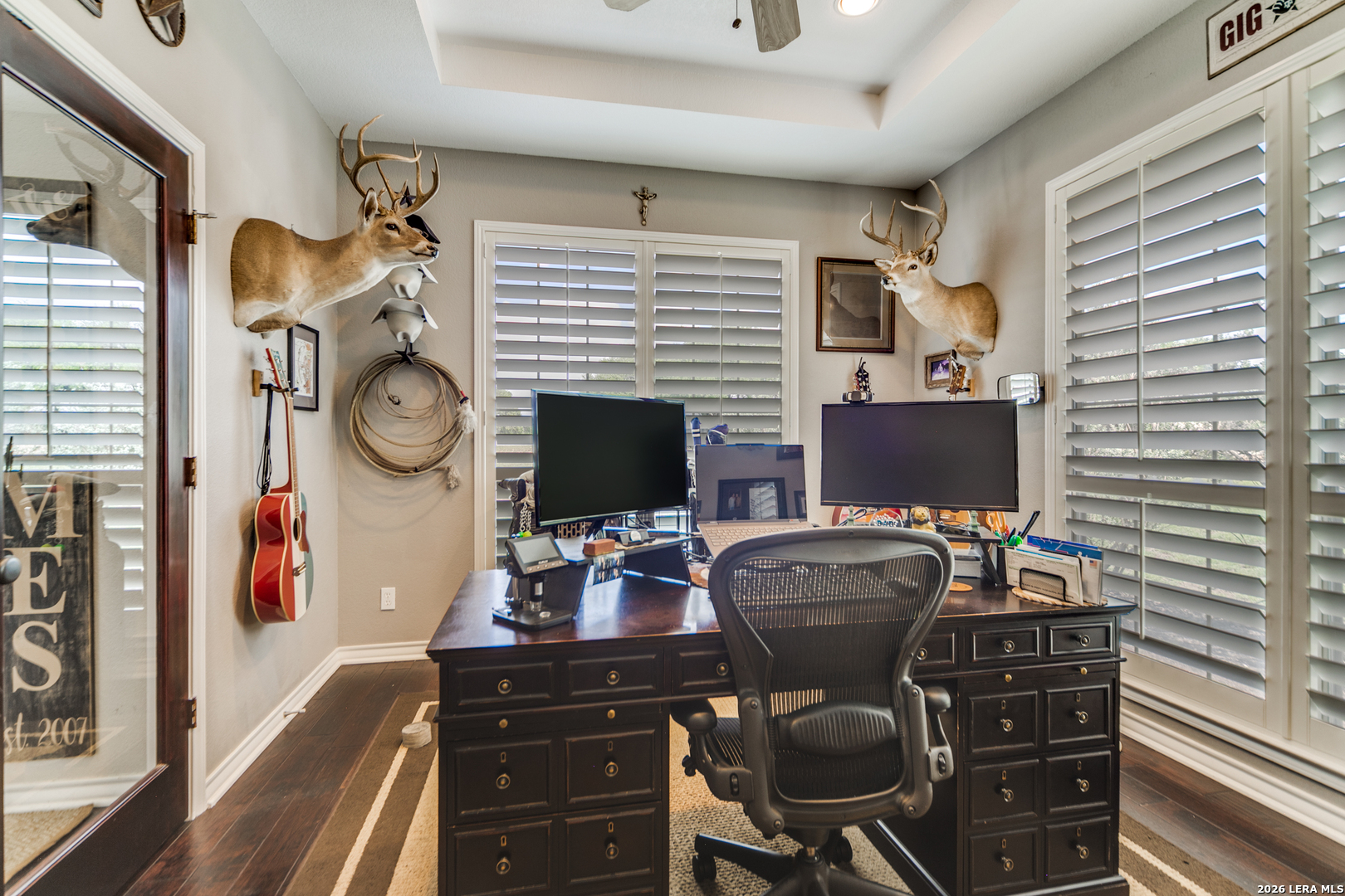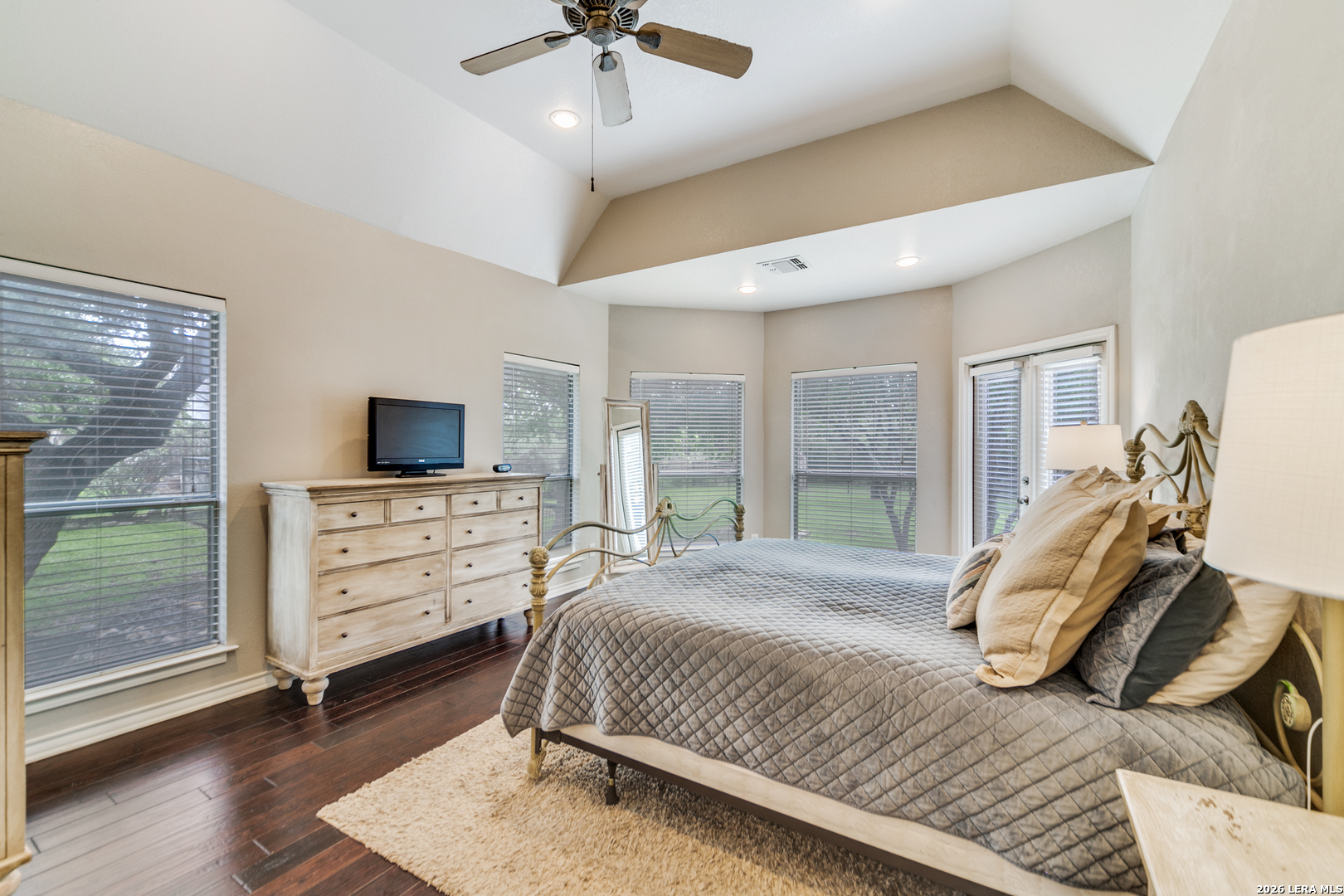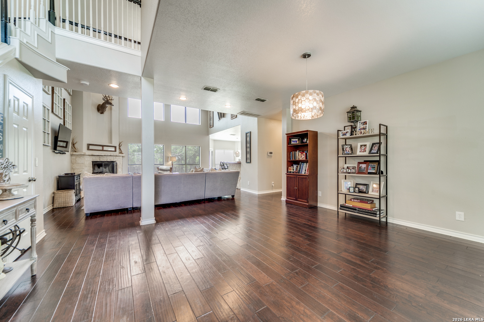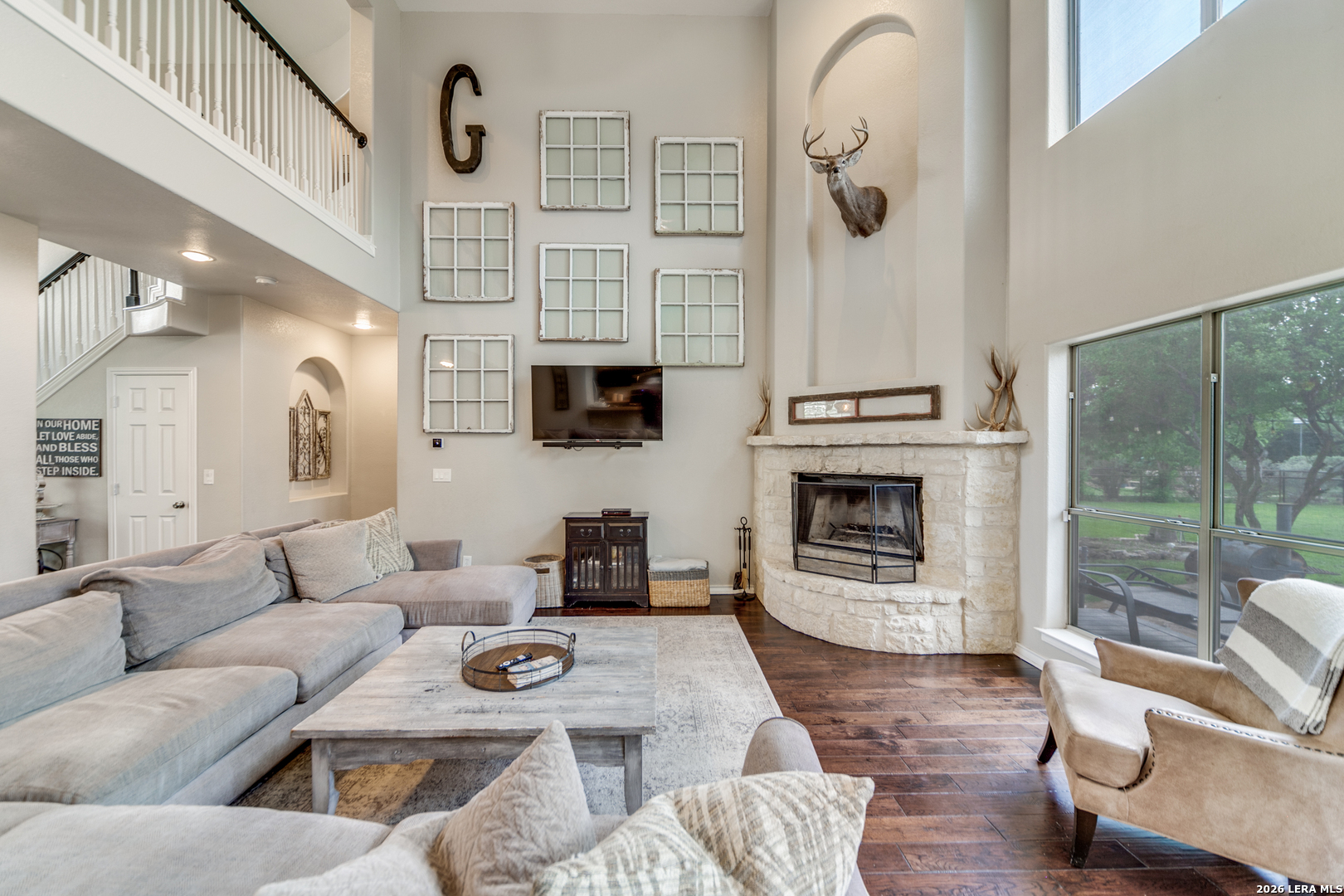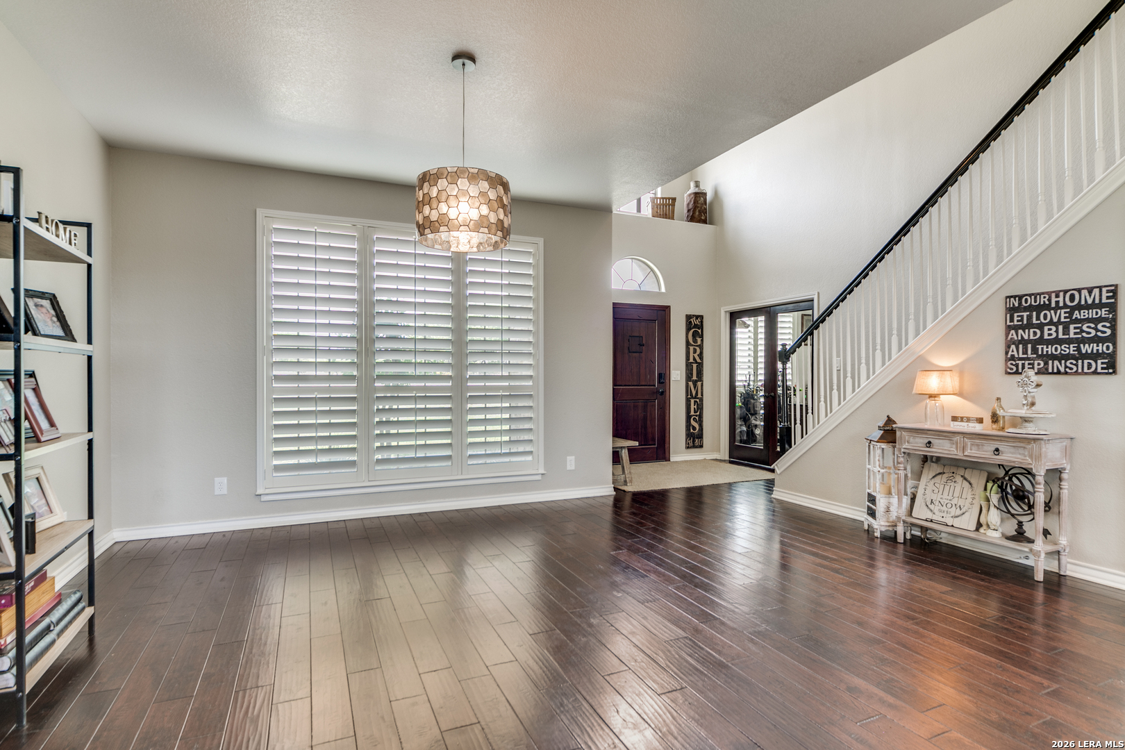 Located in the desirable River Crossing Golf Community, this home sits on a spacious 1-acre lot and offers an open, thoughtfully designed floor plan. As you walk in, you're welcomed by an open layout that leads into the main living area, highlighted by a stunning floor-to-ceiling stone fireplace. Rich wood and slate flooring, plantation shutters, and expansive windows fill the home with natural light while showcasing the beautiful outdoor surroundings. The main-level primary suite provides a private retreat with a sitting area, spa-like bath featuring a brick walk-in shower, whirlpool tub, and direct outdoor access. Upstairs, you'll find generously sized secondary bedrooms. Additional highlights include a dedicated study, formal dining room, and a gourmet kitchen with solid surface countertops, breakfast bar, and casual dining area. Outside, the expansive backyard is perfect for relaxing or entertaining, complete with an inviting outdoor fire pit. The home also features a separate laundry room and an attached 2-car garage.