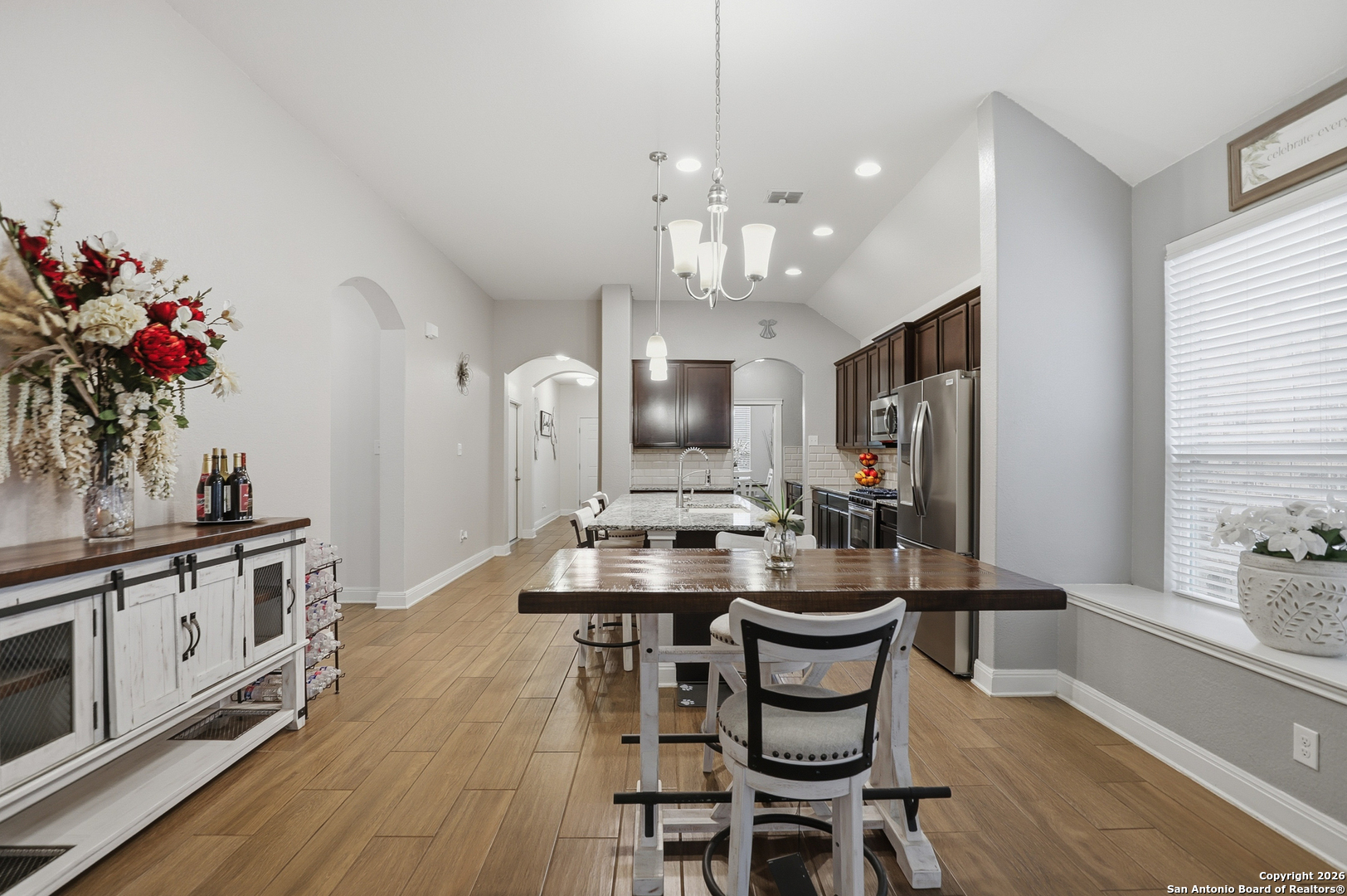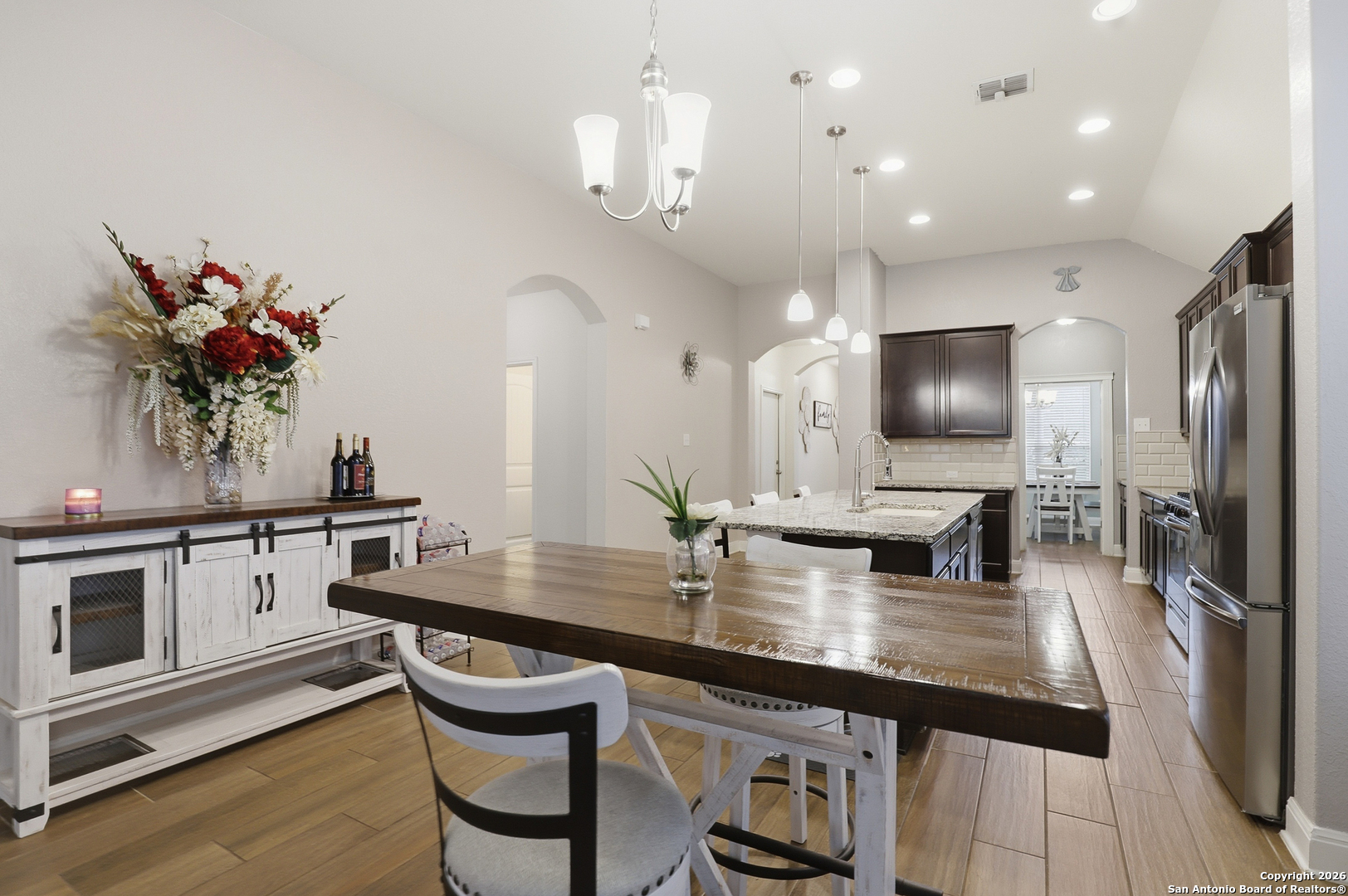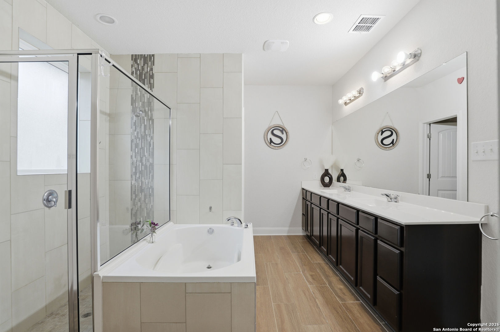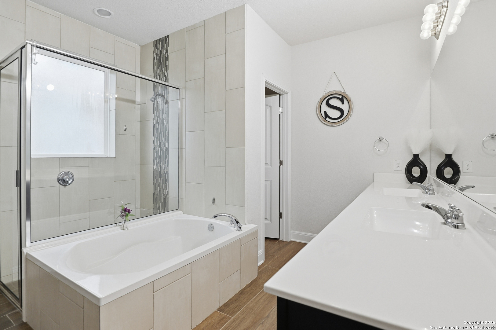 Welcome to this beautifully designed one-story home in Alamo Ranch featuring 3 bedrooms, 2 full baths, and 1,942 sq ft of smart, open living space! From the moment you enter the elongated foyer, you'll feel the warmth and functionality this home offers. The spacious eat-in kitchen is a showstopper with its oversized island, granite countertops, tile backsplash, abundant cabinetry, stainless steel appliances, gas range, and a convenient butler's pantry, perfect for entertaining and everyday living. The primary suite is privately situated at the back of the home and includes a luxurious ensuite with double vanities, a separate garden tub and walk-in shower, and a large walk-in closet that connects directly to the laundry room for added convenience. Enjoy the outdoors on your covered patio, ideal for relaxing or hosting guests. At the front of the home, a flexible space offers the option for a formal dining room or home office to suit your needs. Located in the highly desirable Northside ISD, this home combines style, comfort, and convenience in one of San Antonio's fastest-growing communities. Don't miss this opportunity!