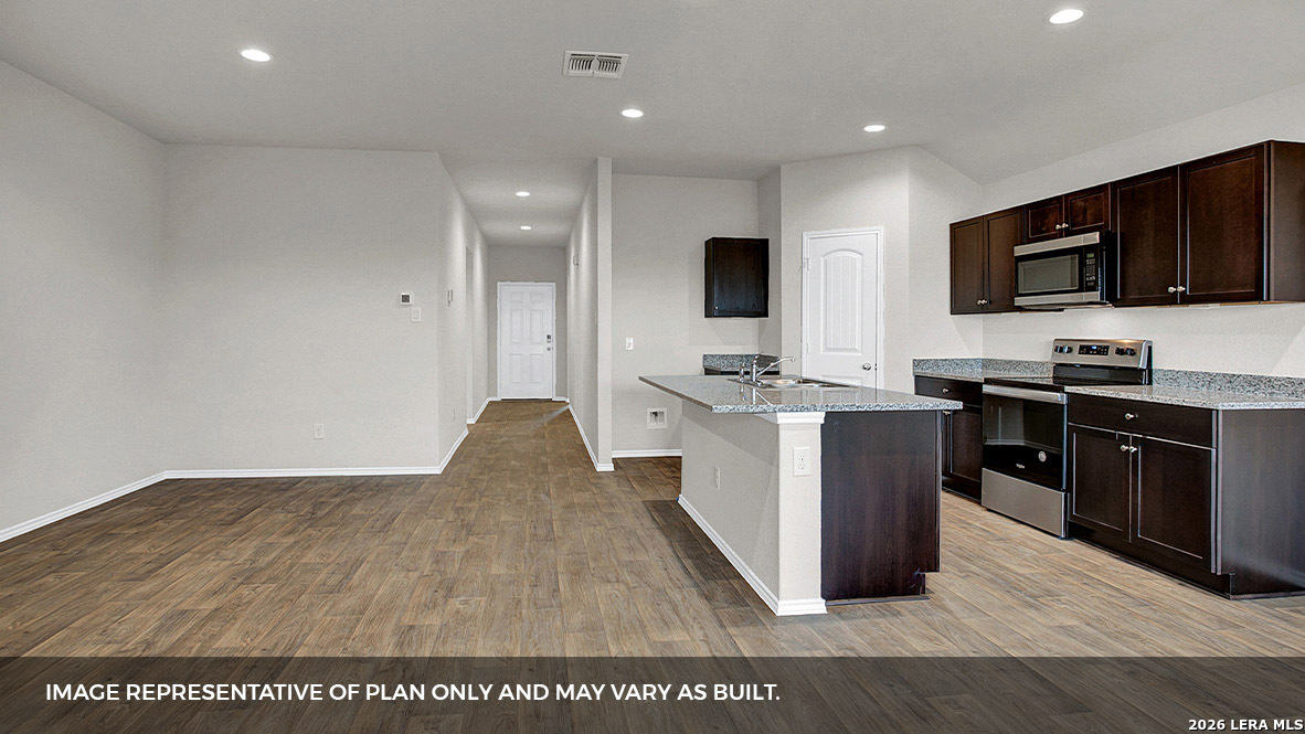 The Easton plan located at The Birch at Spencer Ranch in Boerne, TX offers a perfect balance of style, comfort, and functionality within a spacious 1680 square foot, single-story layout. Featuring 4 bedrooms and two full bathrooms, this home is designed with you and your loved ones in mind. A welcoming elongated foyer guides you into the heart of the home, where an open-concept kitchen, dining area and living room create a bright, airy space ideal for gatherings and everyday life. The kitchen stands out with stainless steel appliances, quartz countertops, a spacious kitchen island and a farmhouse style sink. Stylish flat panel cabinetry and classic white subway tile backsplash complete the modern look in this home. The primary bedroom suite, privately located at the rear of the home, offers a relaxing retreat with a walk-in shower, dual vanity sinks and a massive walk-in closet. At the front of the home, the secondary bedrooms provide privacy and flexibility - perfect for children, guests or home offices. Each features quality carpet flooring, large windows and ample closet space for comfort and convenience. This home includes our HOME IS CONNECTED base package. Using one central hub that talks to all the devices in your home, you can control the lights, thermostat and locks, all from your cellular device. Additional highlights of The Easton include vinyl plan flooring throughout the main living areas, a covered patio (per plan), full yard landscaping with irrigation and a pre-plumbed water softener loop. The Easton brings practical elegance to life in The Birch at Spencer Ranch! We're ready to welcome you home!