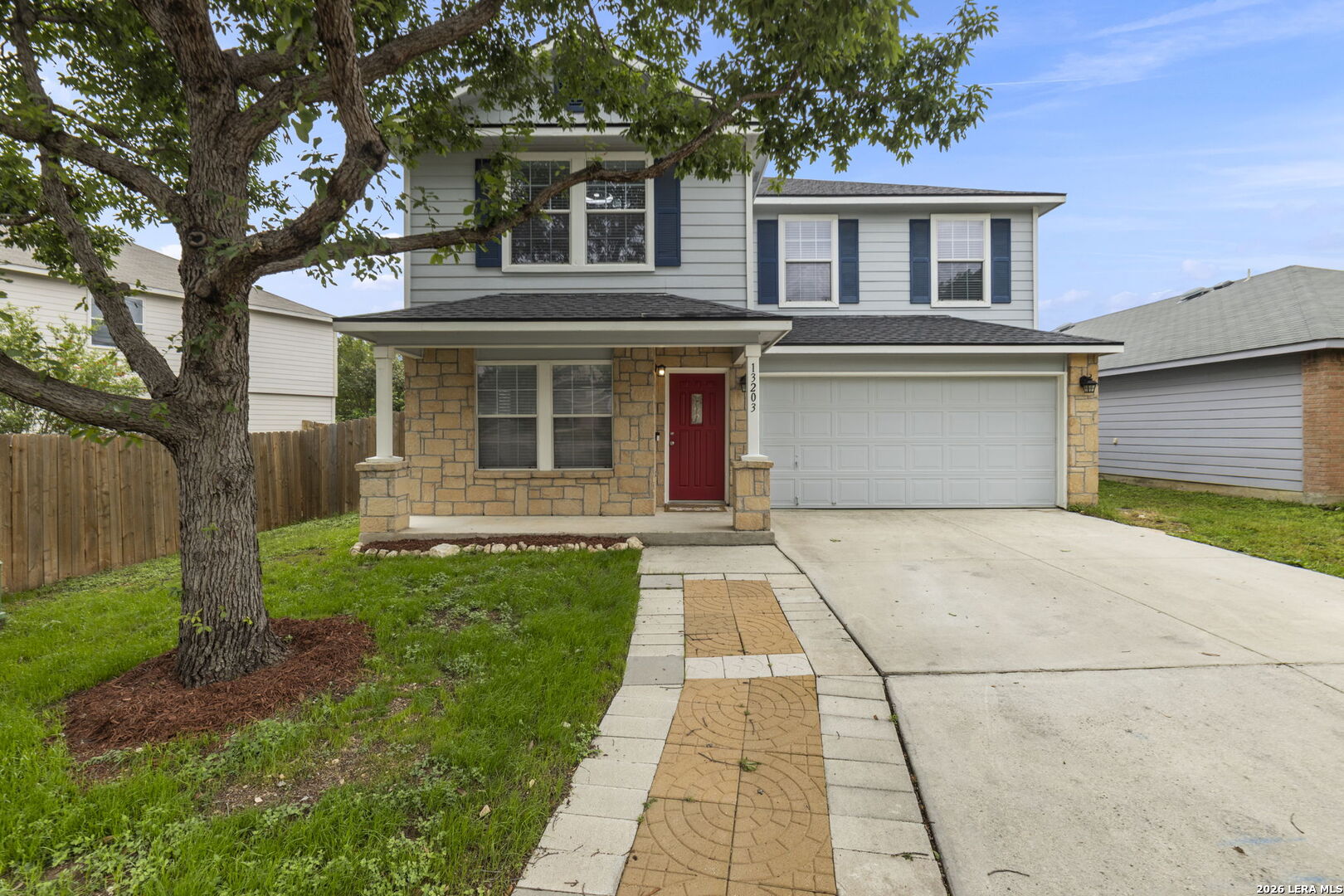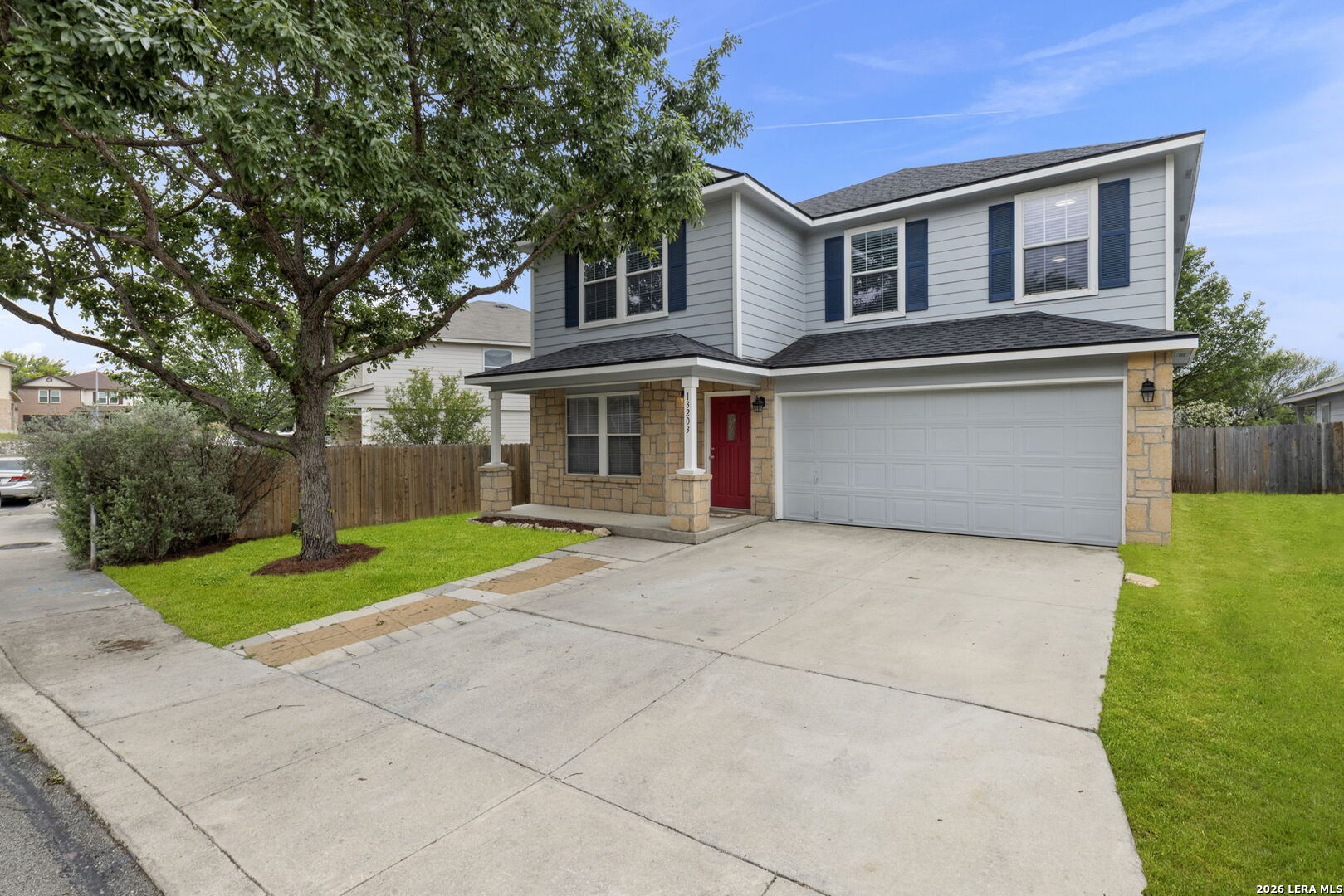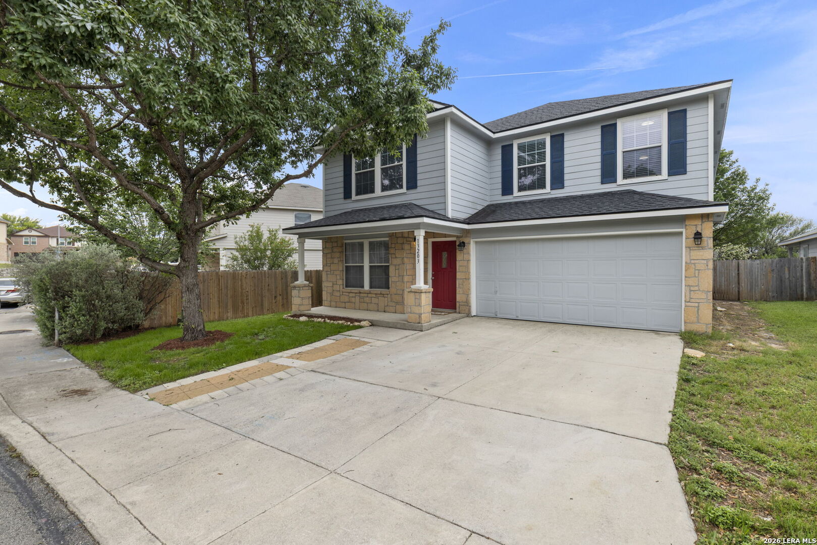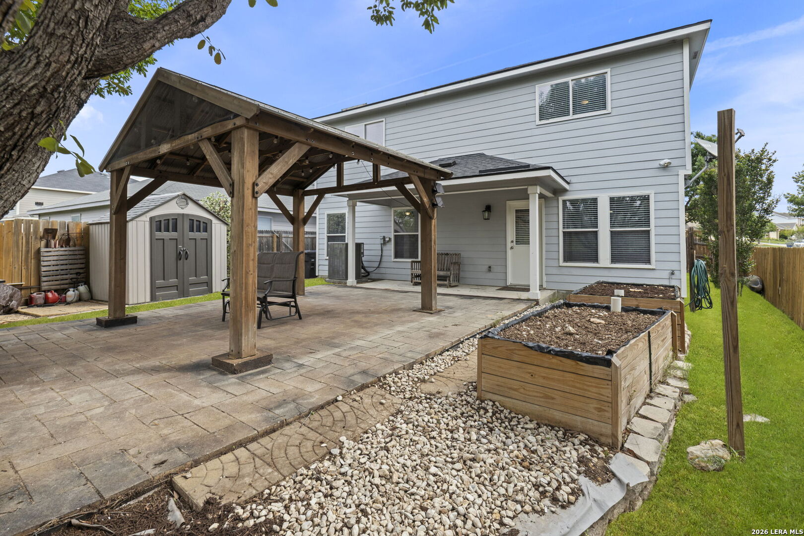 Versatility meets comfort in this spacious two-story home offering 4 bedrooms, 3.5 baths, and an impressive three living areas-perfect for everyday living and entertaining alike. A standout feature is the dual primary bedroom setup, with one conveniently located on the first floor and another upstairs, each complete with its own en suite bath-ideal for multi-generational living or hosting guests in style. The kitchen is designed to be the heart of the home, featuring abundant cabinetry and a large peninsula island topped with butcher block counters, offering both function and charm. Upstairs, you'll find a generously sized gameroom, the second primary suite, two additional bedrooms, and a conveniently located laundry room. Step outside to enjoy a low-maintenance backyard retreat, complete with a covered patio, an expansive stone paver patio with pergola, raised garden beds, and a storage shed-ready for relaxing evenings, weekend gatherings, or growing your own herbs and veggies. All of this, ideally situated with quick and easy access to Loop 1604 and IH-10, placing shopping, dining, and commuting within easy reach.