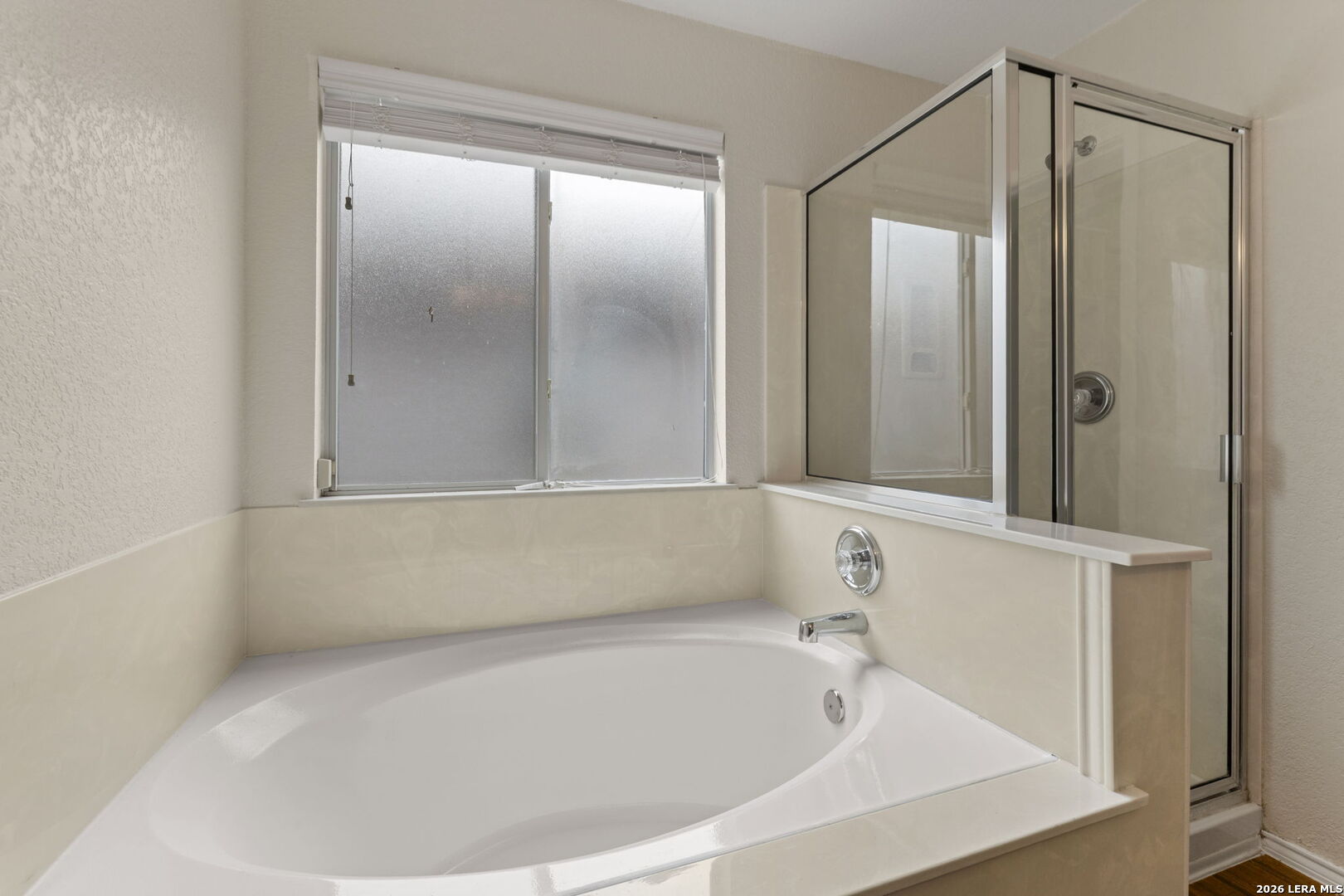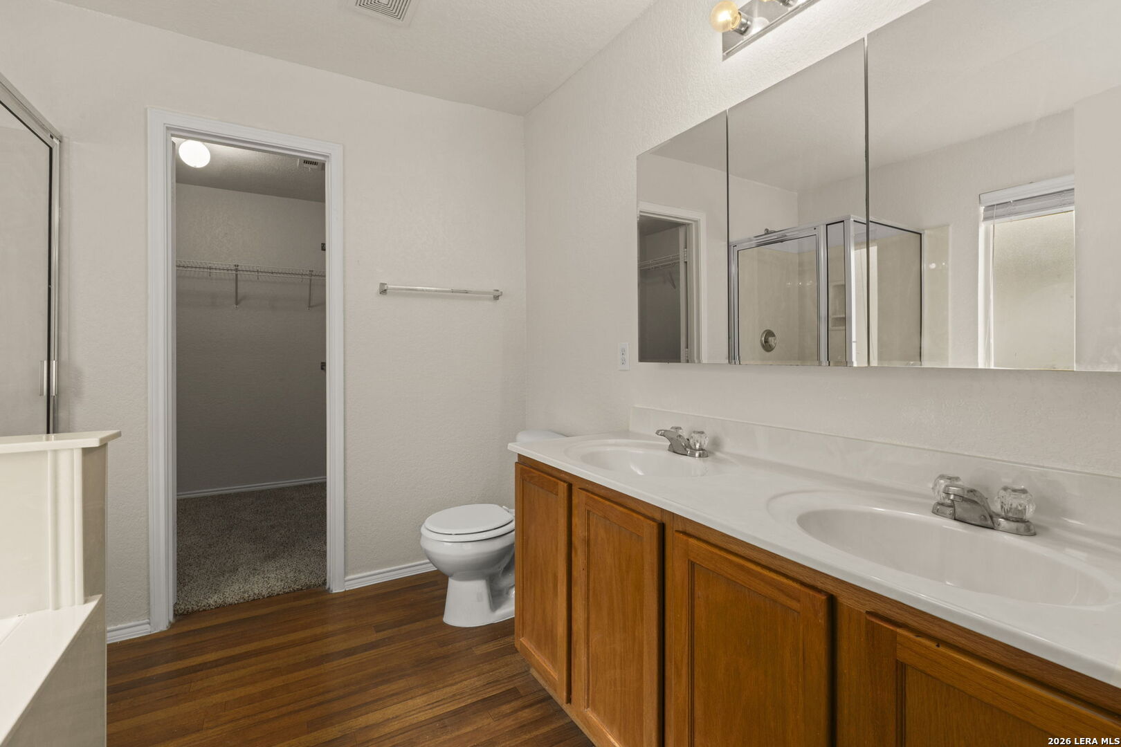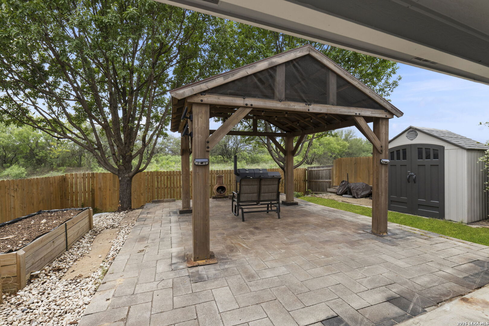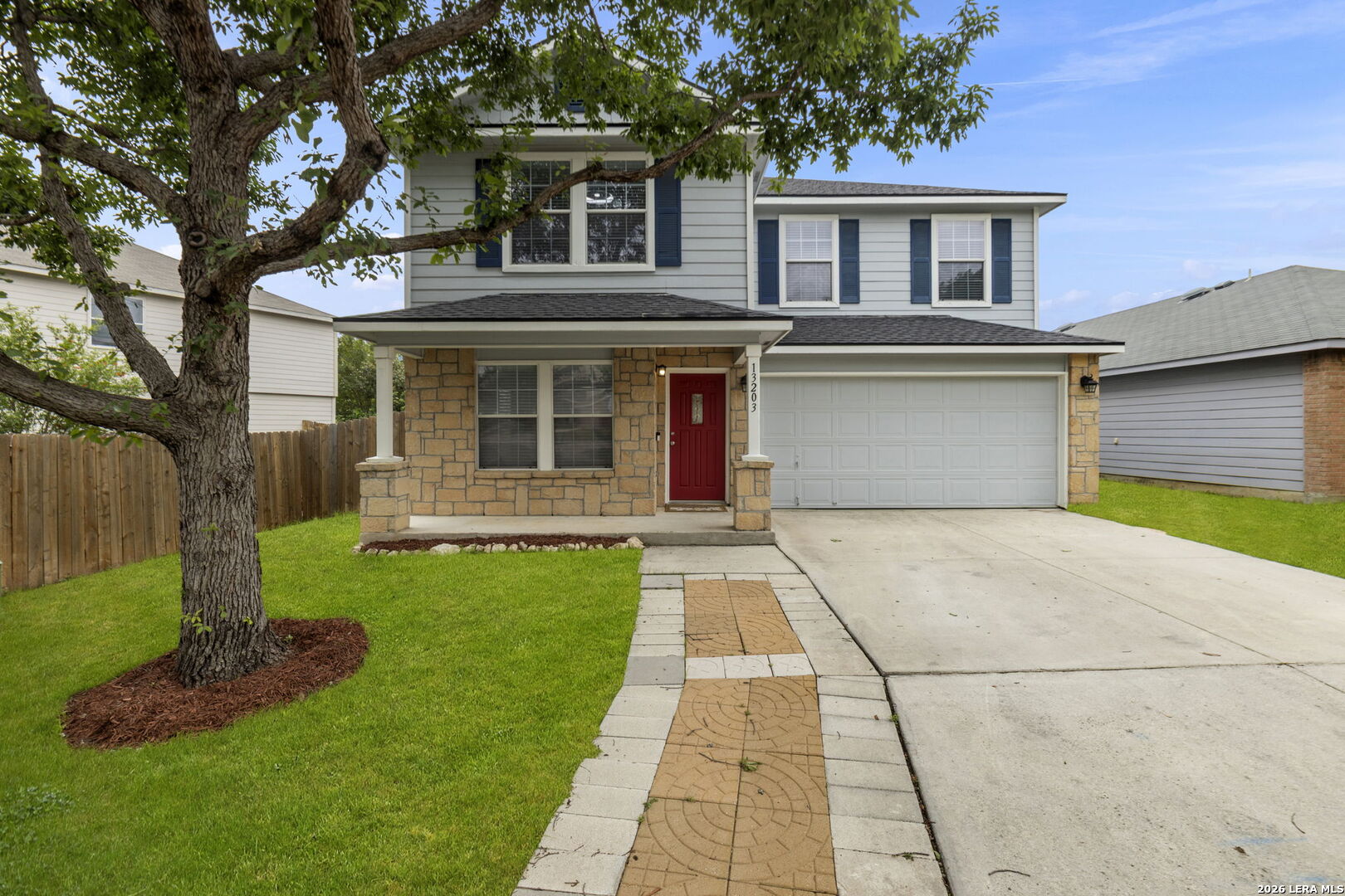 Versatility meets comfort in this spacious two-story home offering 4 bedrooms, 3.5 baths, and an impressive three living areas-perfect for everyday living and entertaining alike. A standout feature is the dual primary bedroom setup, with one conveniently located on the first floor and another upstairs, each complete with its own en suite bath-ideal for multi-generational living or hosting guests in style. The kitchen is designed to be the heart of the home, featuring abundant cabinetry and a large peninsula island topped with butcher block counters, offering both function and charm. Upstairs, you'll find a generously sized gameroom, the second primary suite, two additional bedrooms, and a conveniently located laundry room. Step outside to enjoy a low-maintenance backyard retreat, complete with a covered patio, an expansive stone paver patio with pergola, raised garden beds, and a storage shed-ready for relaxing evenings, weekend gatherings, or growing your own herbs and veggies. All of this, ideally situated with quick and easy access to Loop 1604 and IH-10, placing shopping, dining, and commuting within easy reach.