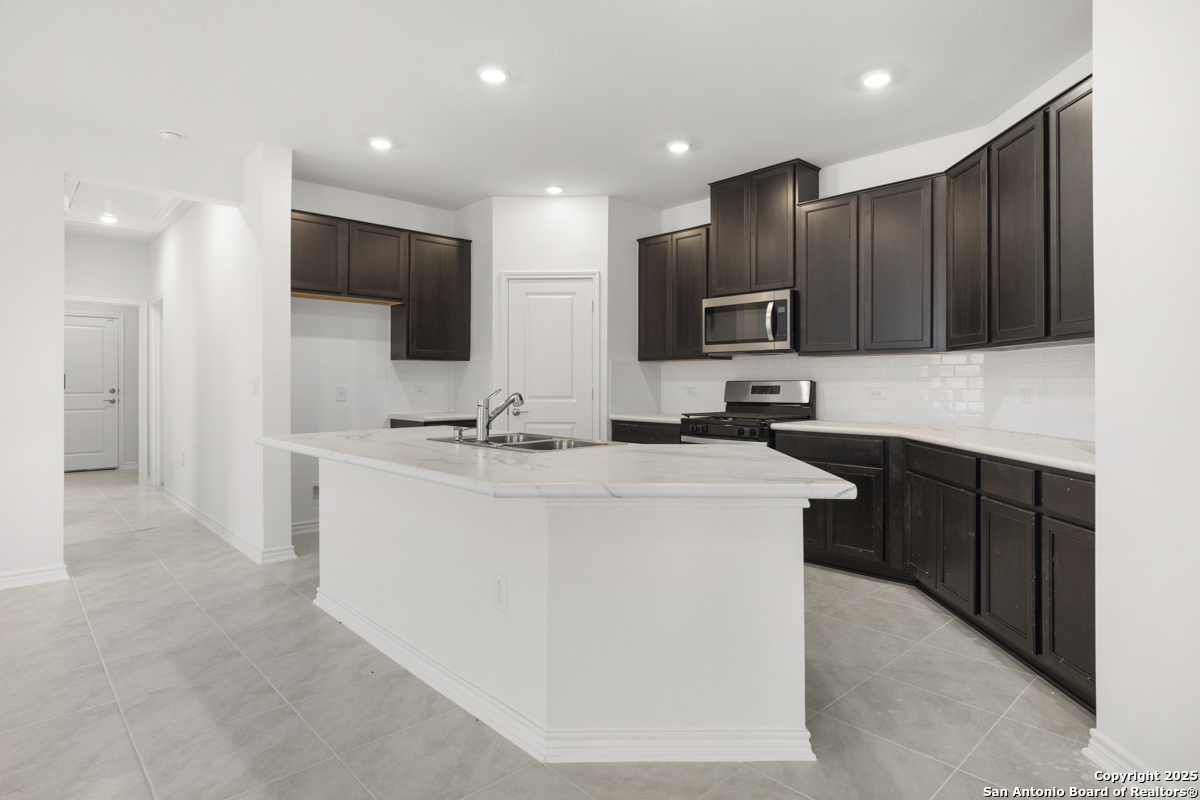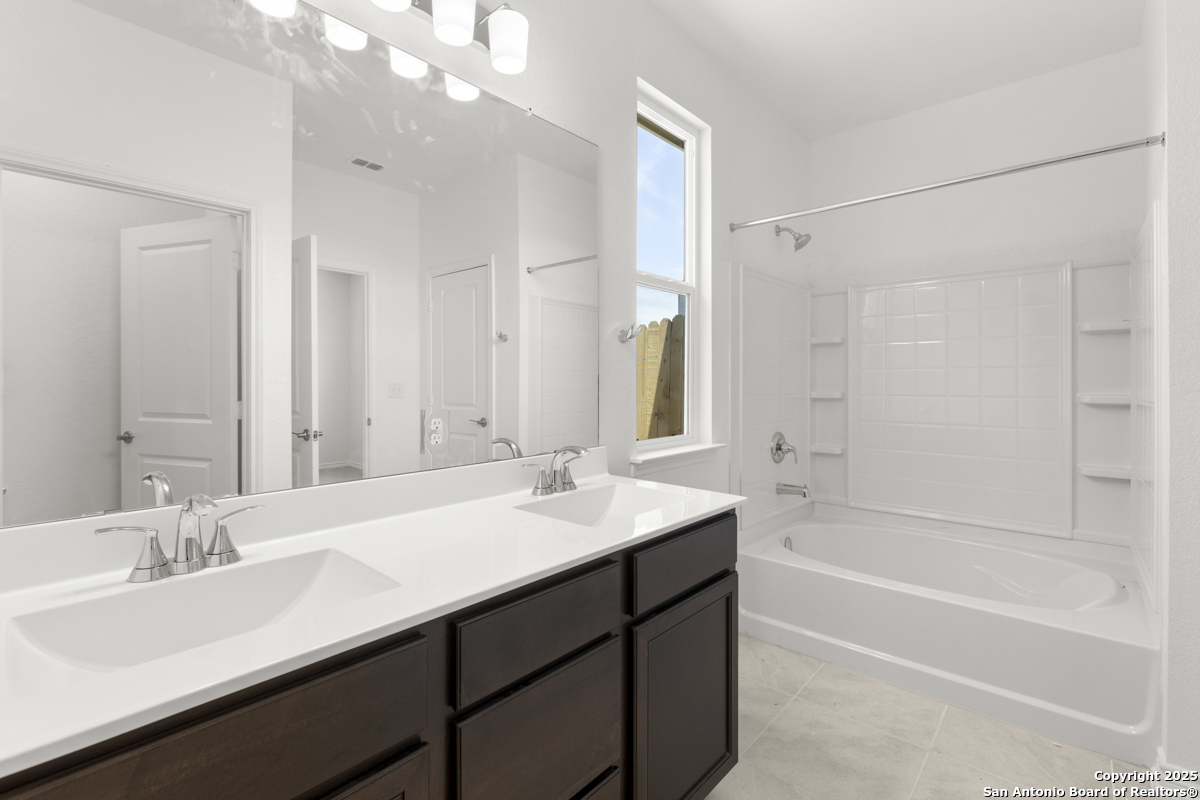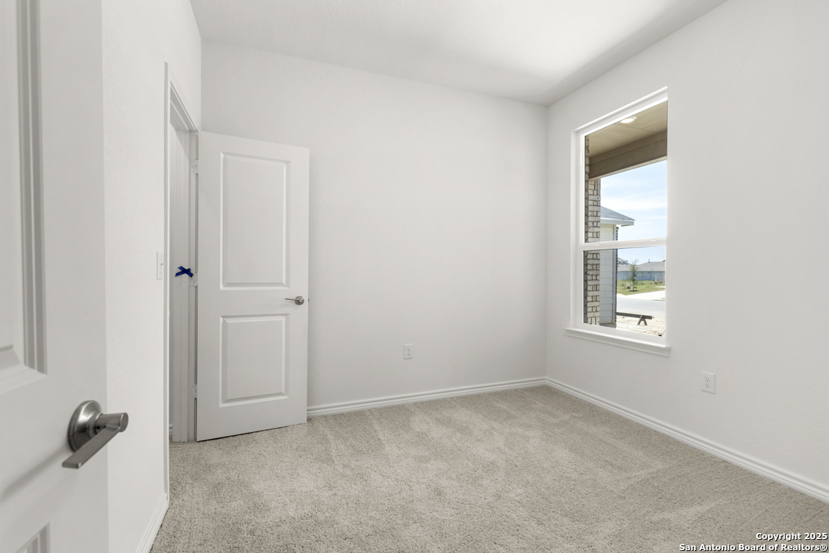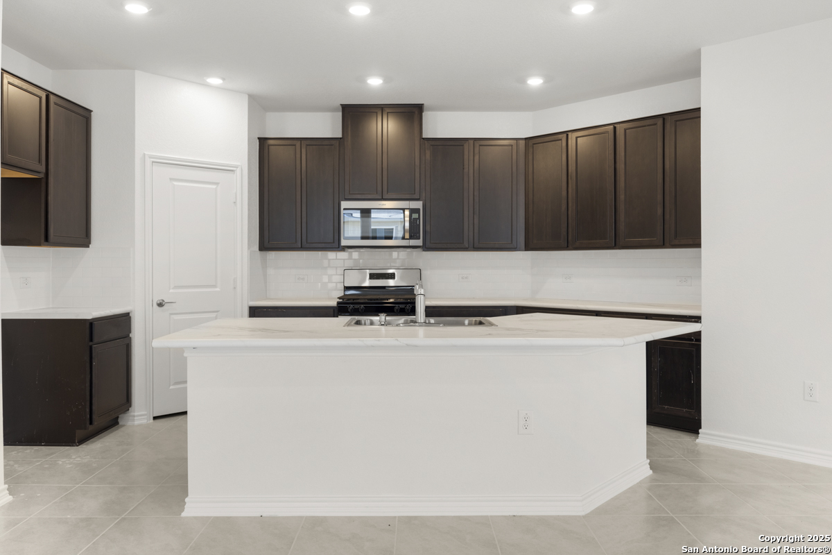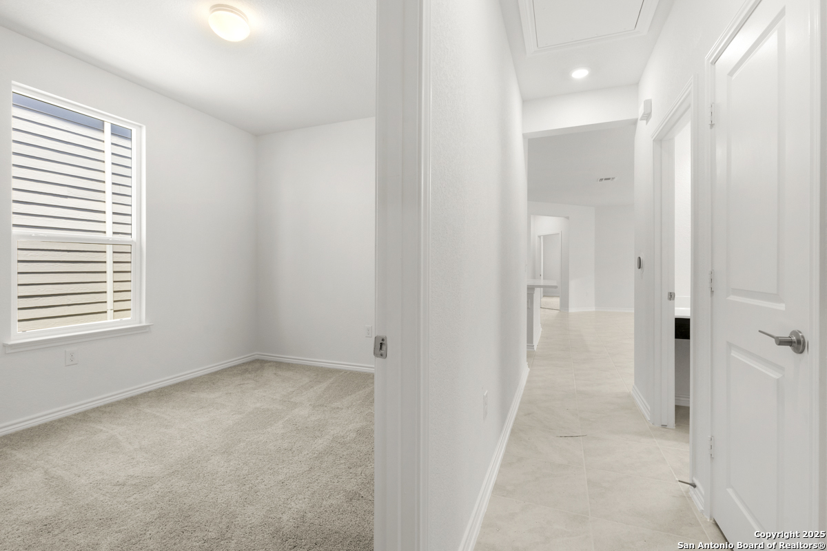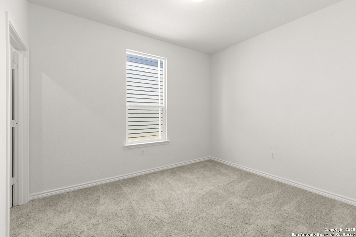 Welcome to this inviting home, where 9-ft. first-floor ceilings create an open and spacious feel throughout. The kitchen is a chef's delight, featuring Woodmont Belmont 42-in. upper cabinets, a stunning Daltile tile backsplash, and an extended breakfast bar-perfect for casual dining or entertaining. Relax in the primary bath, which boasts a luxurious 42-in. garden tub/shower combo. Decorative details such as the elegant Carrara-style entry door and Emser ceramic tile flooring add charm and durability. Additional features include a wireless security system and an exterior rear door with a convenient blind insert for privacy. Outside, the automatic sprinkler system keeps your lawn looking lush year-round.