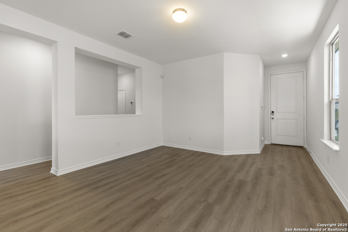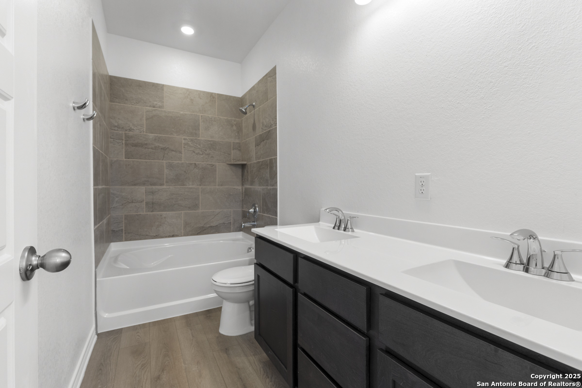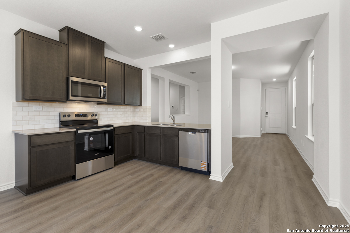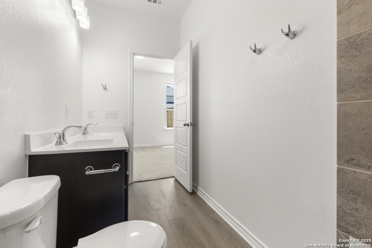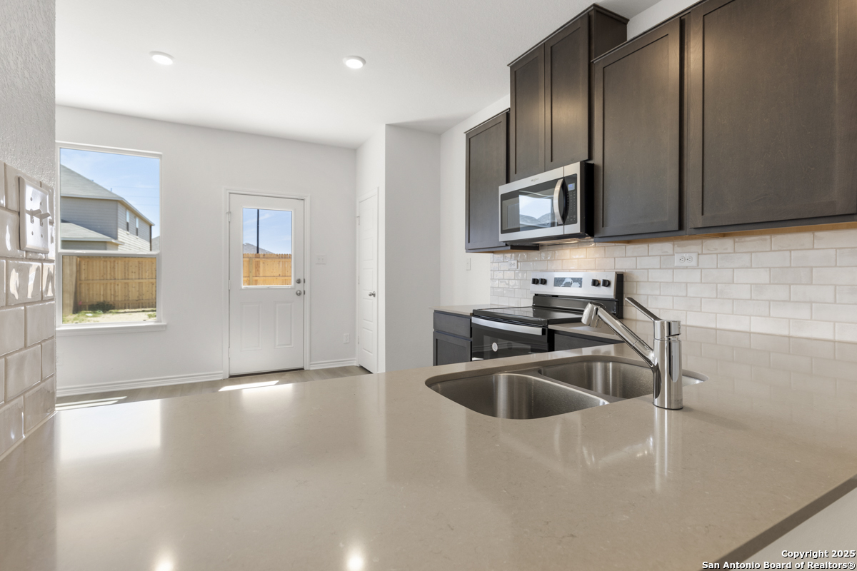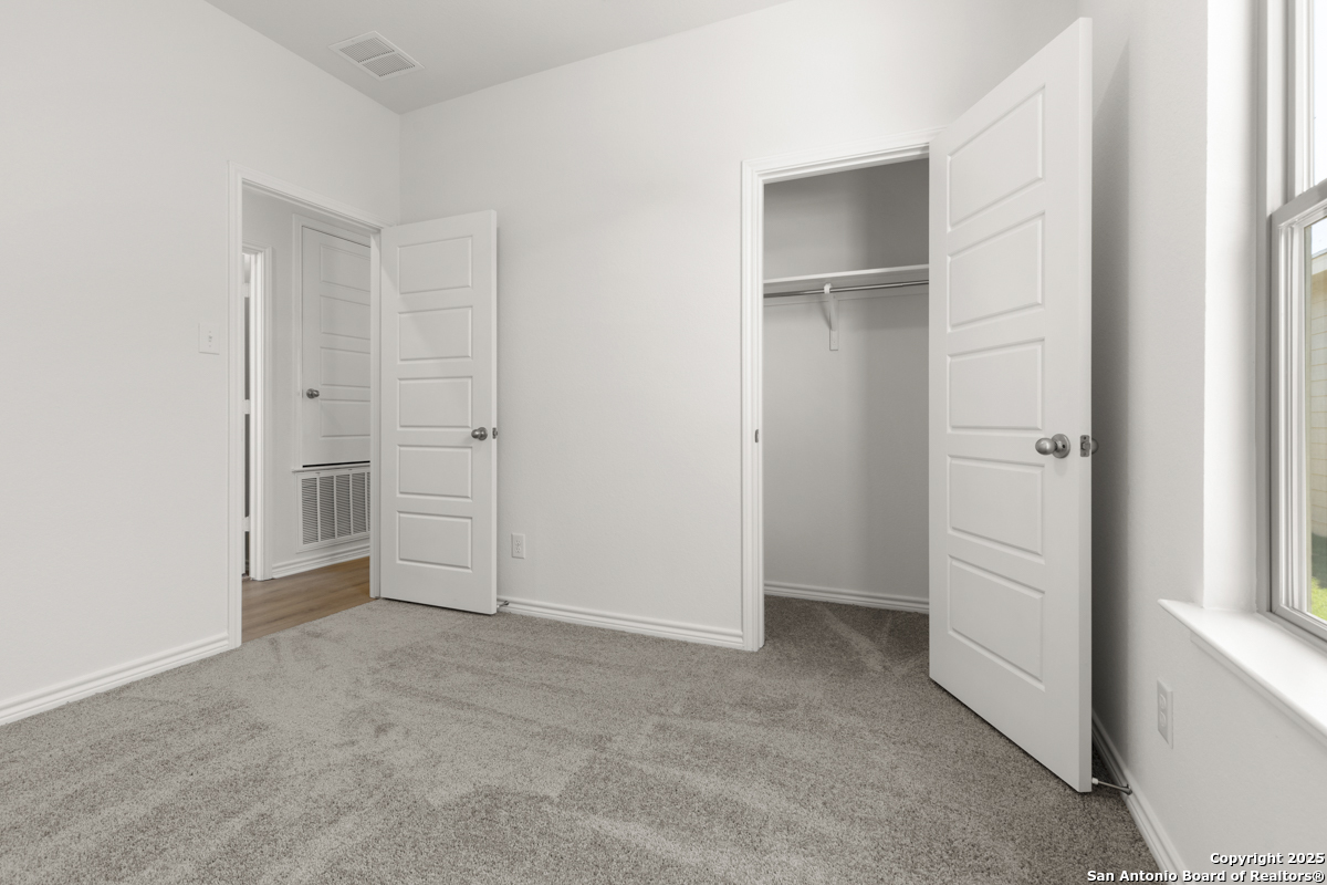 This inviting home boasts 9-ft. first-floor ceilings that enhance its spacious feel. The kitchen is a true centerpiece, featuring Woodmont Dakota Shaker-style 42-in. upper cabinets, stunning Arctic Pearl granite countertops, and an extended breakfast bar perfect for casual dining. The primary bath offers a relaxing 42-in. garden tub/shower combo, ideal for unwinding after a long day. Stylish details like a Carrara-style entry door and elegant Emser ceramic tile flooring add charm throughout. Modern conveniences include a wireless security system for peace of mind. Outdoors, enjoy the ease of an automatic sprinkler system that keeps your yard lush and beautiful year-round.