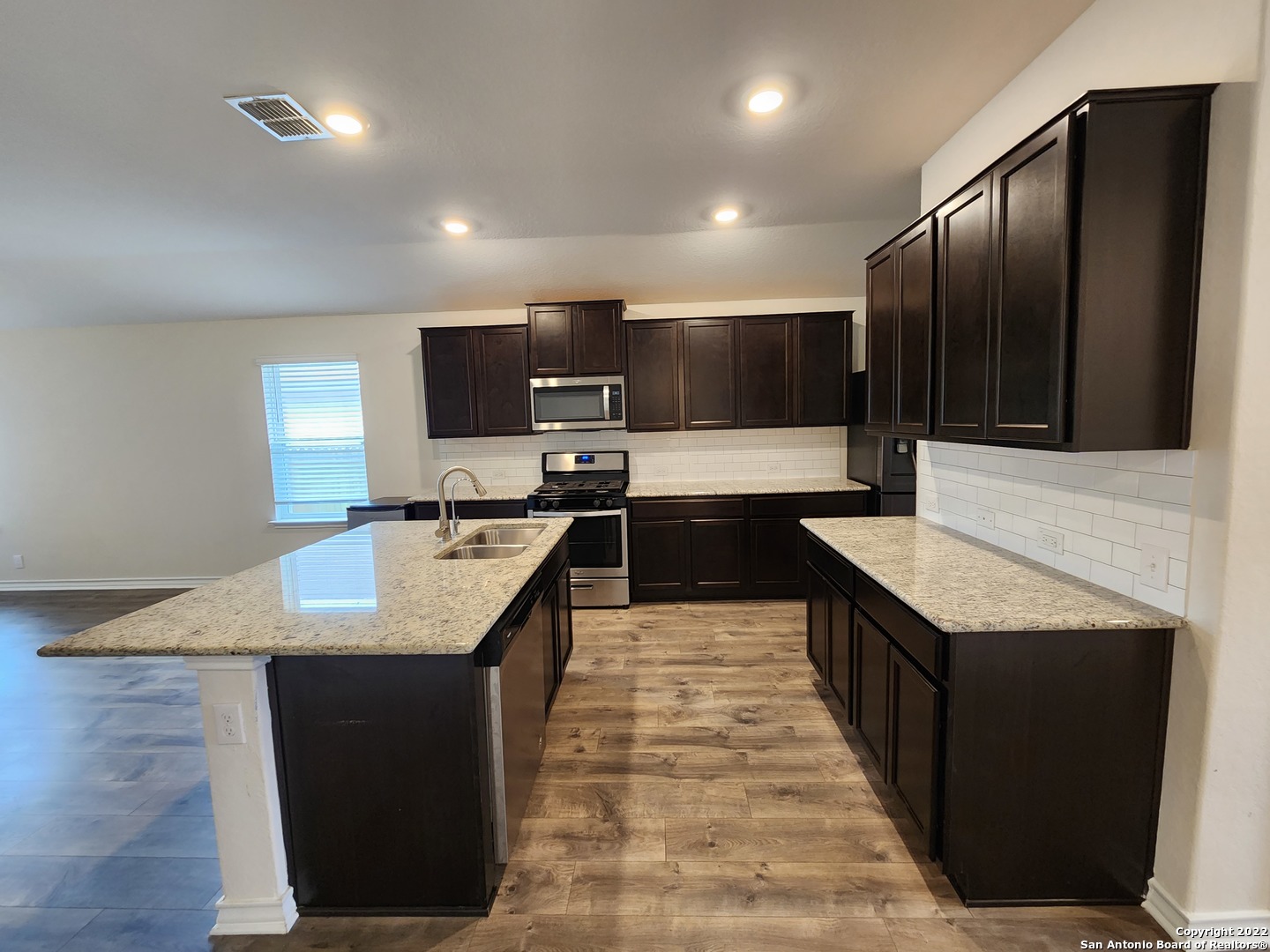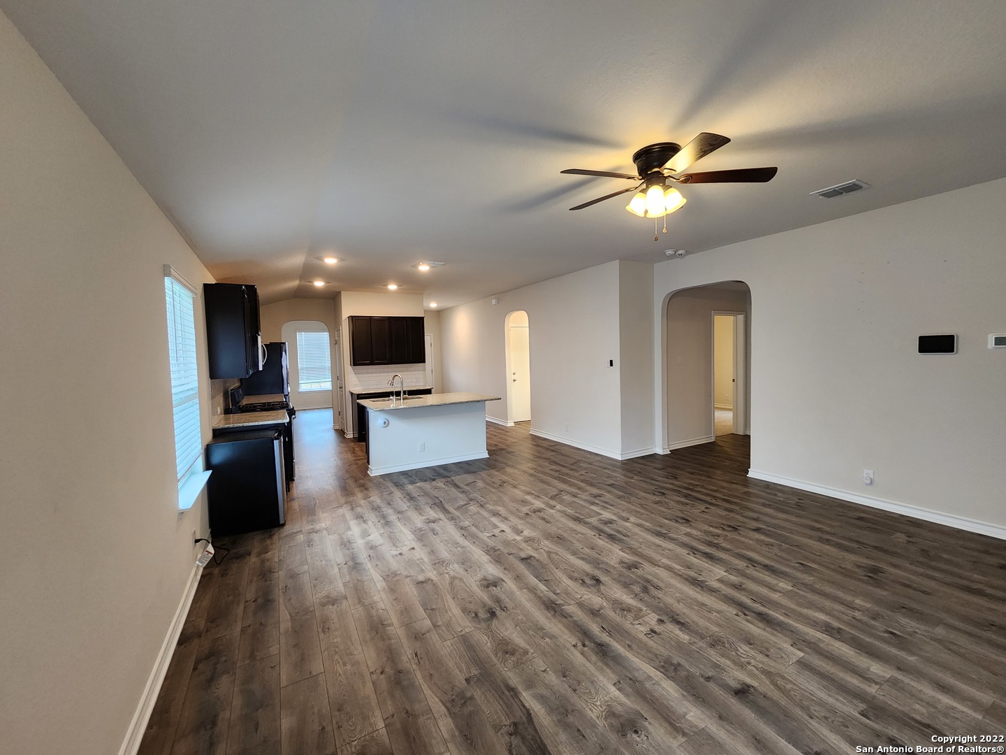 Open floor concept single-story house. Features include Solar Panels, Formal Dining Room, Granite Counters, Smart Refrigerator, Gas Cooking and Water Heater, Covered Patio and wood Deck out back. Pet Friendly.