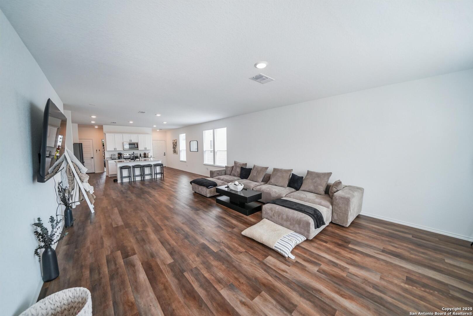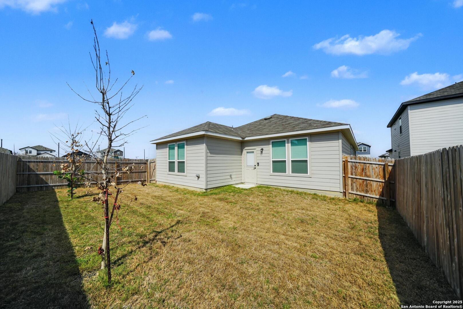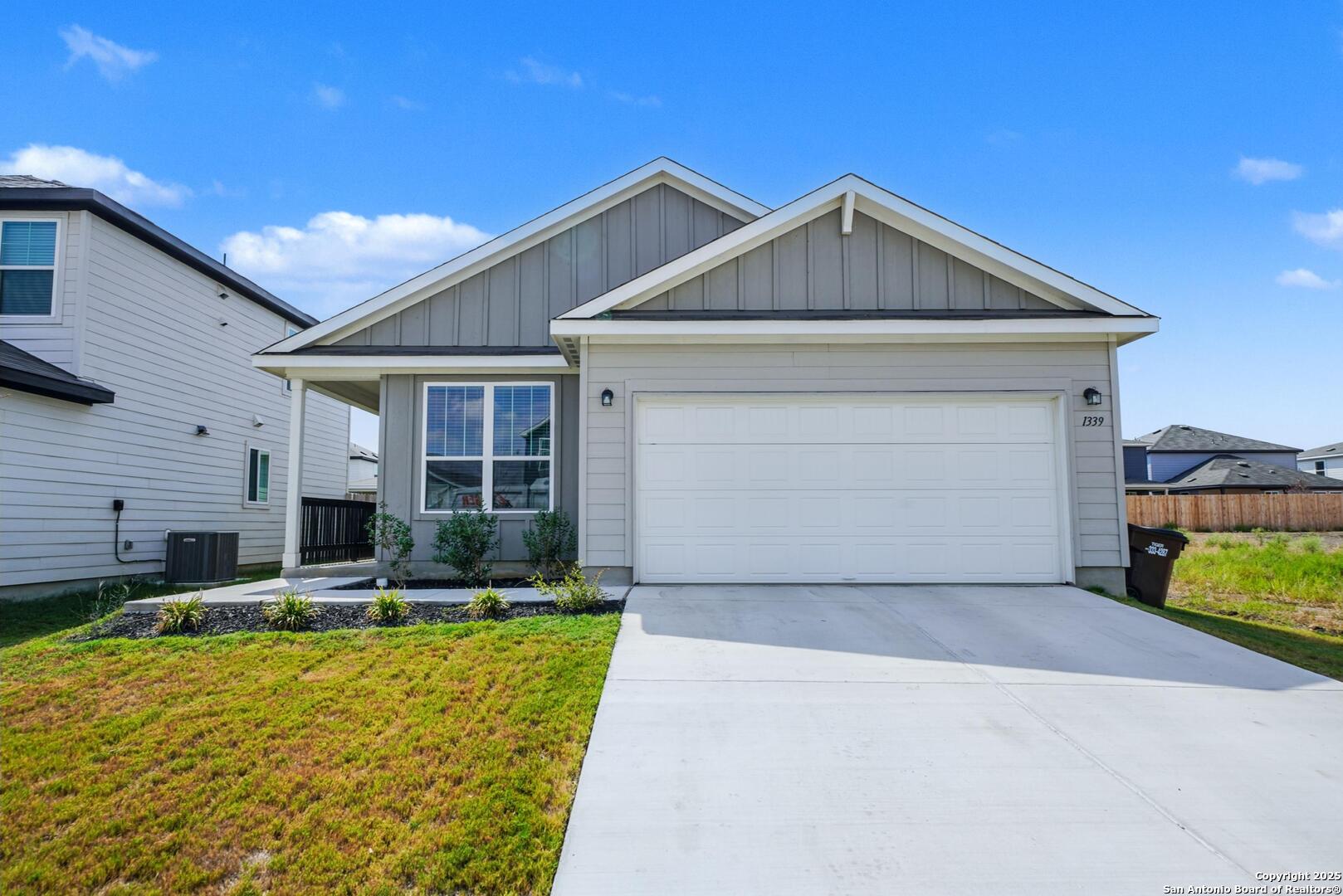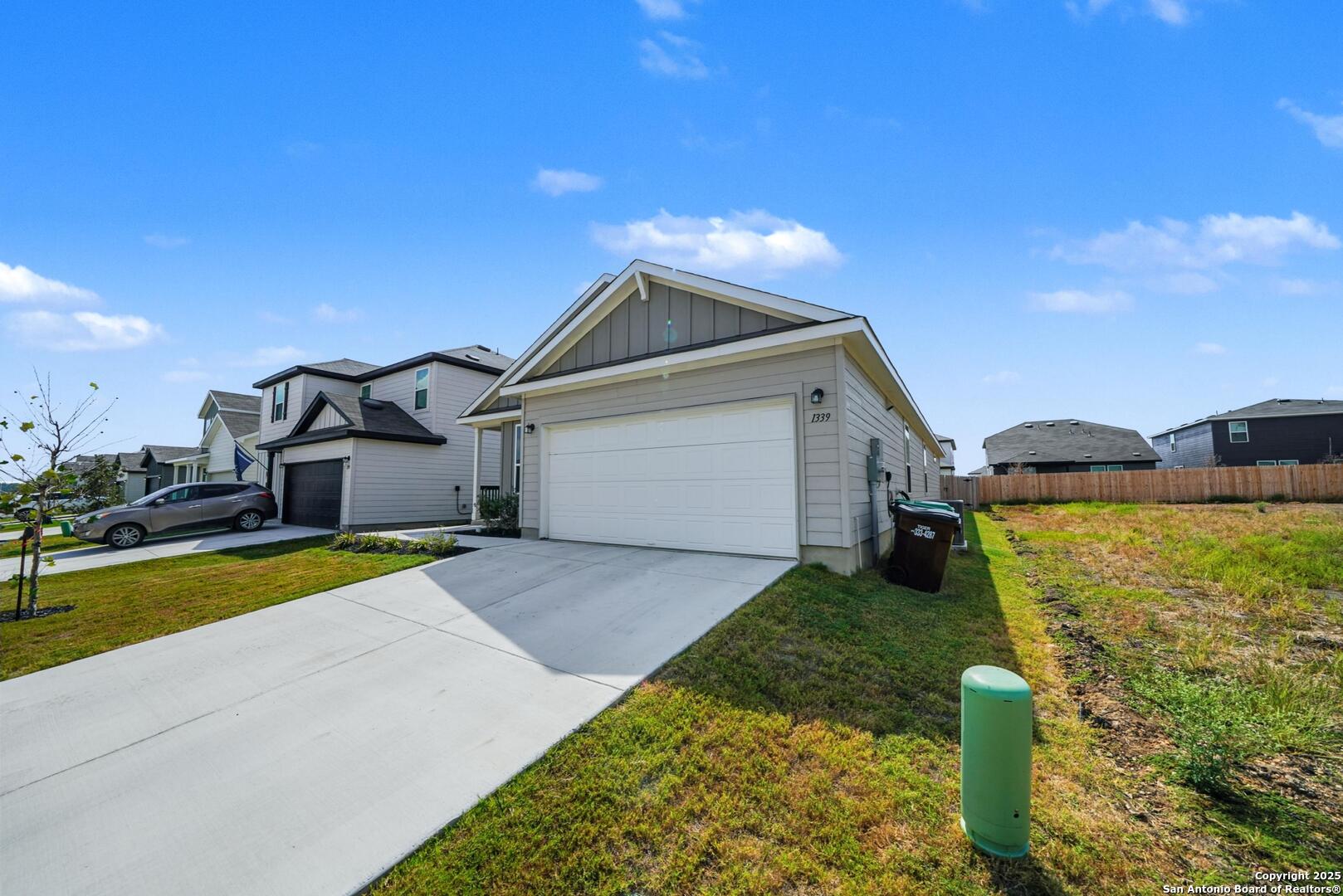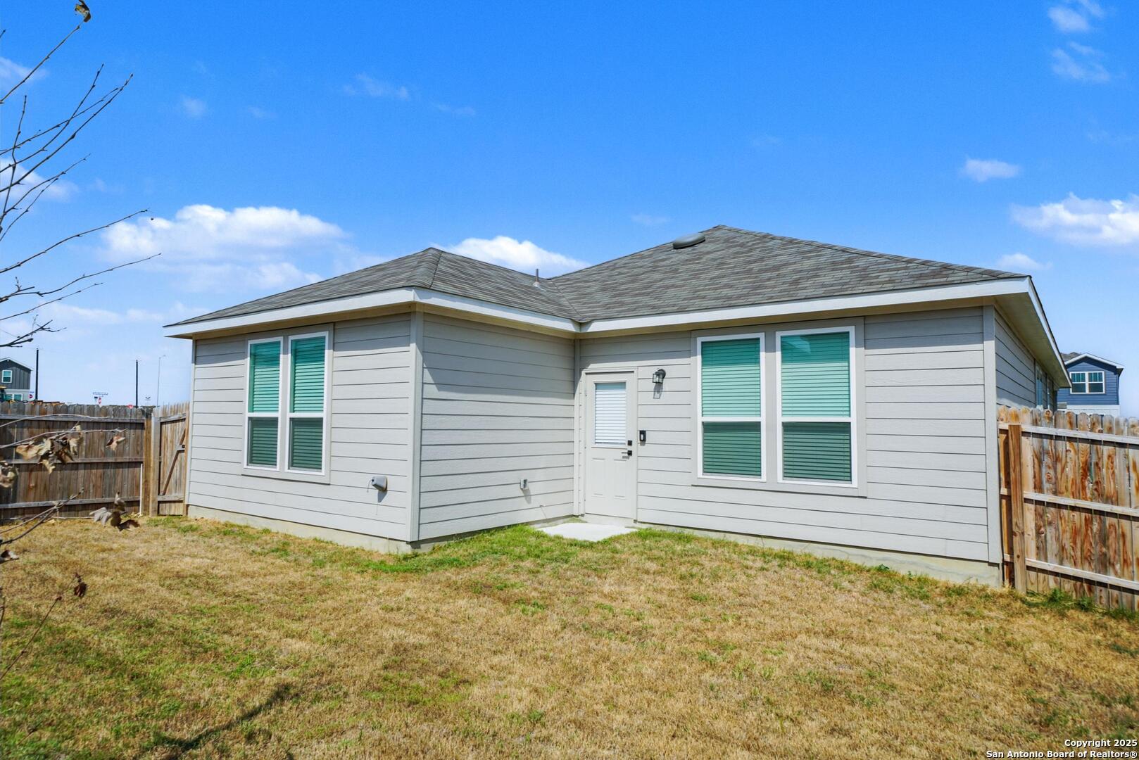 This nearly new single-story home offers 4 bedrooms and 2 bathrooms in the highly sought-after Vista Real subdivision. Step inside through the oversized entryway and into the open-concept living, dining, and kitchen areas, where stunning vinyl plank flooring and abundant natural light create a warm, inviting atmosphere. The spacious kitchen is designed with both style and functionality in mind, featuring granite countertops, upgraded shaker-style cabinets with custom pulls, a large island with an undermount sink, and matching stainless steel appliances. For added convenience, a refrigerator, washer, and dryer are included. The private master suite is thoughtfully separated from the secondary bedrooms and boasts a luxurious en-suite bathroom complete with dual vanities, a large walk-in shower, and a spacious walk-in closet. The three additional bedrooms are generously sized, providing plenty of space for family, guests, or a home office. With quick access to Loop 1604, Interstate 10, and just a short drive to Randolph AFB, this home offers both comfort and convenience. A true pleasure to show!