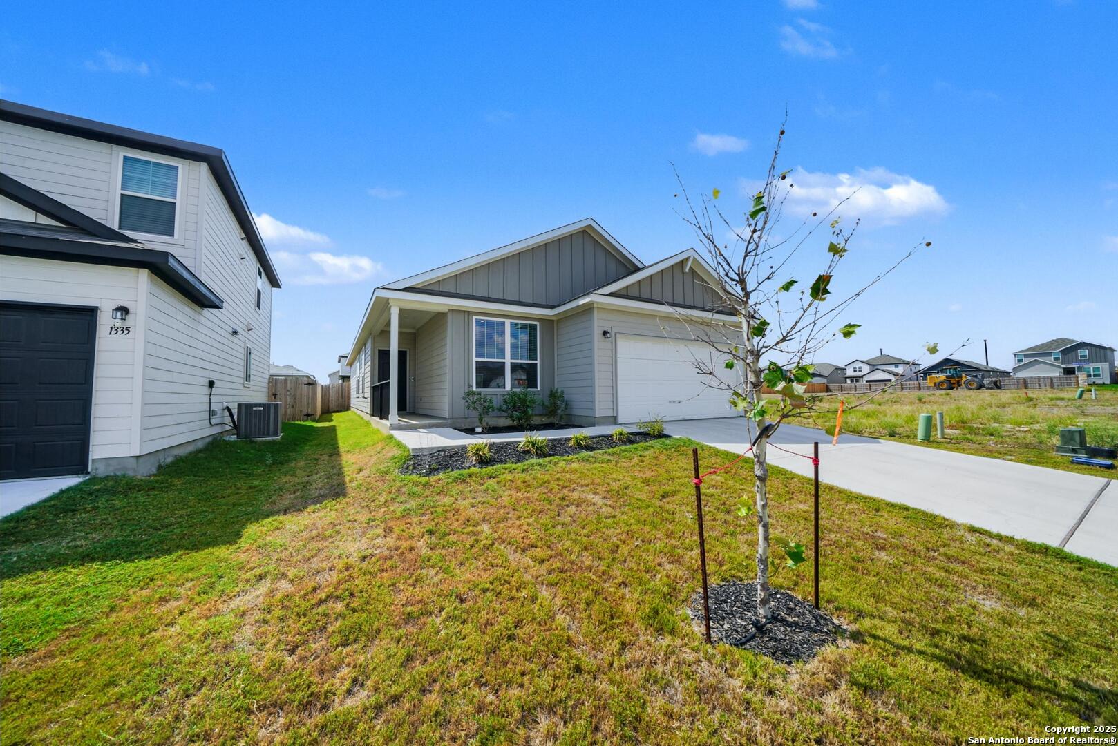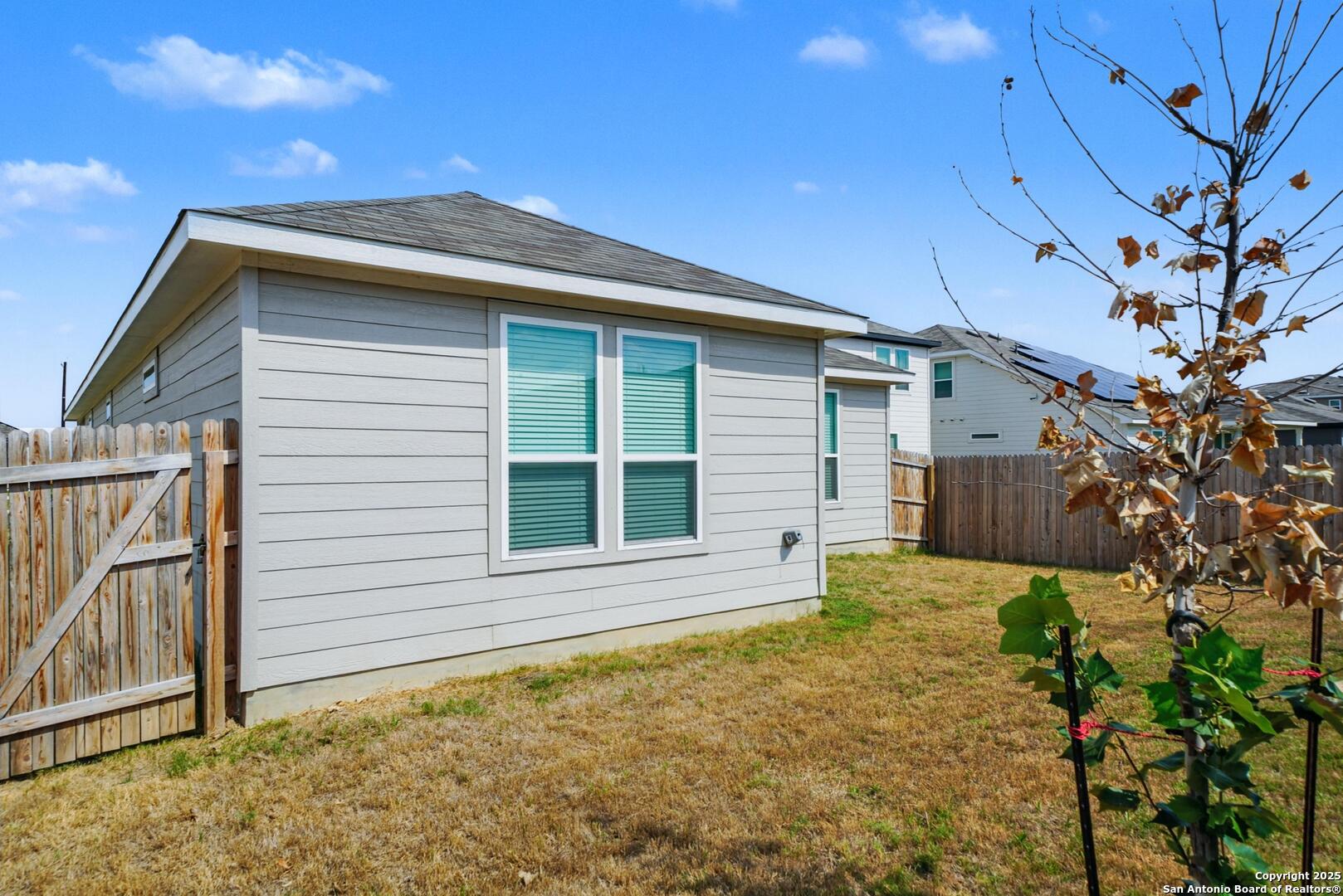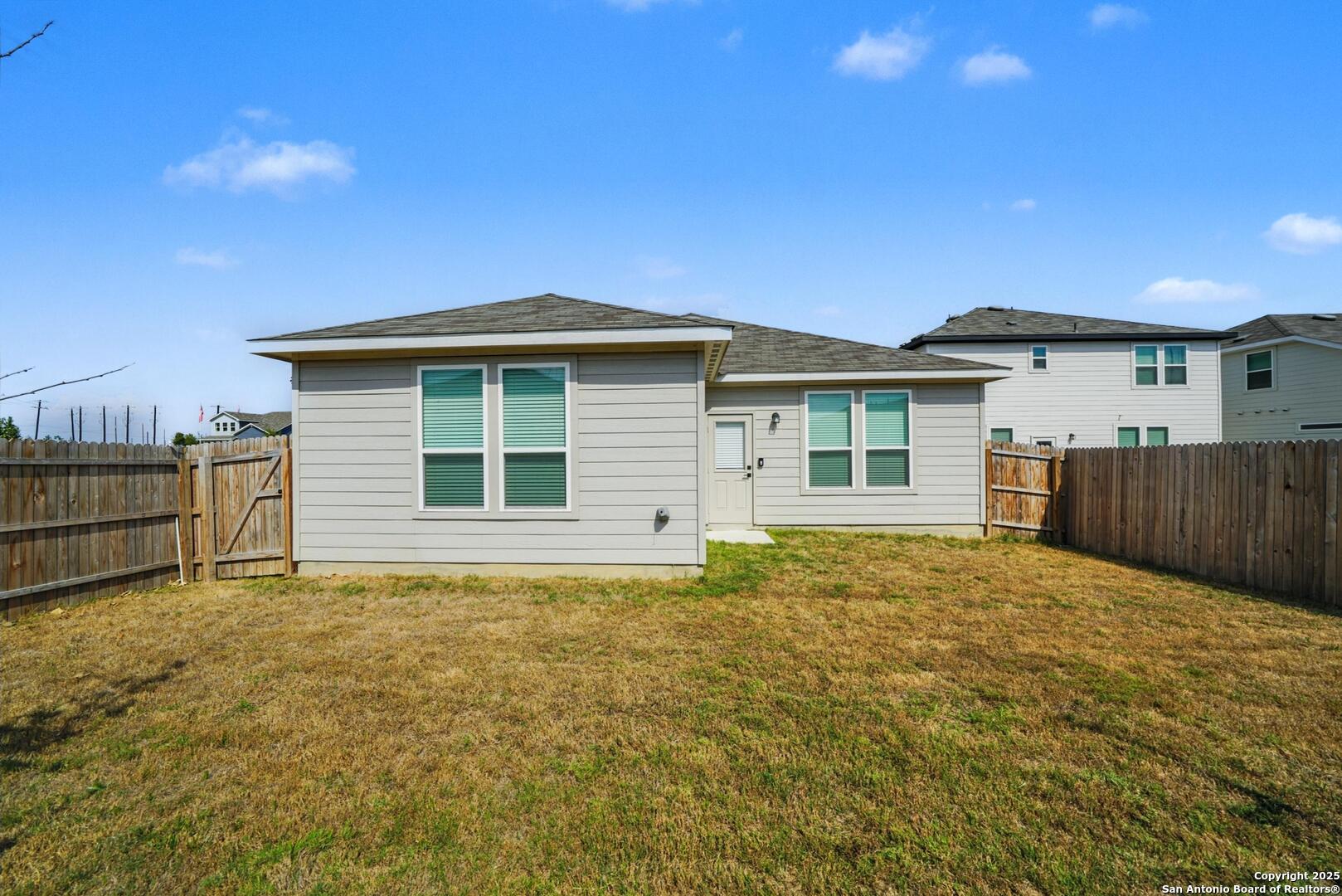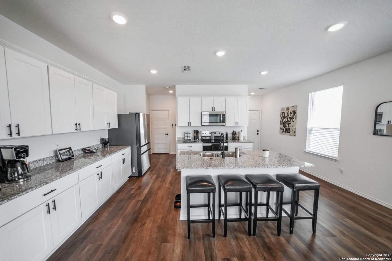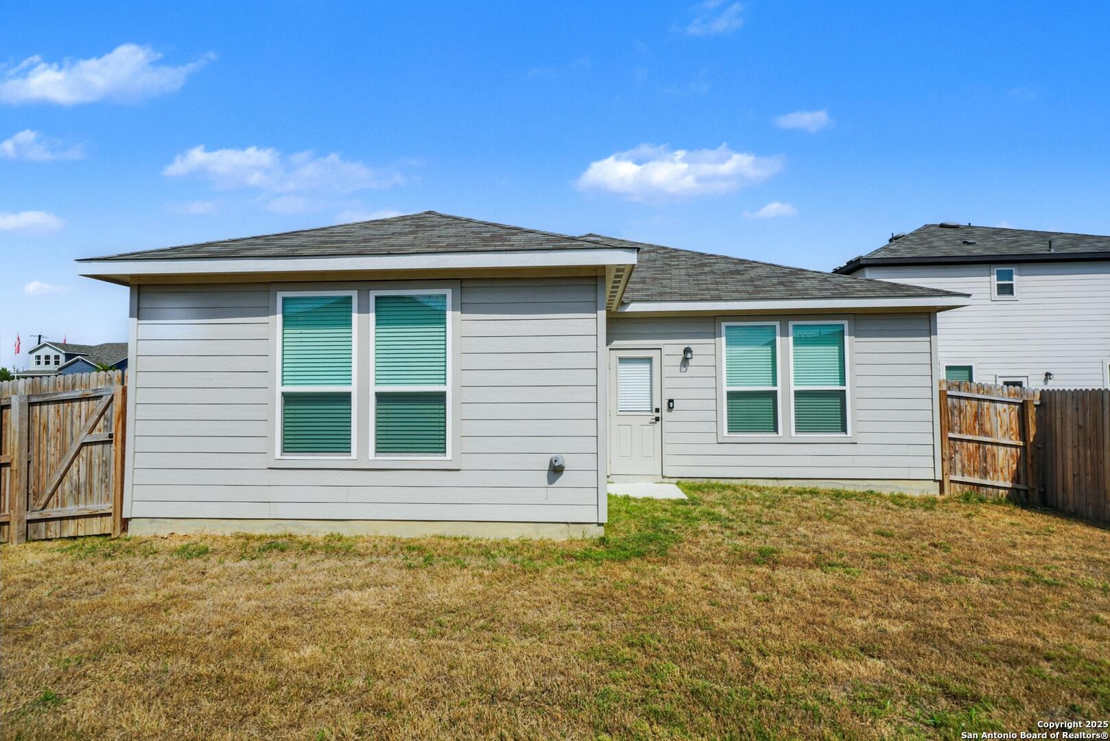 This nearly new single-story home offers 4 bedrooms and 2 bathrooms in the highly sought-after Vista Real subdivision. Step inside through the oversized entryway and into the open-concept living, dining, and kitchen areas, where stunning vinyl plank flooring and abundant natural light create a warm, inviting atmosphere. The spacious kitchen is designed with both style and functionality in mind, featuring granite countertops, upgraded shaker-style cabinets with custom pulls, a large island with an undermount sink, and matching stainless steel appliances. For added convenience, a refrigerator, washer, and dryer are included. The private master suite is thoughtfully separated from the secondary bedrooms and boasts a luxurious en-suite bathroom complete with dual vanities, a large walk-in shower, and a spacious walk-in closet. The three additional bedrooms are generously sized, providing plenty of space for family, guests, or a home office. With quick access to Loop 1604, Interstate 10, and just a short drive to Randolph AFB, this home offers both comfort and convenience. A true pleasure to show!