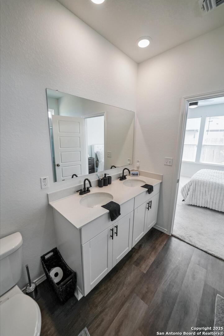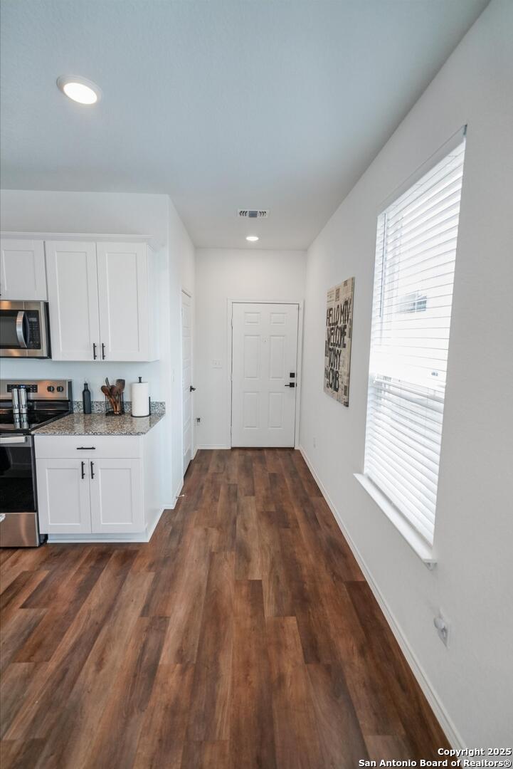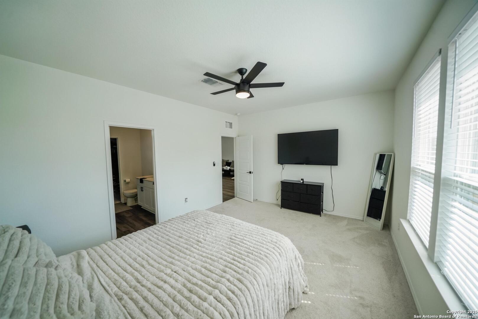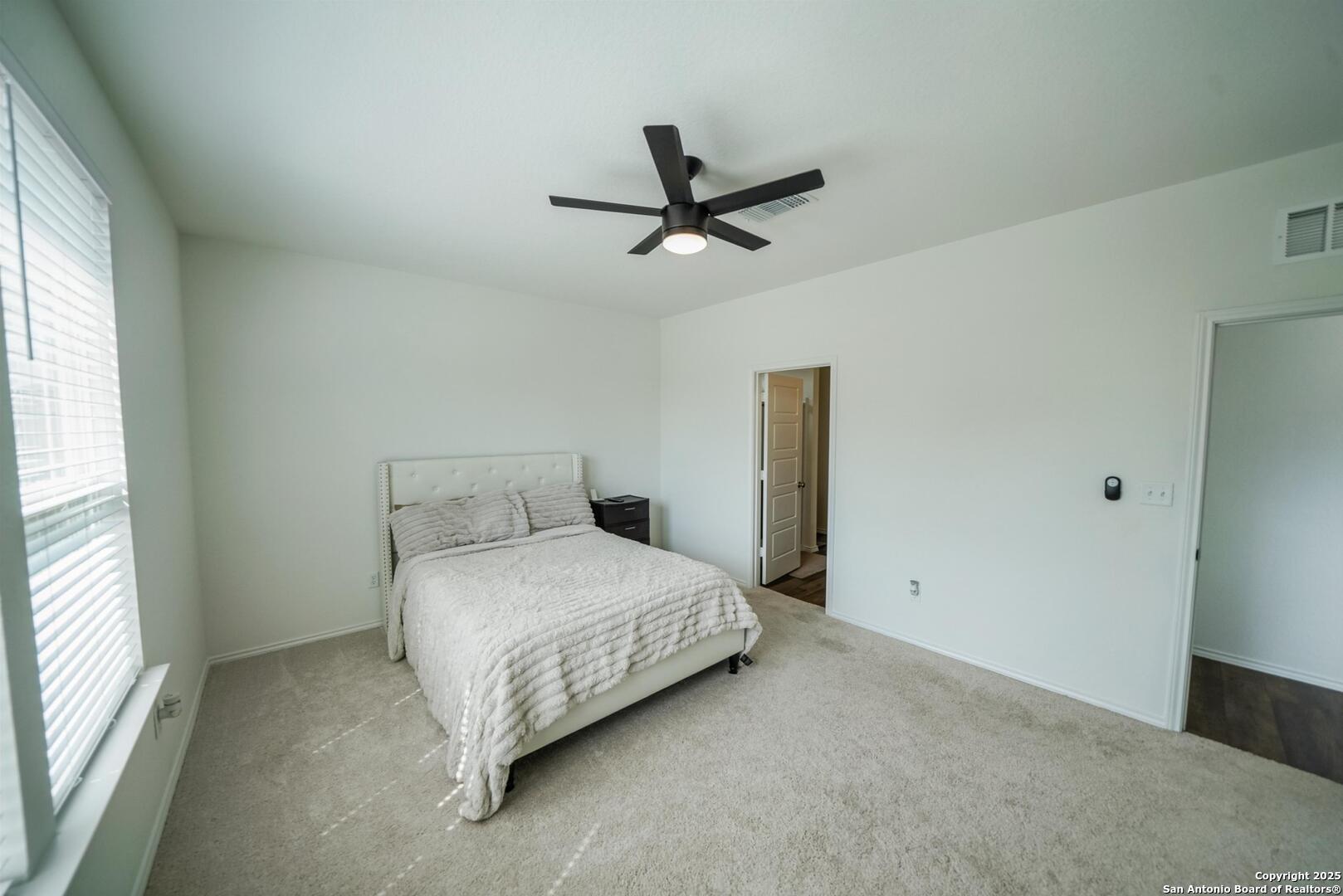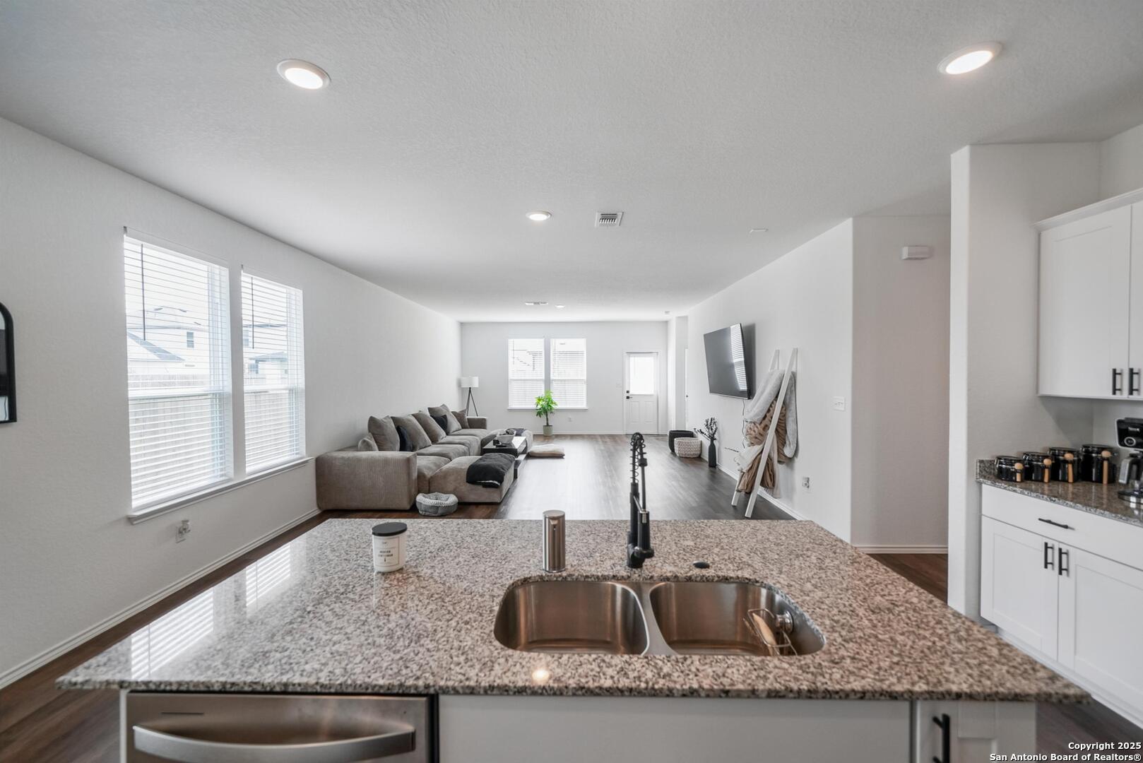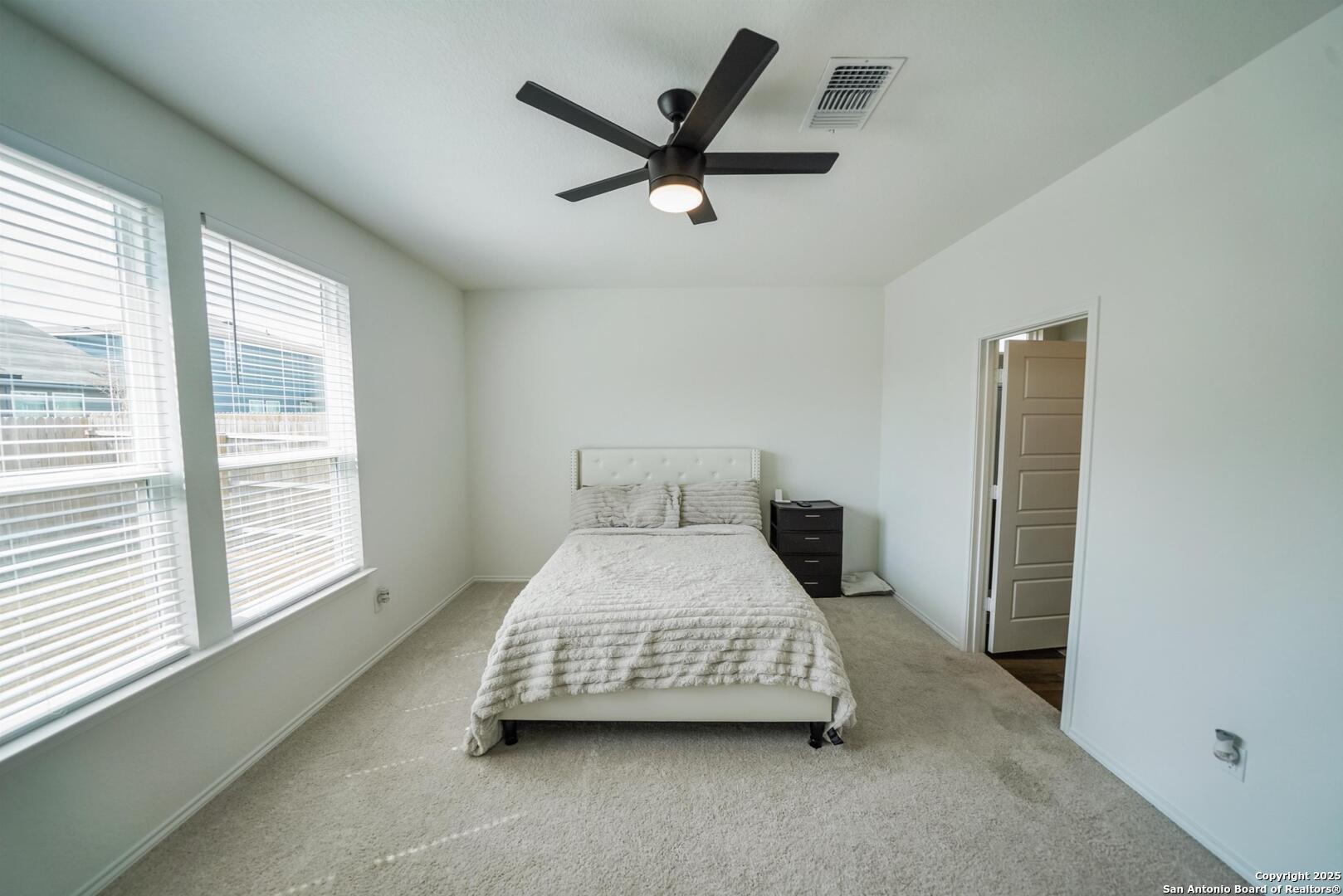 This nearly new single-story home offers 4 bedrooms and 2 bathrooms in the highly sought-after Vista Real subdivision. Step inside through the oversized entryway and into the open-concept living, dining, and kitchen areas, where stunning vinyl plank flooring and abundant natural light create a warm, inviting atmosphere. The spacious kitchen is designed with both style and functionality in mind, featuring granite countertops, upgraded shaker-style cabinets with custom pulls, a large island with an undermount sink, and matching stainless steel appliances. For added convenience, a refrigerator, washer, and dryer are included. The private master suite is thoughtfully separated from the secondary bedrooms and boasts a luxurious en-suite bathroom complete with dual vanities, a large walk-in shower, and a spacious walk-in closet. The three additional bedrooms are generously sized, providing plenty of space for family, guests, or a home office. With quick access to Loop 1604, Interstate 10, and just a short drive to Randolph AFB, this home offers both comfort and convenience. A true pleasure to show!