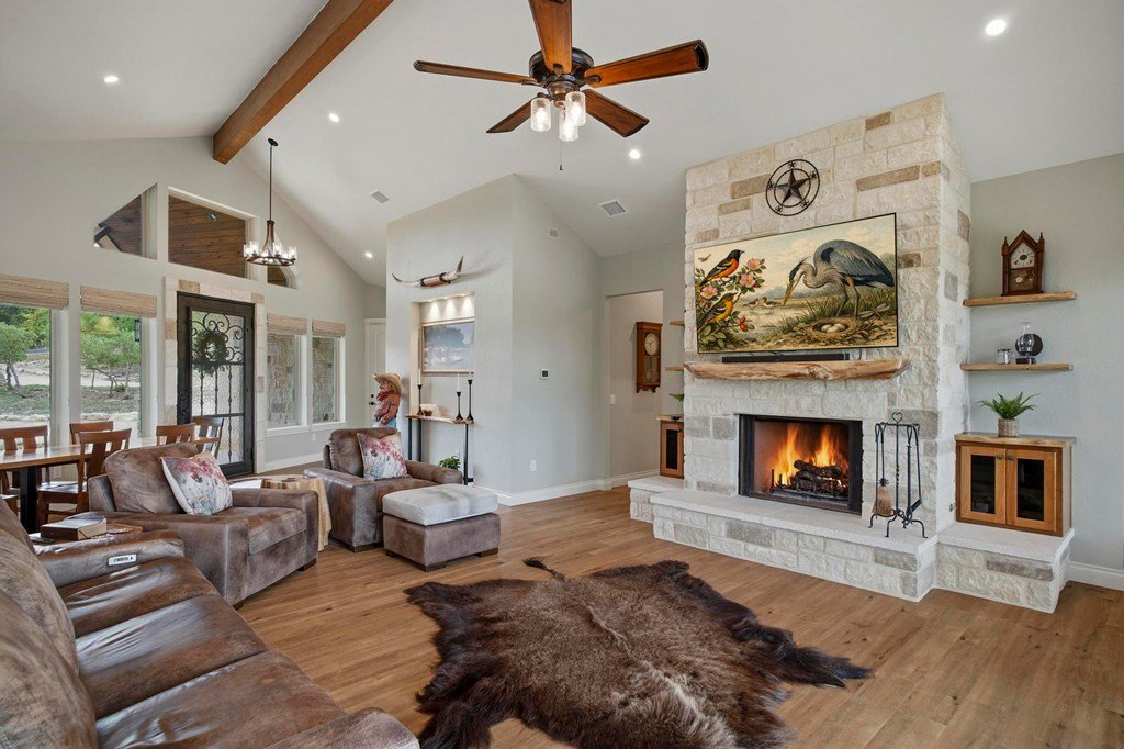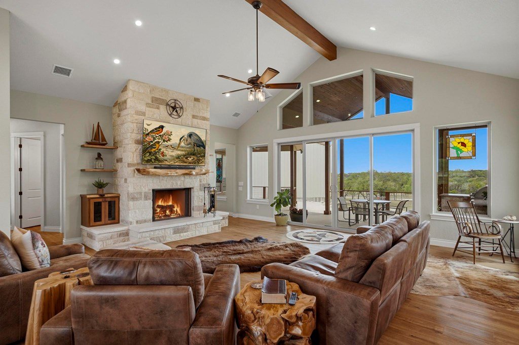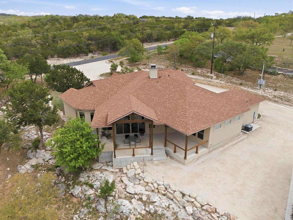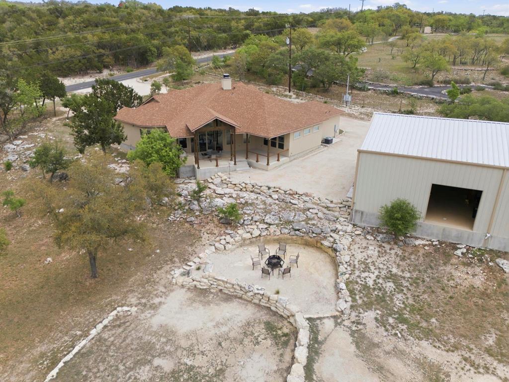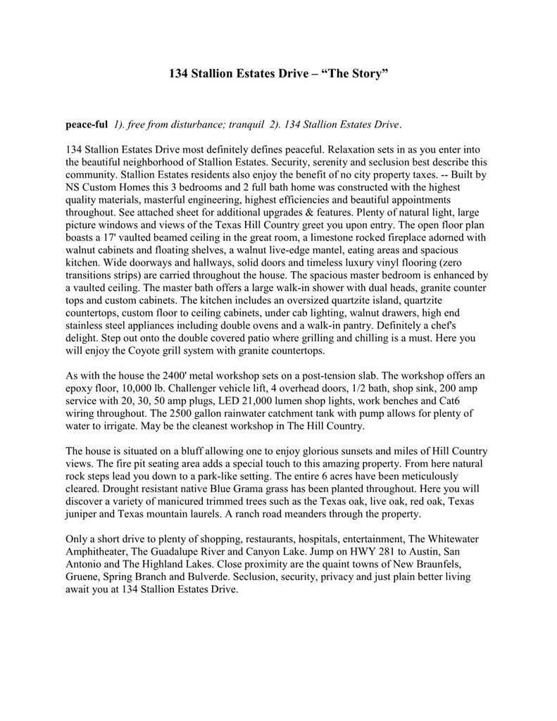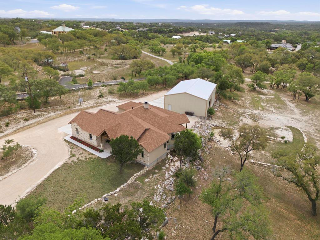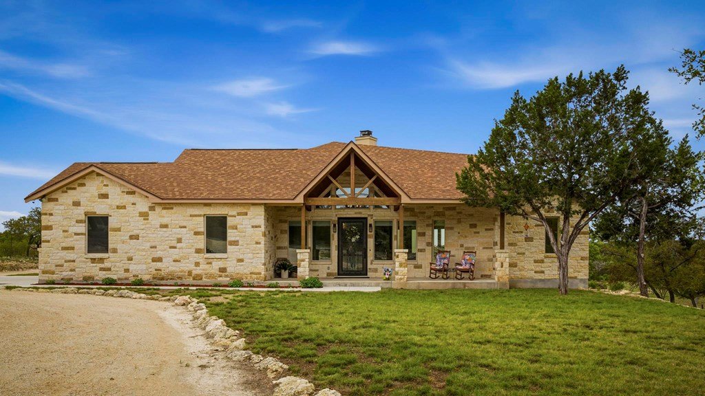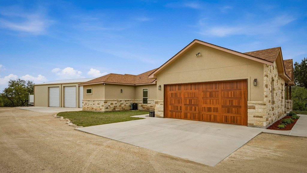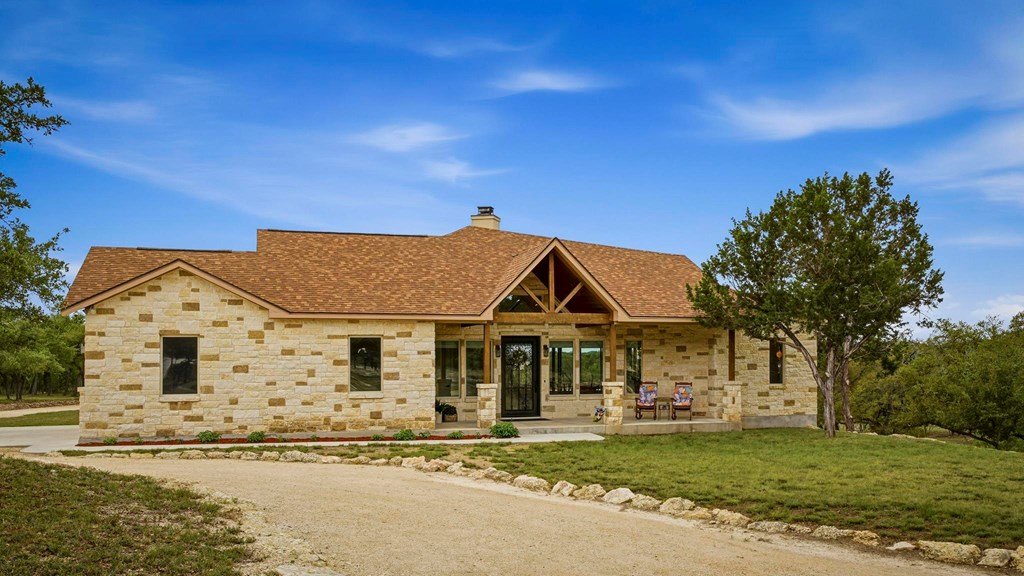 peaceful 1). free from disturbance; tranquil 2). 134 Stallion Estates Drive. 134 Stallion Estates Drive most definitely defines peaceful. Relaxation sets in as you enter into the beautiful neighborhood of Stallion Estates. Security, serenity and seclusion best describe this community. Stallion Estates residents also enjoy the benefit of no city property taxes. -- Built by NS Custom Homes this 3 bedrooms and 2 full bath home was constructed with the highest quality materials, masterful engineering, highest efficiencies and beautiful appointments throughout. See attached sheet for additional upgrades & features. Plenty of natural light, large picture windows and views of the Texas Hill Country greet you upon entry. The open floor plan boasts a 17' vaulted beamed ceiling in the great room, a limestone rocked fireplace adorned with walnut cabinets and floating shelves, a walnut live-edge mantel, eating areas and spacious kitchen. Wide doorways and hallways, solid doors and timeless luxury vinyl flooring (zero transitions strips) are carried throughout the house. The spacious master bedroom is enhanced by a vaulted ceiling. The master bath offers a large walk-in shower with dual heads, granite counter tops and custom cabinets. The kitchen includes an oversized quartzite island, quartzite countertops, custom floor to ceiling cabinets, under cab lighting, walnut drawers, high end stainless steel appliances including double ovens and a walk-in pantry. Definitely a chef's delight. Step out onto the double covered patio where grilling and chilling is a must. Here you will enjoy the Coyote grill system with granite countertops. -- As with the house the 2400' metal workshop sets on a post-tension slab. The workshop offers an epoxy floor, 10,000 lb. Challenger vehicle lift, 4 overhead doors, 1/2 bath, shop sink, 200 amp service with 20, 30, 50 amp plugs, LED 21,000 lumen shop lights, work benches and Cat6 wiring throughout. The 2500 gallon rainwater catchment tank with pump allows for plenty of water to irrigate. May be the cleanest workshop in The Hill Country. -- The house is situated on a bluff allowing one to enjoy glorious sunsets and miles of Hill Country views. The fire pit seating area adds a special touch to this amazing property. From here natural rock steps lead you down to a park-like setting. The entire 6 acres have been meticulously cleared. Drought resistant native Blue Grama grass has been planted throughout. Here you will discover a variety of manicured trimmed trees such as the Texas oak, live oak, red oak, Texas juniper and Texas mountain laurels. A ranch road meanders through the property. -- Only a short drive to plenty of shopping, restaurants, hospitals, entertainment, The Whitewater Amphitheater, The Guadalupe River and Canyon Lake. Jump on HWY 281 to Austin, San Antonio and The Highland Lakes. Close proximity are the quaint towns of New Braunfels, Gruene, Spring Branch and Bulverde. Seclusion, security, privacy and just plain better living await you at 134 Stallion Estates Drive.