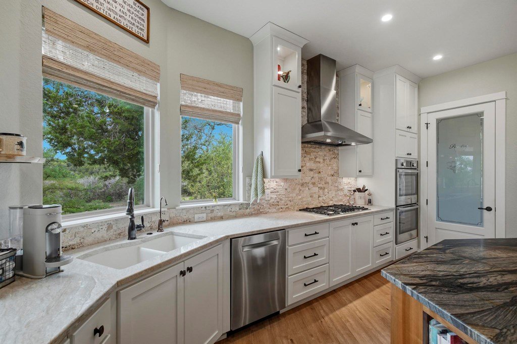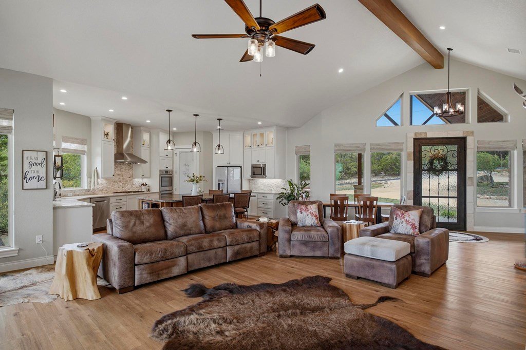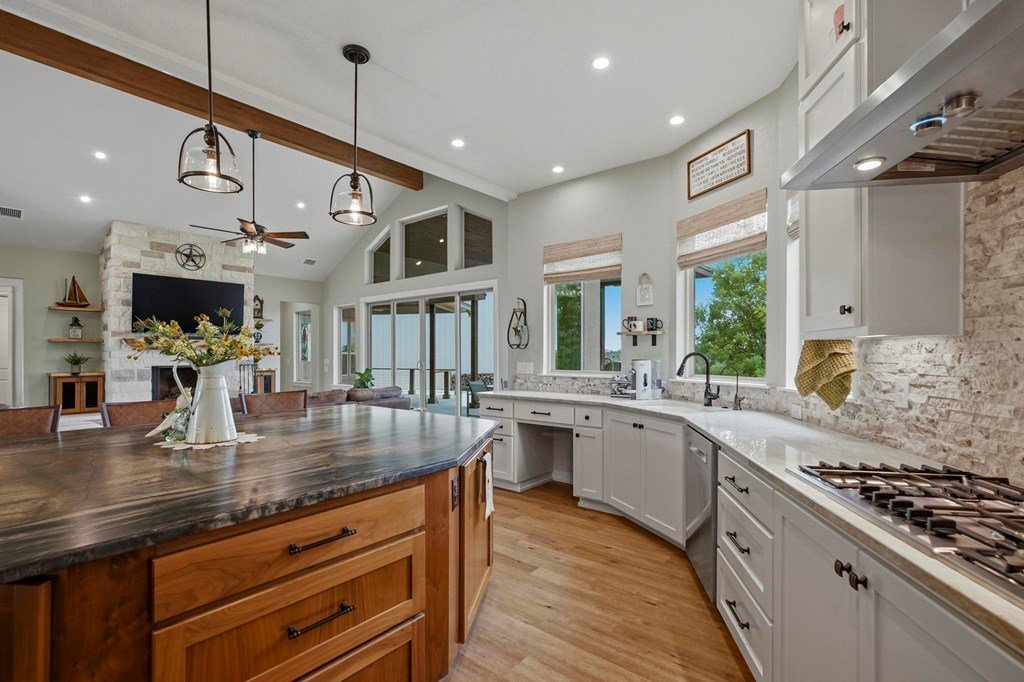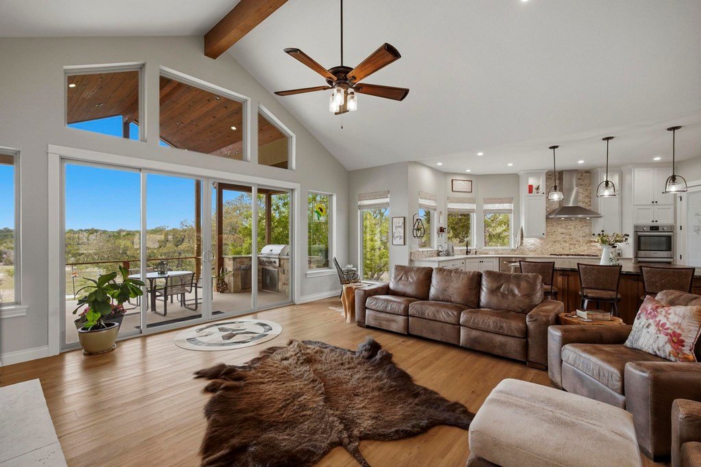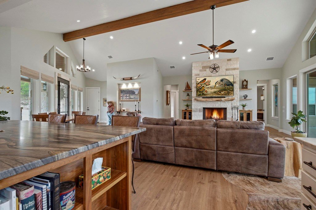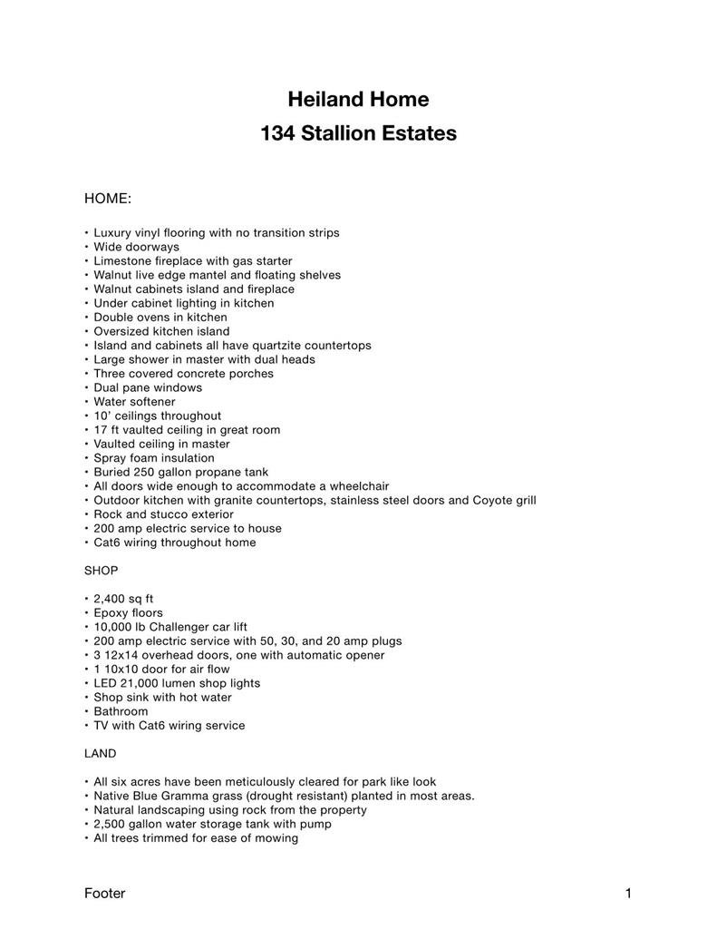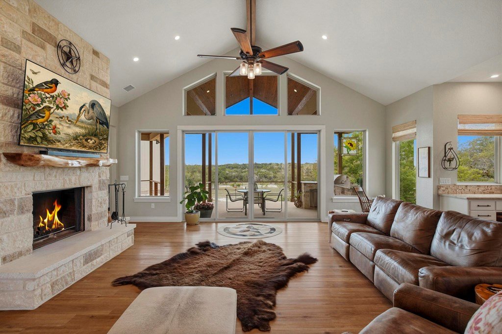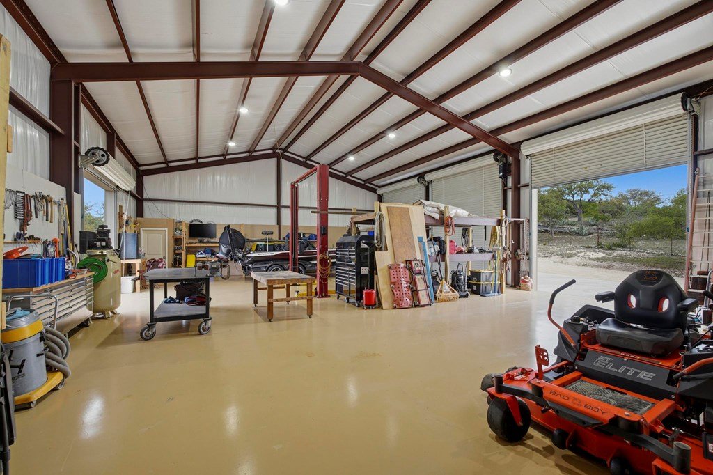 peaceful 1). free from disturbance; tranquil 2). 134 Stallion Estates Drive. 134 Stallion Estates Drive most definitely defines peaceful. Relaxation sets in as you enter into the beautiful neighborhood of Stallion Estates. Security, serenity and seclusion best describe this community. Stallion Estates residents also enjoy the benefit of no city property taxes. -- Built by NS Custom Homes this 3 bedrooms and 2 full bath home was constructed with the highest quality materials, masterful engineering, highest efficiencies and beautiful appointments throughout. See attached sheet for additional upgrades & features. Plenty of natural light, large picture windows and views of the Texas Hill Country greet you upon entry. The open floor plan boasts a 17' vaulted beamed ceiling in the great room, a limestone rocked fireplace adorned with walnut cabinets and floating shelves, a walnut live-edge mantel, eating areas and spacious kitchen. Wide doorways and hallways, solid doors and timeless luxury vinyl flooring (zero transitions strips) are carried throughout the house. The spacious master bedroom is enhanced by a vaulted ceiling. The master bath offers a large walk-in shower with dual heads, granite counter tops and custom cabinets. The kitchen includes an oversized quartzite island, quartzite countertops, custom floor to ceiling cabinets, under cab lighting, walnut drawers, high end stainless steel appliances including double ovens and a walk-in pantry. Definitely a chef's delight. Step out onto the double covered patio where grilling and chilling is a must. Here you will enjoy the Coyote grill system with granite countertops. -- As with the house the 2400' metal workshop sets on a post-tension slab. The workshop offers an epoxy floor, 10,000 lb. Challenger vehicle lift, 4 overhead doors, 1/2 bath, shop sink, 200 amp service with 20, 30, 50 amp plugs, LED 21,000 lumen shop lights, work benches and Cat6 wiring throughout. The 2500 gallon rainwater catchment tank with pump allows for plenty of water to irrigate. May be the cleanest workshop in The Hill Country. -- The house is situated on a bluff allowing one to enjoy glorious sunsets and miles of Hill Country views. The fire pit seating area adds a special touch to this amazing property. From here natural rock steps lead you down to a park-like setting. The entire 6 acres have been meticulously cleared. Drought resistant native Blue Grama grass has been planted throughout. Here you will discover a variety of manicured trimmed trees such as the Texas oak, live oak, red oak, Texas juniper and Texas mountain laurels. A ranch road meanders through the property. -- Only a short drive to plenty of shopping, restaurants, hospitals, entertainment, The Whitewater Amphitheater, The Guadalupe River and Canyon Lake. Jump on HWY 281 to Austin, San Antonio and The Highland Lakes. Close proximity are the quaint towns of New Braunfels, Gruene, Spring Branch and Bulverde. Seclusion, security, privacy and just plain better living await you at 134 Stallion Estates Drive.