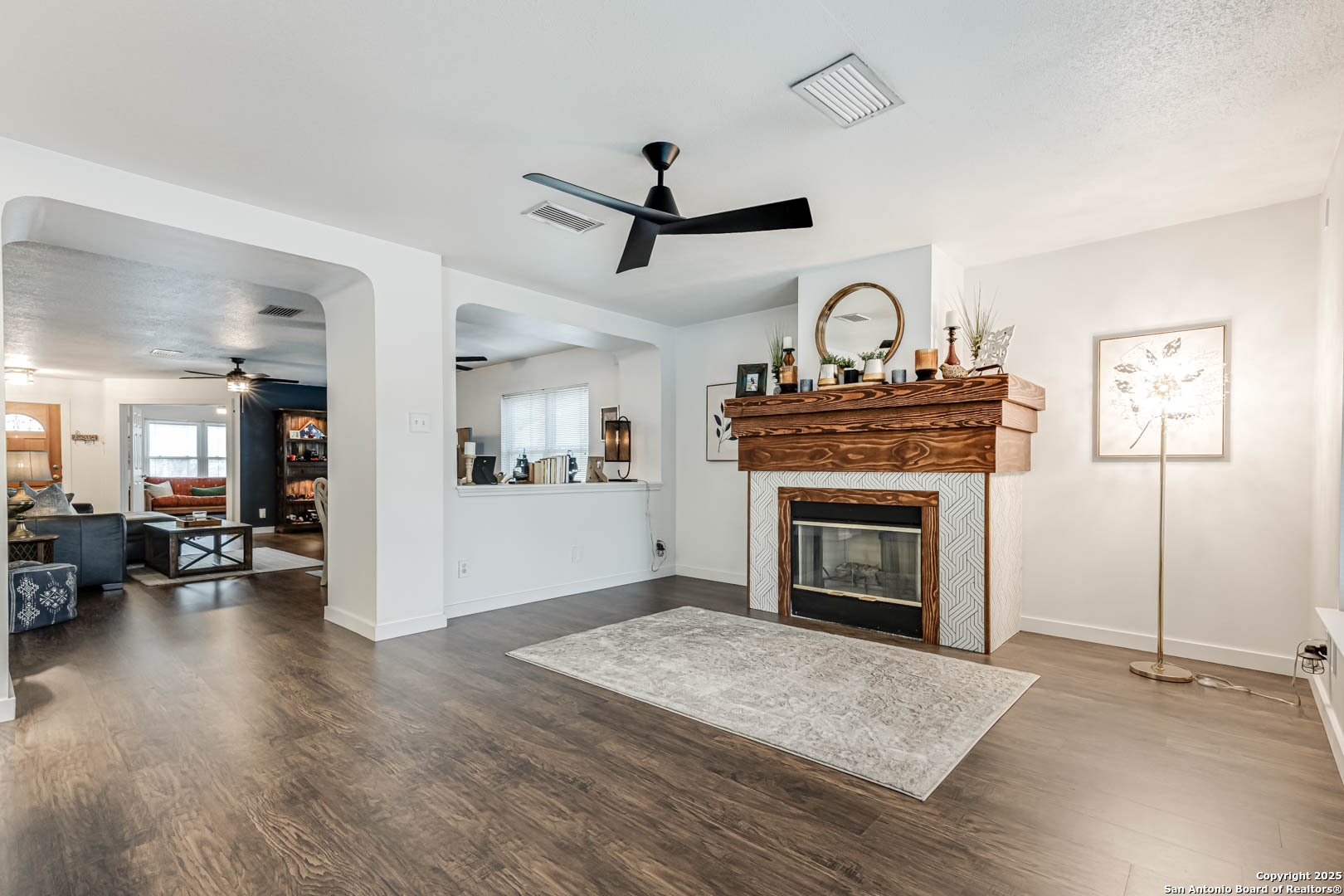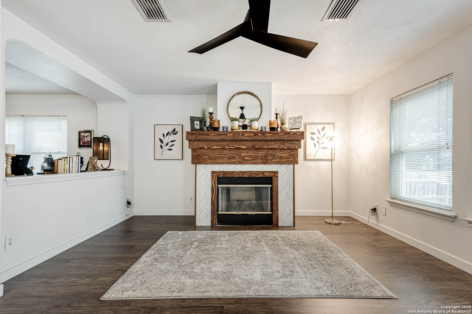 Located in the quiet and well-maintained neighborhood of Hunters Mill, this charming 1 story home boasts a long list of tasteful updates. Contemporary wood laminate and tile throughout, both bathrooms are exquisitely updated. Decorator fixtures and modern appliances have been added and the kitchen cabinets are white! Popcorn has been scraped, baseboards have been swapped, and the interior has been painted. Windows have been replaced and fireplace surround is magnifique. Walk out onto an expansive covered patio and a large flat back yard - a blank canvas ready for cultivation.