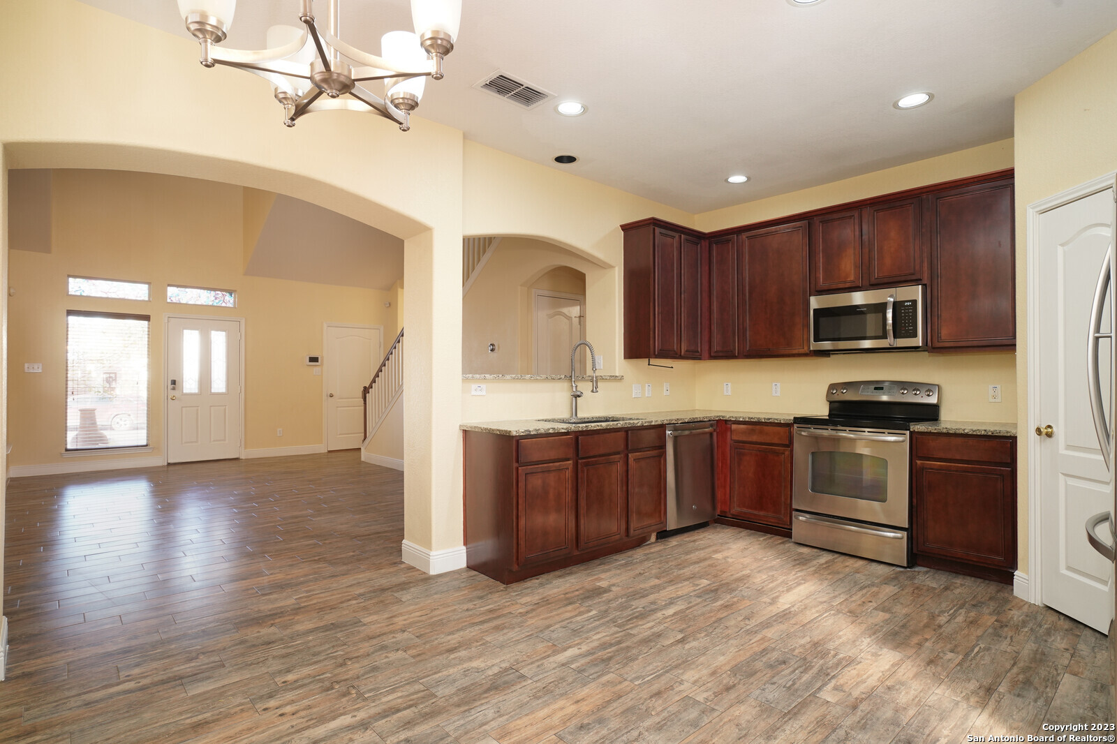 COME SEE THIS BEAUTIFUL 3BED/2.5BATH SPANISH STYLE 2-STORY HOME. THE HAS A BIG OPEN FLOOR RIGHT WHEN YOU WALK IN. HIGH CEILINGS SO THERE IS NO RESTRICTION WHEN DECORATING FOR HOLIDAYS. PRIMARY BEDROOM IS DOWNSTAIRS WITH A GOOD SIZE WALK IN CLOSET. UPDATED AND OPEN KITCHEN TO THE EATING AREA. REFRIGERATOR WILL BE LEFT FOR TENANTS TO USE. WASHER AND DRYER ARE IN AREA THAT WAS EXTENDED THAT IS PART OF GARAGE, BUT ENCLOSED. UPSTAIRS IS THE SECOND LIVING AREA/GAME ROOM AND 2 BEDROOMS.