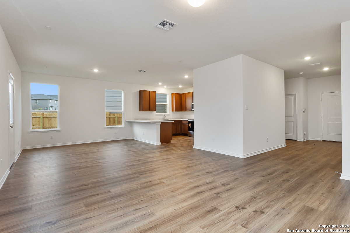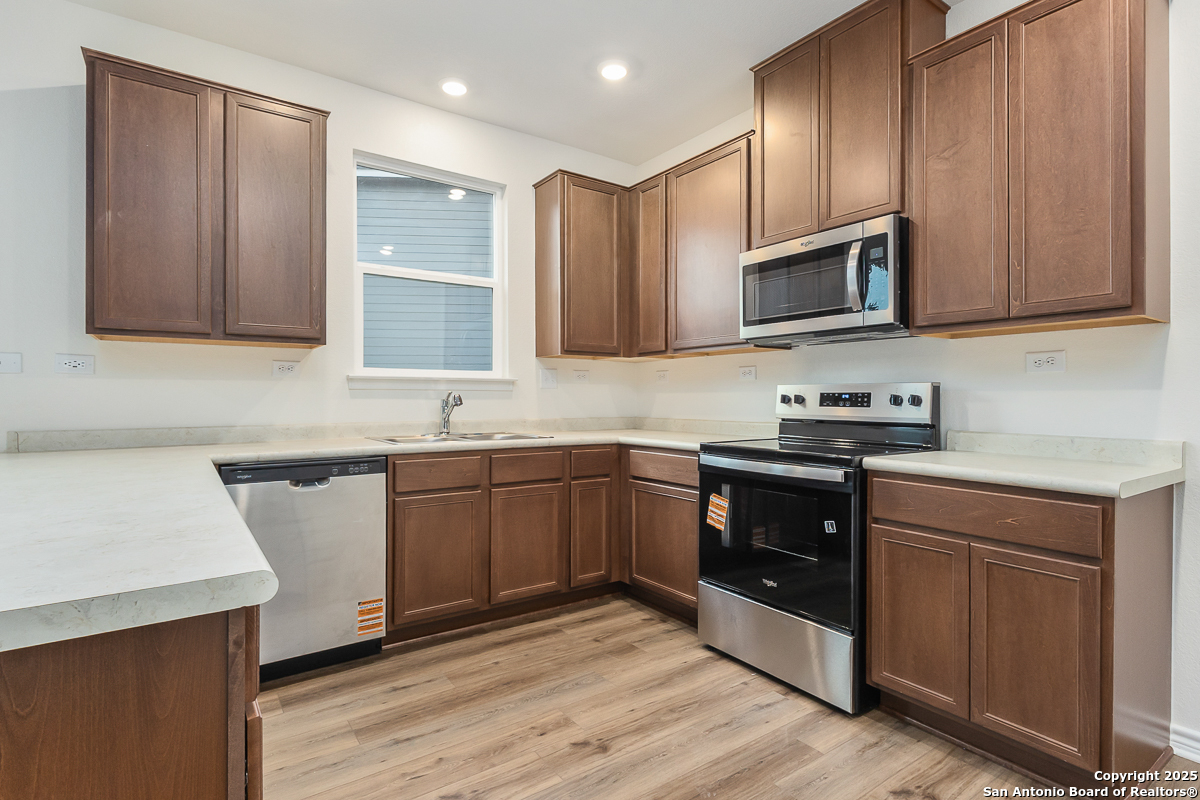 Step into comfort and style with this thoughtfully designed home featuring 9-ft. first-floor ceilings and elegant vinyl plank flooring throughout. The kitchen boasts Whirlpool stainless steel appliances, a Moen faucet, an extended breakfast bar, and 42-in. Woodmont Cody cabinets with an undermount sink. The primary bath offers upgraded cabinetry and a luxurious 42-in. garden tub/shower with a Daltile tile surround. Decorative details include Kwikset Polo knob door hardware and a Carrara-style entry door. Enjoy the convenience of a soft water loop and a built-in wireless security system. Outside, an automatic sprinkler system keeps the yard lush and inviting.