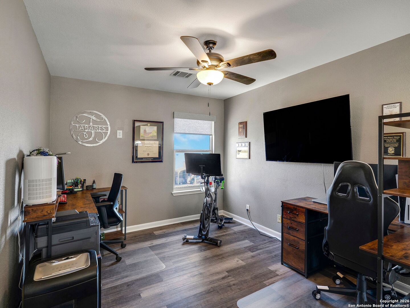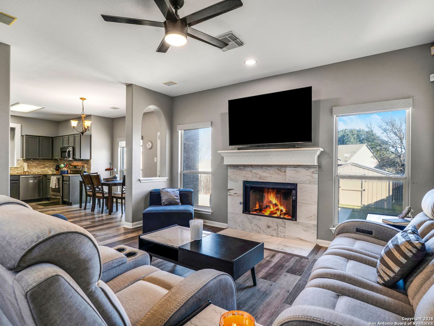 Welcome home to this move-in ready gem in Oak Ridge Village, where comfort, light, and thoughtful updates come together beautifully. This 3-bedroom, 2.5-bath home offers two inviting living areas, a 2-car garage, and an open floor plan designed for both everyday living and easy entertaining. Step inside to enjoy newer laminate flooring, fresh paint, and updated window shades, some automated, all complemented by tall ceilings and abundant natural light. The main living area is anchored by a cozy fireplace creating a warm and welcoming focal point. The eat-in kitchen is both stylish and functional, featuring granite countertops, a stone backsplash, stainless steel appliances, a walk-in pantry, and a window over the sink that brings in even more light. Your primary suite is a true retreat with an oversized bedroom, walk-in closet, and a spa-like bath offering dual sinks with granite counters and a tile walk-in shower. Out back, enjoy a large concrete patio perfect for relaxing or entertaining, plus a storage shed for added convenience. Residents of Oak Ridge Village also enjoy access to a community pool, clubhouse, and playground, adding to the neighborhood's appeal.