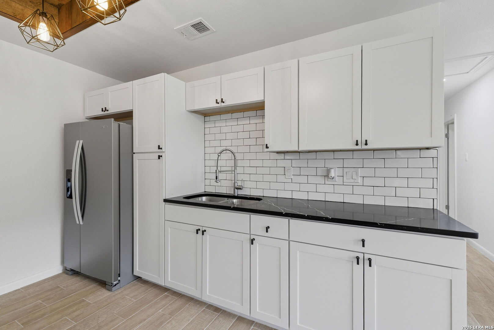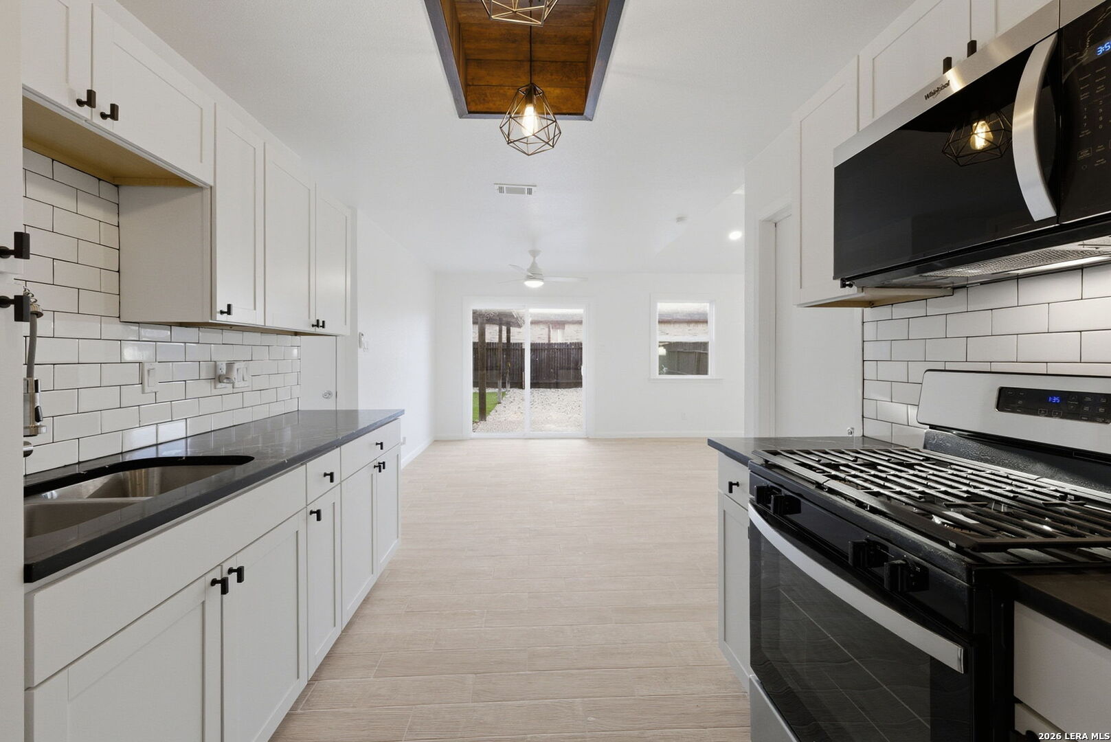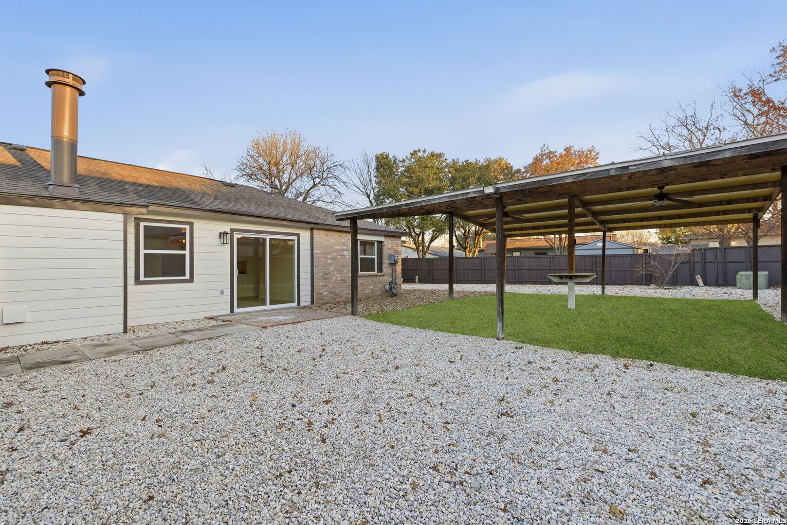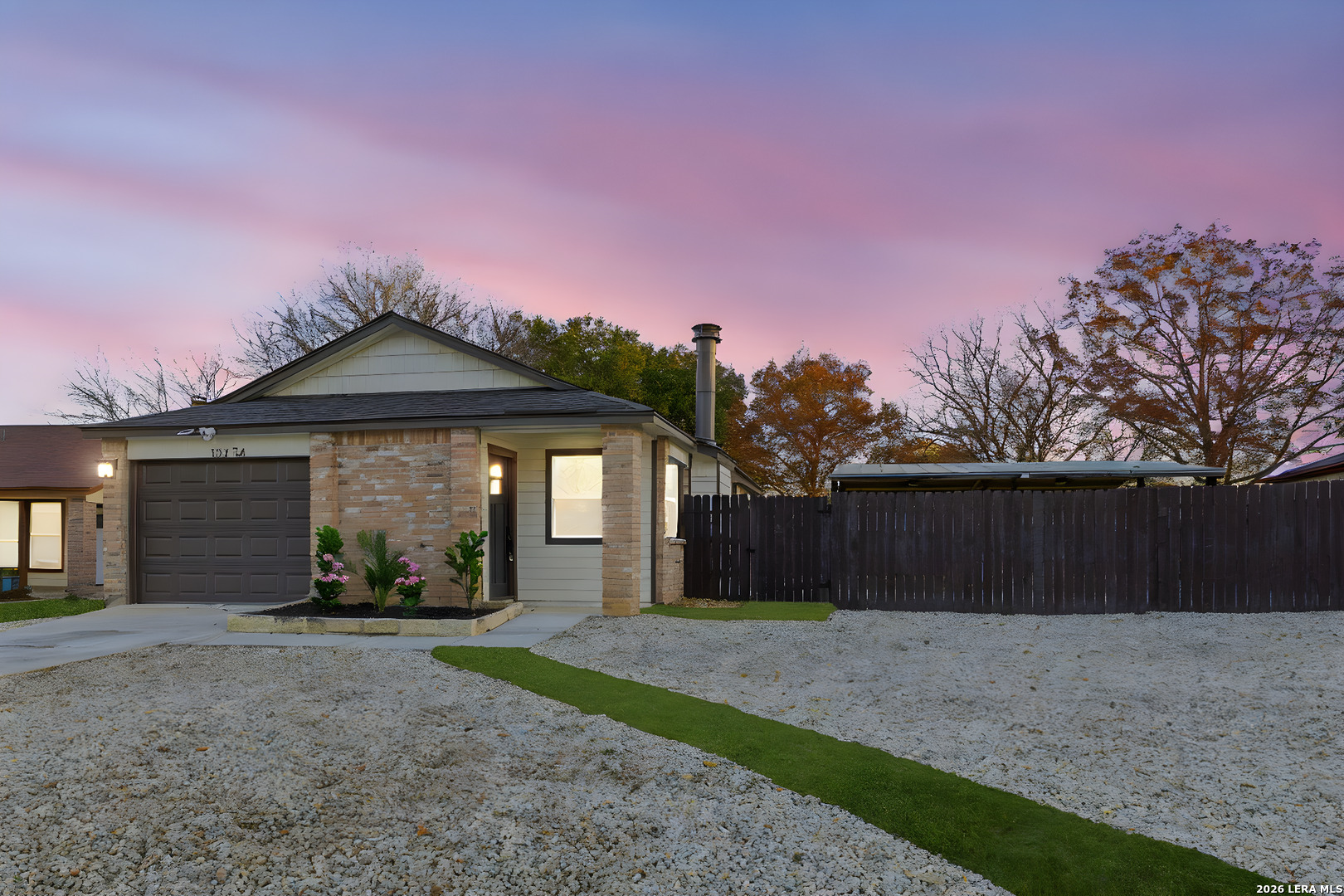 Welcome to 13734 Evanswoods in San Antonio! This fully remodeled, turn-key gem offers a sleek, modern feel throughout and is completely move-in ready. The designer kitchen is a true showstopper, featuring custom white cabinetry, elegant black countertops, a stylish subway tile backsplash, and striking pendant lighting suspended from a custom wood beam, along with brand-new stainless steel oven range and refrigerator. The bathrooms have been beautifully updated with new cabinets and classic white subway tile, creating a clean, modern look that perfectly complements the home's style. Enjoy cozy evenings in the city by the inviting fireplace, adding warmth and charm to the living space. The home offers plenty of storage, including a coat closet in the foyer, plus a convenient laundry closet ready for your washer and dryer. Step outside to a true backyard retreat, designed for year-round enjoyment. This beautifully xeriscaped, low-maintenance oasis features an expansive covered gazebo-style patio with ceiling fans, perfect for outdoor dining, entertaining, or relaxing in the shade. The fully wood fenced yard offers privacy, functionality, and plenty of space to gather with family and friends. Walking distance to Woodstone Elementary School and conveniently located near popular restaurants, shopping, and scenic nature trails. This neighborhood has so much to offer-don't miss this exceptional opportunity. A true GEM, send your offers!