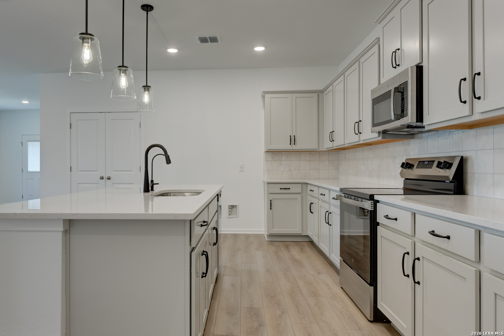 This thoughtfully designed two-story home is situated on a greenbelt, offering added privacy and peaceful backyard views. The open-concept layout features a combined living and dining area that flows into an eat-in kitchen with an island, creating a comfortable space for daily living and casual gatherings. Upstairs, a versatile loft provides additional room for relaxing, working, or entertaining. The primary suite is conveniently located downstairs and includes a private bath with a walk-in shower, single vanity, and walk-in closet, creating a quiet retreat. Two secondary bedrooms and a shared bath are located upstairs, offering separation and flexibility. Vinyl flooring in main areas pairs with carpeted bedrooms for comfort, while modern features like in-wall pest control and plumbing for a water softener add everyday convenience. Enjoy outdoor living on the covered patio with a privacy fence, making this home a perfect blend of functionality, comfort, and natural surroundings. This home is part of our Artisan Collection - where earthy tones, tactile textures, and bohemian-inspired touches come together to create a warm, inviting atmosphere. Think copper-kettle popcorn by the fire, curated finishes, and a look that's effortlessly unique, comfortably livable, and beautifully real. This home is in Hennersby Hollow, with easy access to Hwy 90, Jungman Rd., major employers, SeaWorld, shopping, and top Medina Valley ISD schools. Community amenities include a pool, lazy river, playground, and activity lawn.