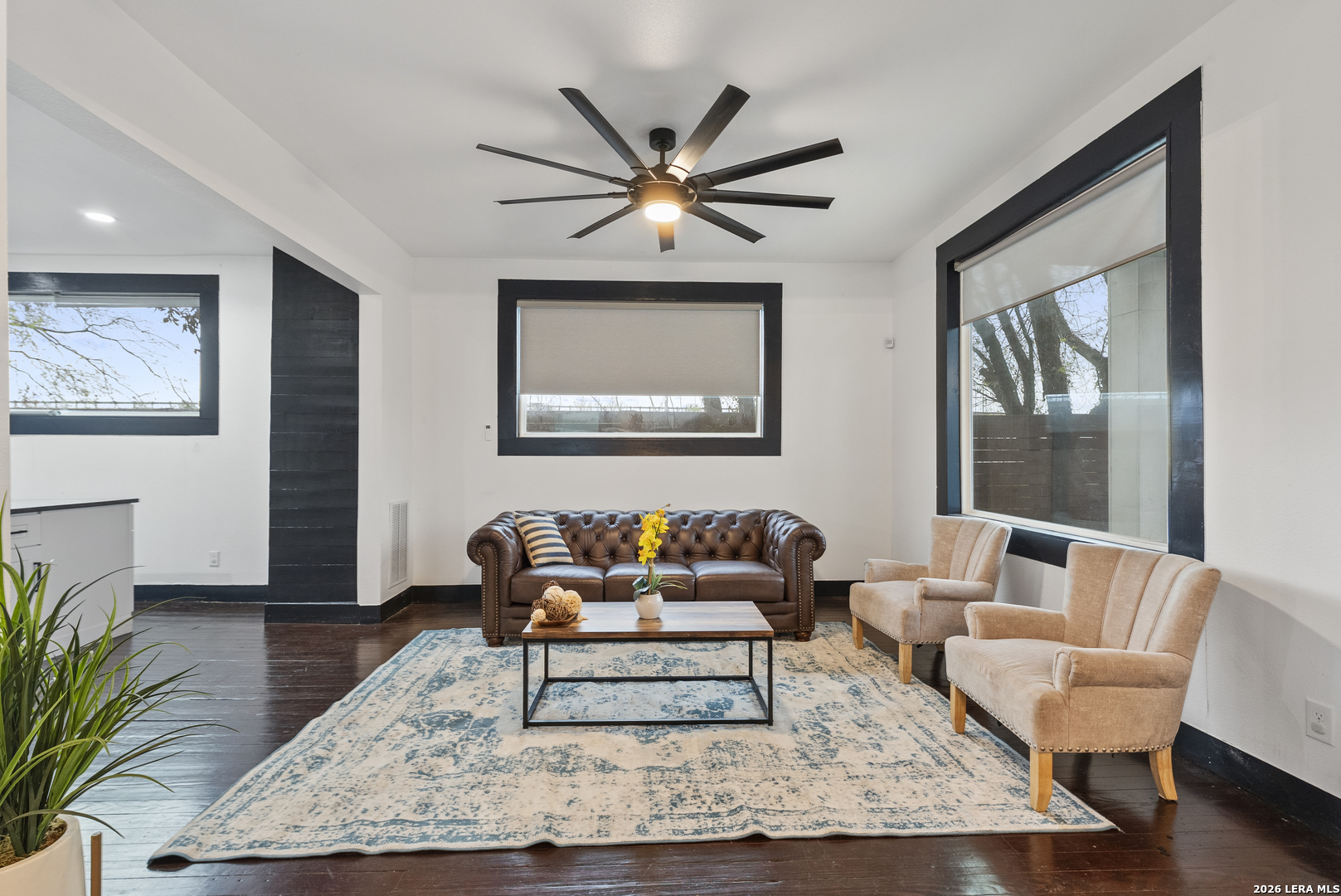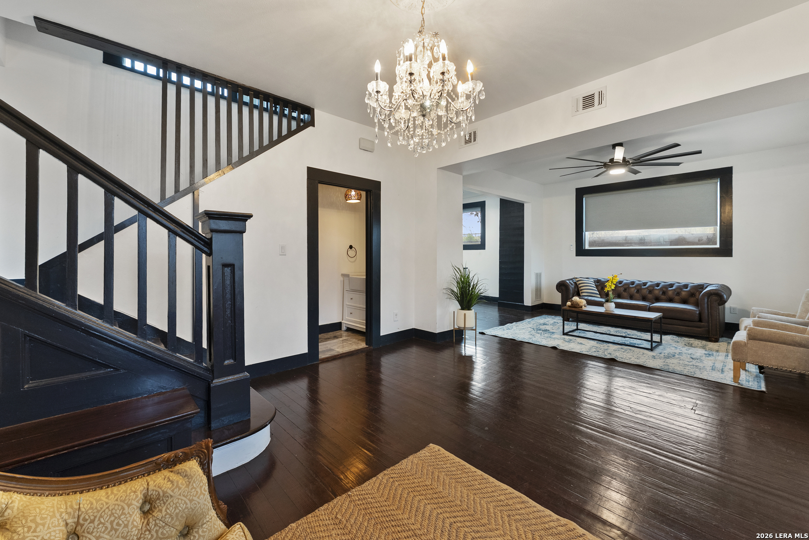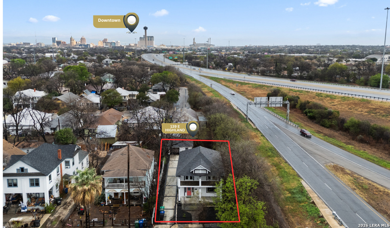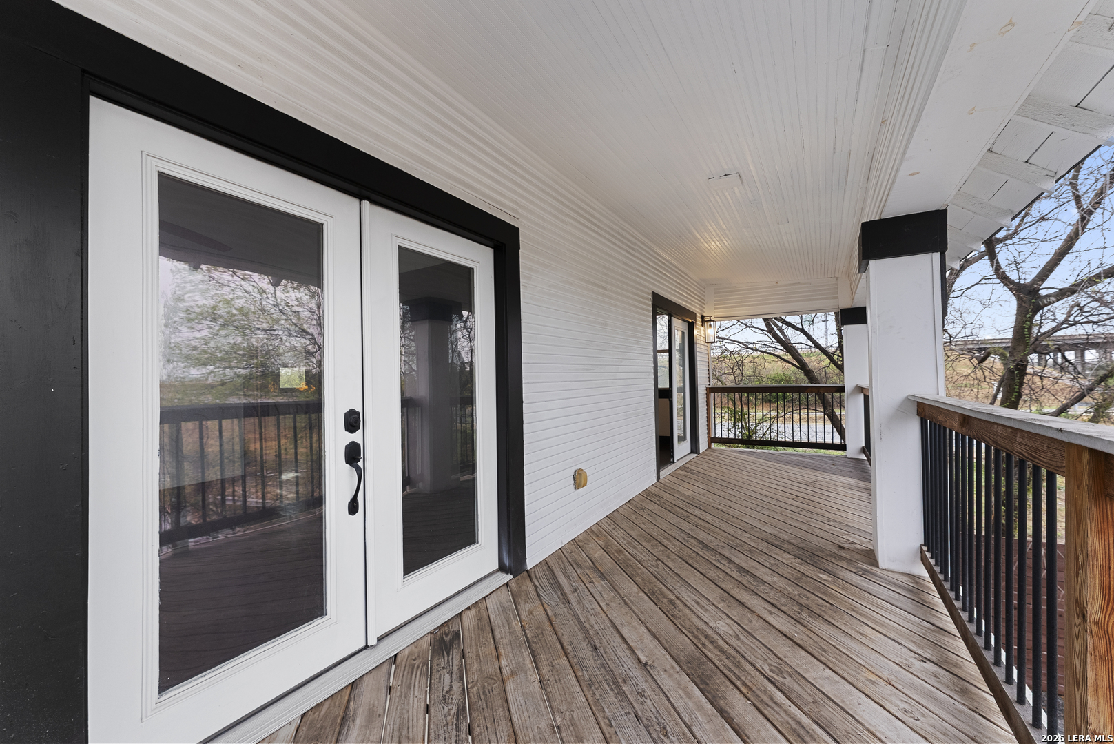 Beautifully restored 1914 historic home blending timeless character with modern updates. Enter through private wrought iron gates to a home featuring an oversized front porch and balcony, high ceilings, abundant natural light, and mostly original hardwood floors. The open floor plan includes a downstairs primary suite with spa-style bath and deck access, plus an updated kitchen with granite countertops, stainless steel appliances, and a large island. Upstairs offers three spacious bedrooms, a sitting/game room, and a balcony with downtown views. Detached two-car garage, privacy fence, tankless water heater, and major system updates. Located minutes from the San Antonio River Walk, The Pearl, Blue Star Arts Complex, and Hemisfair Park.