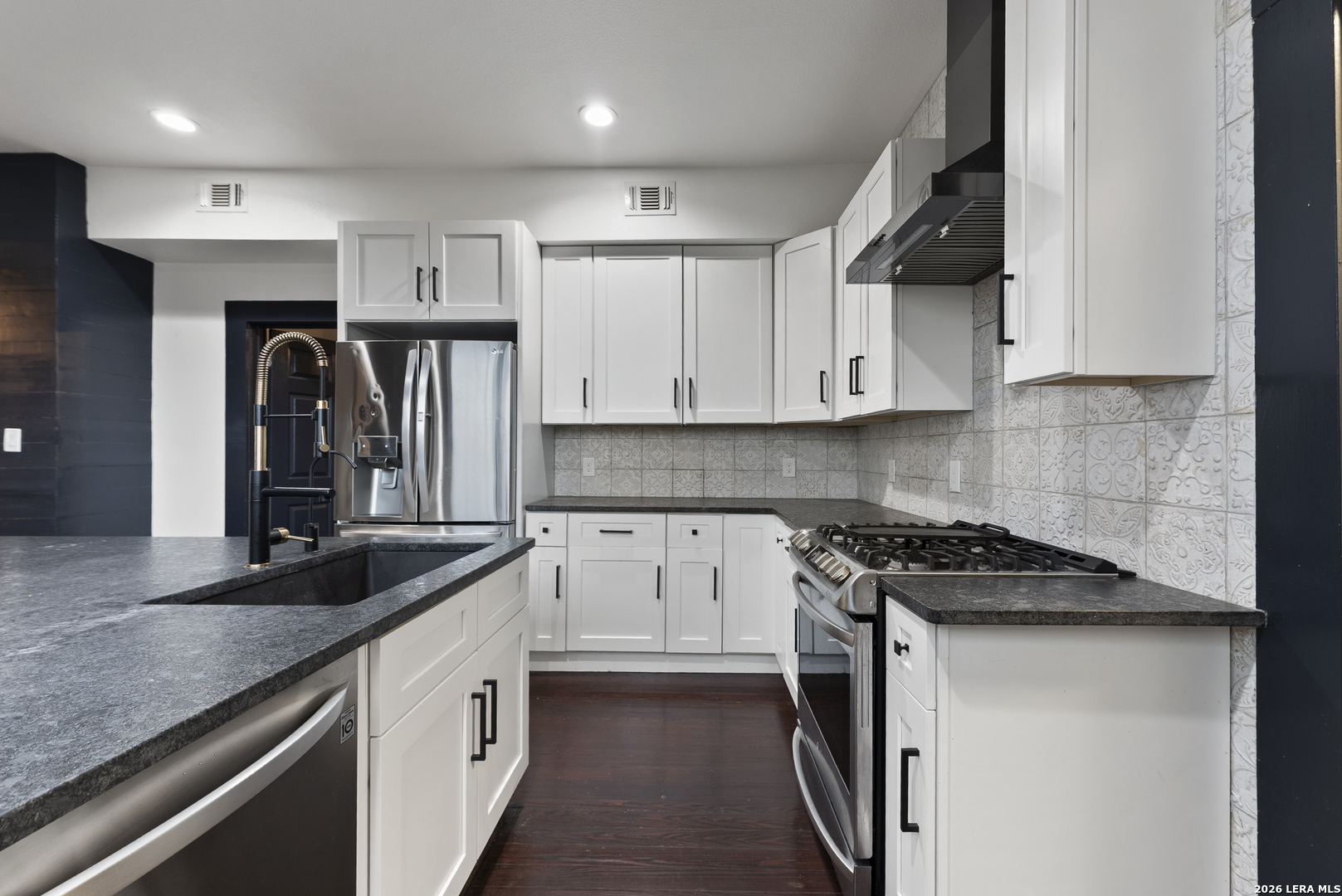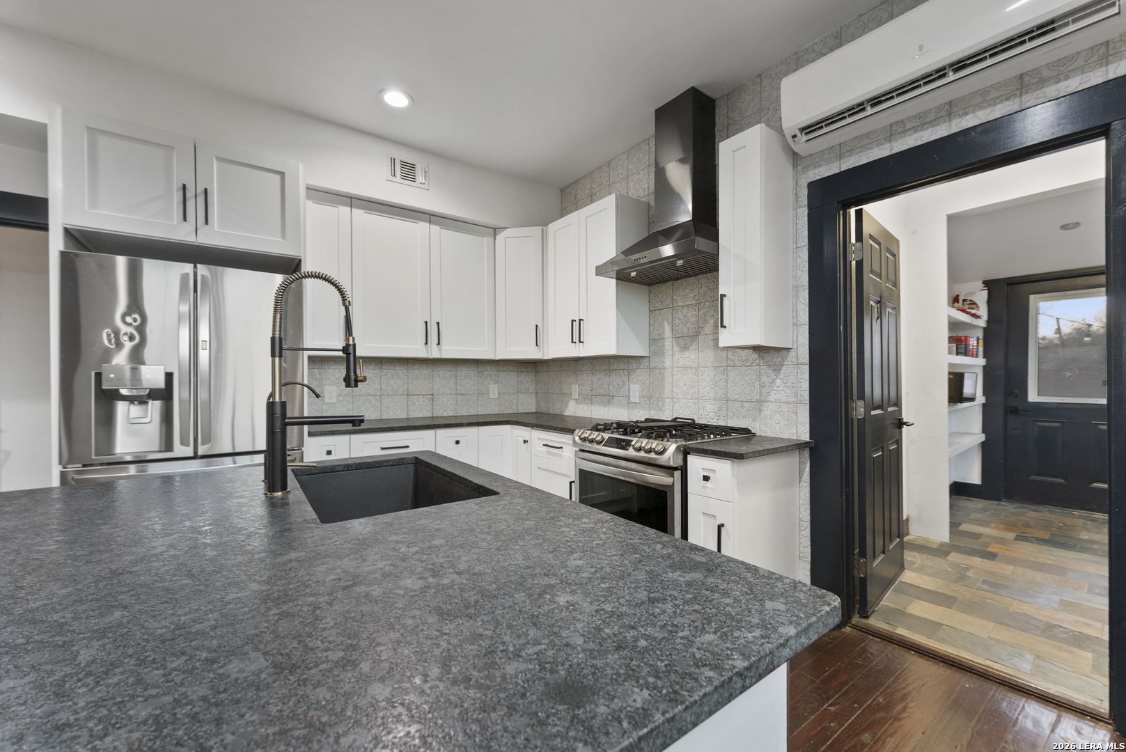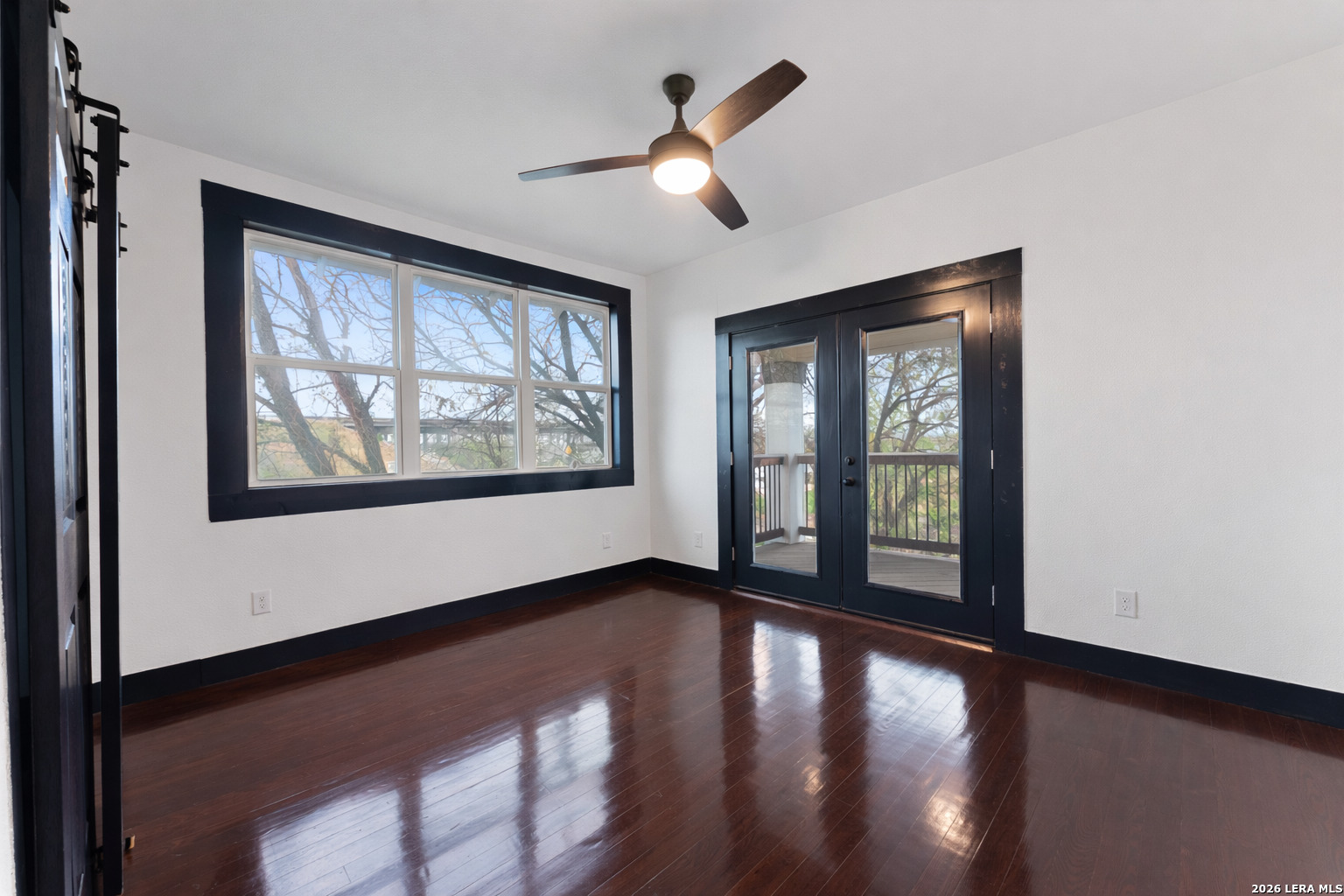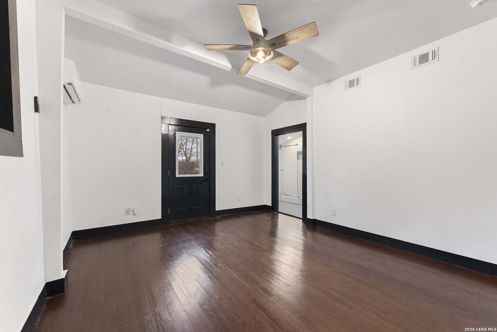 Beautifully restored 1914 historic home blending timeless character with modern updates. Enter through private wrought iron gates to a home featuring an oversized front porch and balcony, high ceilings, abundant natural light, and mostly original hardwood floors. The open floor plan includes a downstairs primary suite with spa-style bath and deck access, plus an updated kitchen with granite countertops, stainless steel appliances, and a large island. Upstairs offers three spacious bedrooms, a sitting/game room, and a balcony with downtown views. Detached two-car garage, privacy fence, tankless water heater, and major system updates. Located minutes from the San Antonio River Walk, The Pearl, Blue Star Arts Complex, and Hemisfair Park.