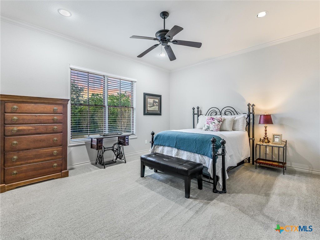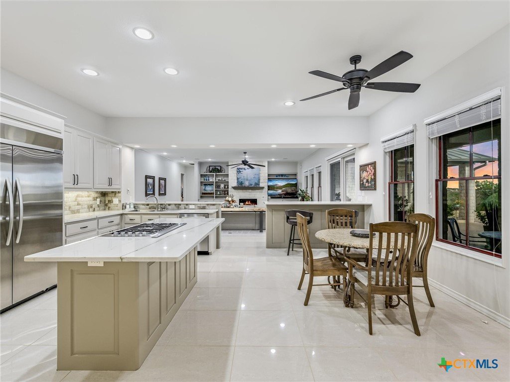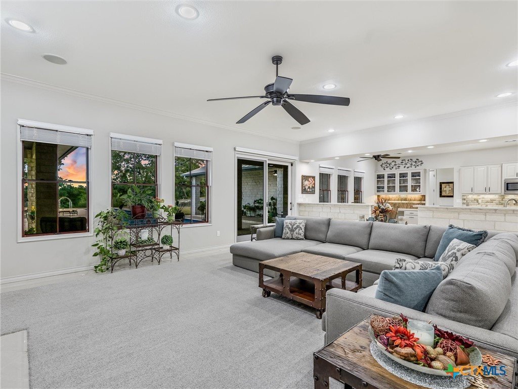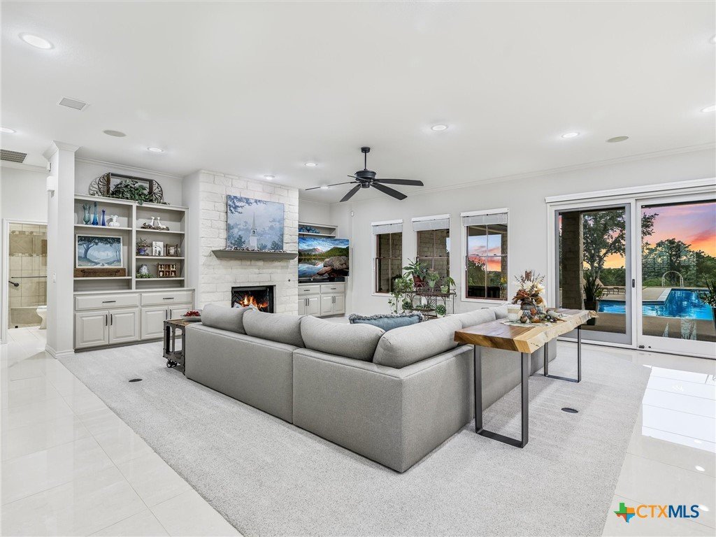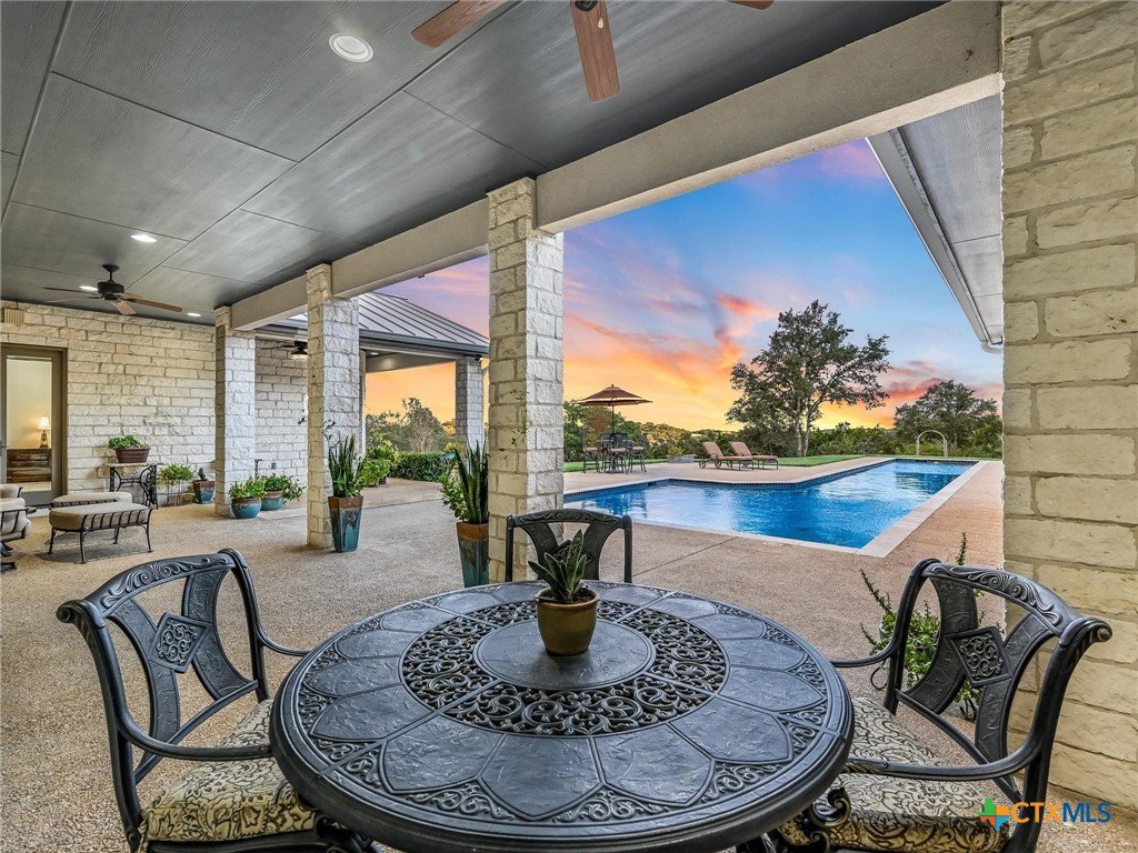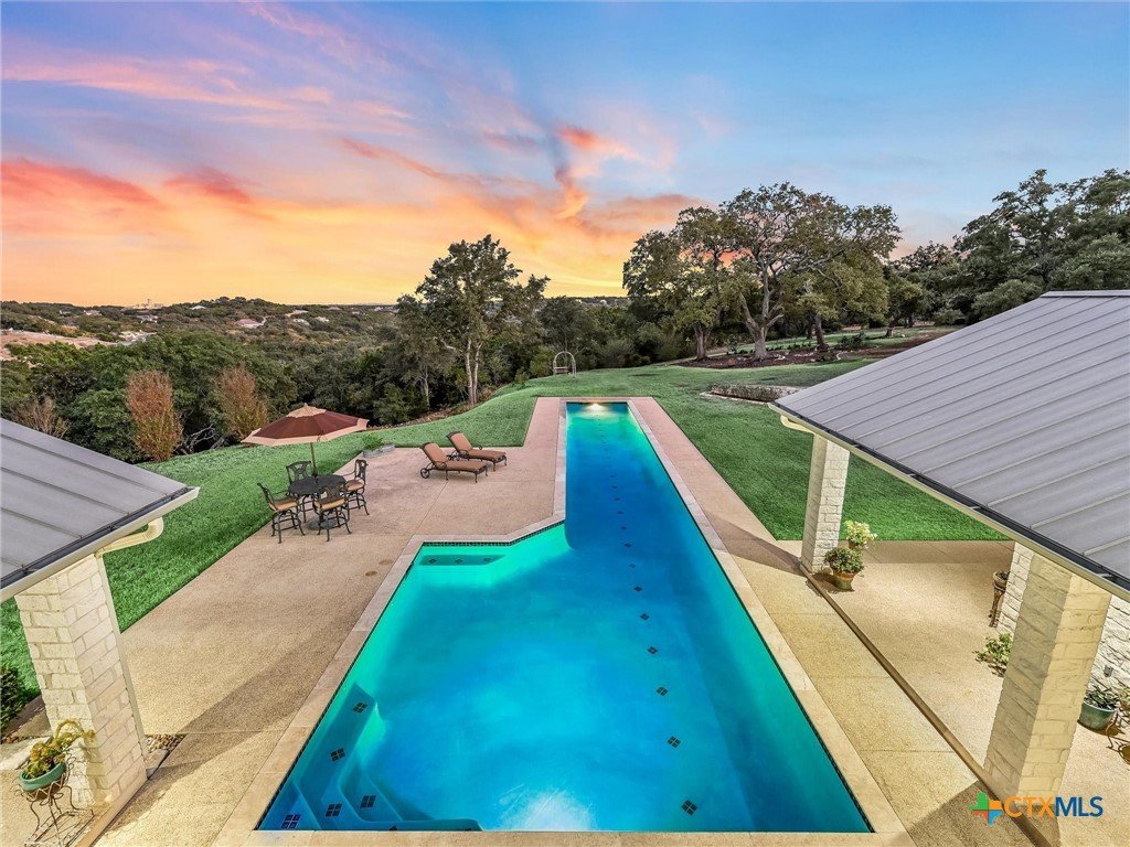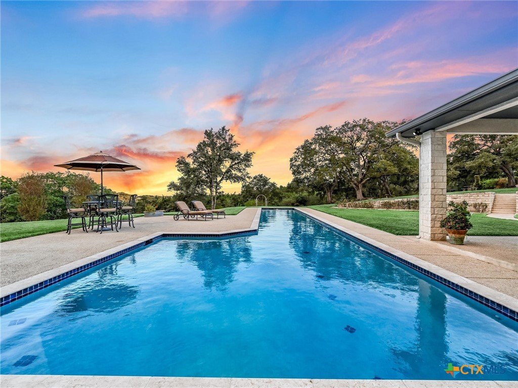 Welcome to this beautiful, 4-bedroom, 4-bathroom home in the sought-after River Chase neighborhood of New Braunfels, offering a peaceful, relaxed lifestyle. This 4,900+ sq ft residence features oversized rooms, most that have been remodeled with new paint, countertops, flooring, custom blinds, drapes, including front iron doors. The property spans over 2 fully fenced and gated acres at the end of a quiet cul-de-sac, providing privacy and a picturesque setting that includes a salt water gunite lap pool and custom built, landscaped fountain. This exceptional home was built with efficiency, quality and security in mind, featuring 5/8” drywall, insulated interior walls, 2 foam insulated walk-in attic spaces, custom Elfa shelving, pantry and utility room, Pella doors and windows, 2 tankless water heaters, and a metal roof. The security system includes exterior cameras and motion sensor lights, door sensors, and indoor motion detectors. Other features include a water softener, pre-wired speakers indoor & outdoor, 2 fireplaces, indoor utility room for extra storage, seasonal clothing, etc., and an extended 3rd garage door bay for oversized vehicles. The upstairs kitchenette provides flexibility for a mother-in-law suite, exercise room, game room or media room. The upstairs patio has 2 outdoor storage rooms. Additional exterior features include a sprinkler system, fire pit, walking path, and a gas line and electrical access for an outdoor kitchen. The primary HVAC unit and pool pump have recently been replaced. Most furniture is available for sale. Exclusive resident amenities include 2 community parks, club house, swimming pool, fitness center, hiking trails, sports courts/fields, and access to the Guadalupe River. Don’t miss your chance to own a piece of the Hill Country in the heart of River Chase!