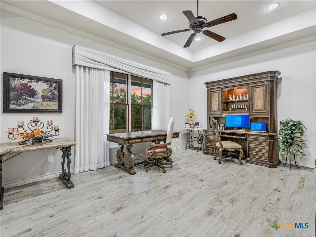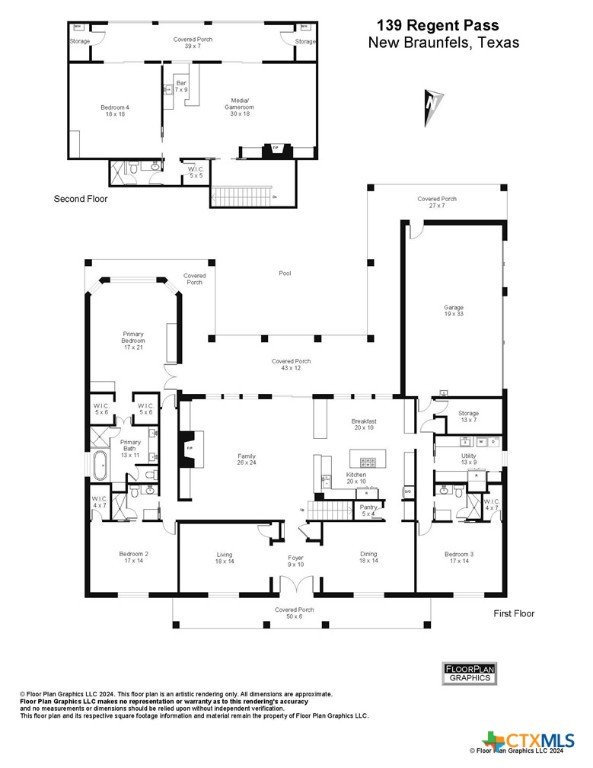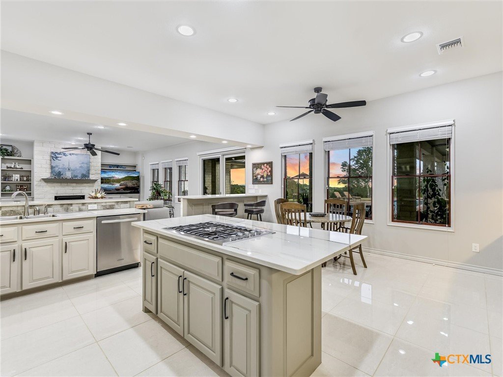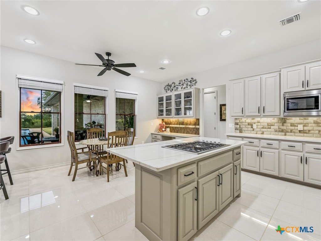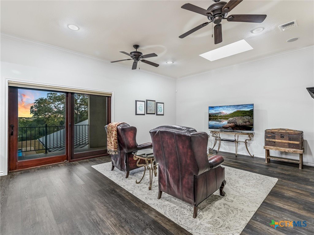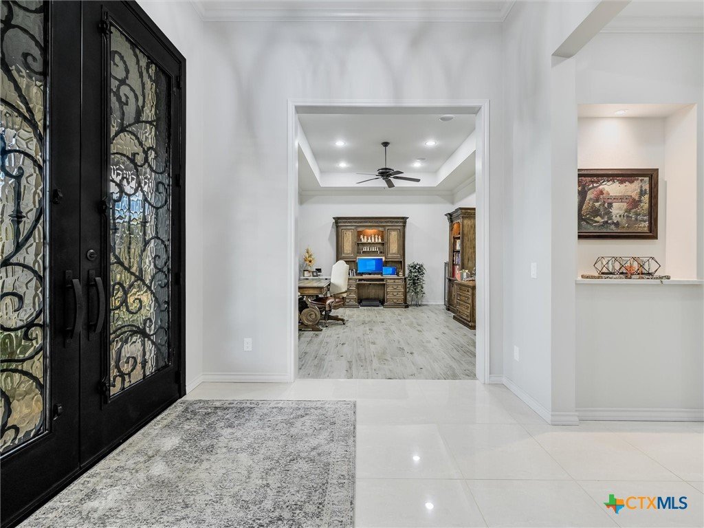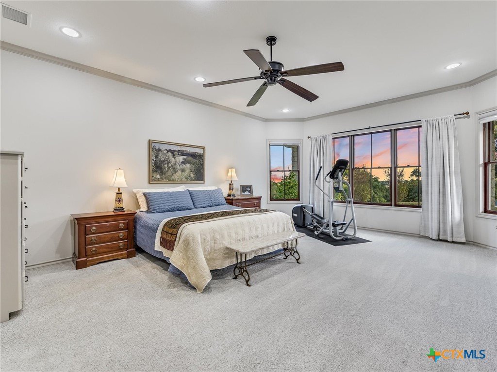 Welcome to this beautiful, 4-bedroom, 4-bathroom home in the sought-after River Chase neighborhood of New Braunfels, offering a peaceful, relaxed lifestyle. This 4,900+ sq ft residence features oversized rooms, most that have been remodeled with new paint, countertops, flooring, custom blinds, drapes, including front iron doors. The property spans over 2 fully fenced and gated acres at the end of a quiet cul-de-sac, providing privacy and a picturesque setting that includes a salt water gunite lap pool and custom built, landscaped fountain. This exceptional home was built with efficiency, quality and security in mind, featuring 5/8” drywall, insulated interior walls, 2 foam insulated walk-in attic spaces, custom Elfa shelving, pantry and utility room, Pella doors and windows, 2 tankless water heaters, and a metal roof. The security system includes exterior cameras and motion sensor lights, door sensors, and indoor motion detectors. Other features include a water softener, pre-wired speakers indoor & outdoor, 2 fireplaces, indoor utility room for extra storage, seasonal clothing, etc., and an extended 3rd garage door bay for oversized vehicles. The upstairs kitchenette provides flexibility for a mother-in-law suite, exercise room, game room or media room. The upstairs patio has 2 outdoor storage rooms. Additional exterior features include a sprinkler system, fire pit, walking path, and a gas line and electrical access for an outdoor kitchen. The primary HVAC unit and pool pump have recently been replaced. Most furniture is available for sale. Exclusive resident amenities include 2 community parks, club house, swimming pool, fitness center, hiking trails, sports courts/fields, and access to the Guadalupe River. Don’t miss your chance to own a piece of the Hill Country in the heart of River Chase!