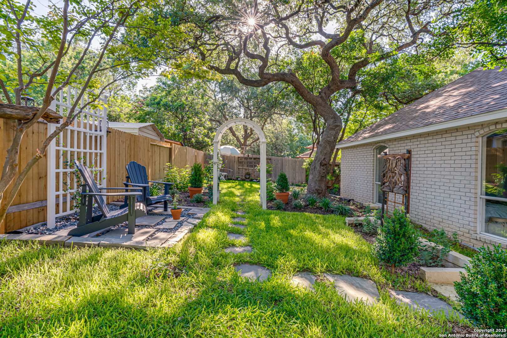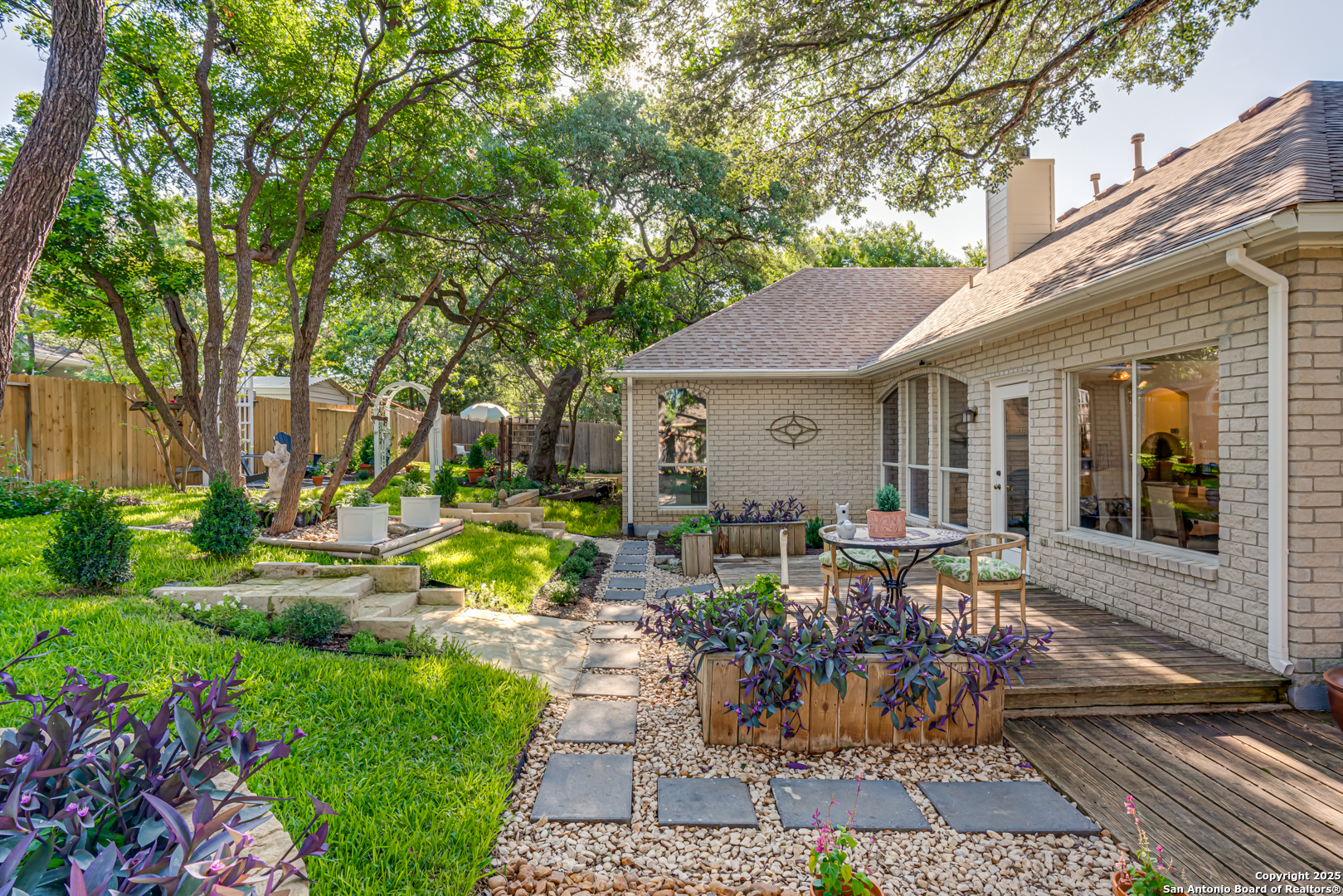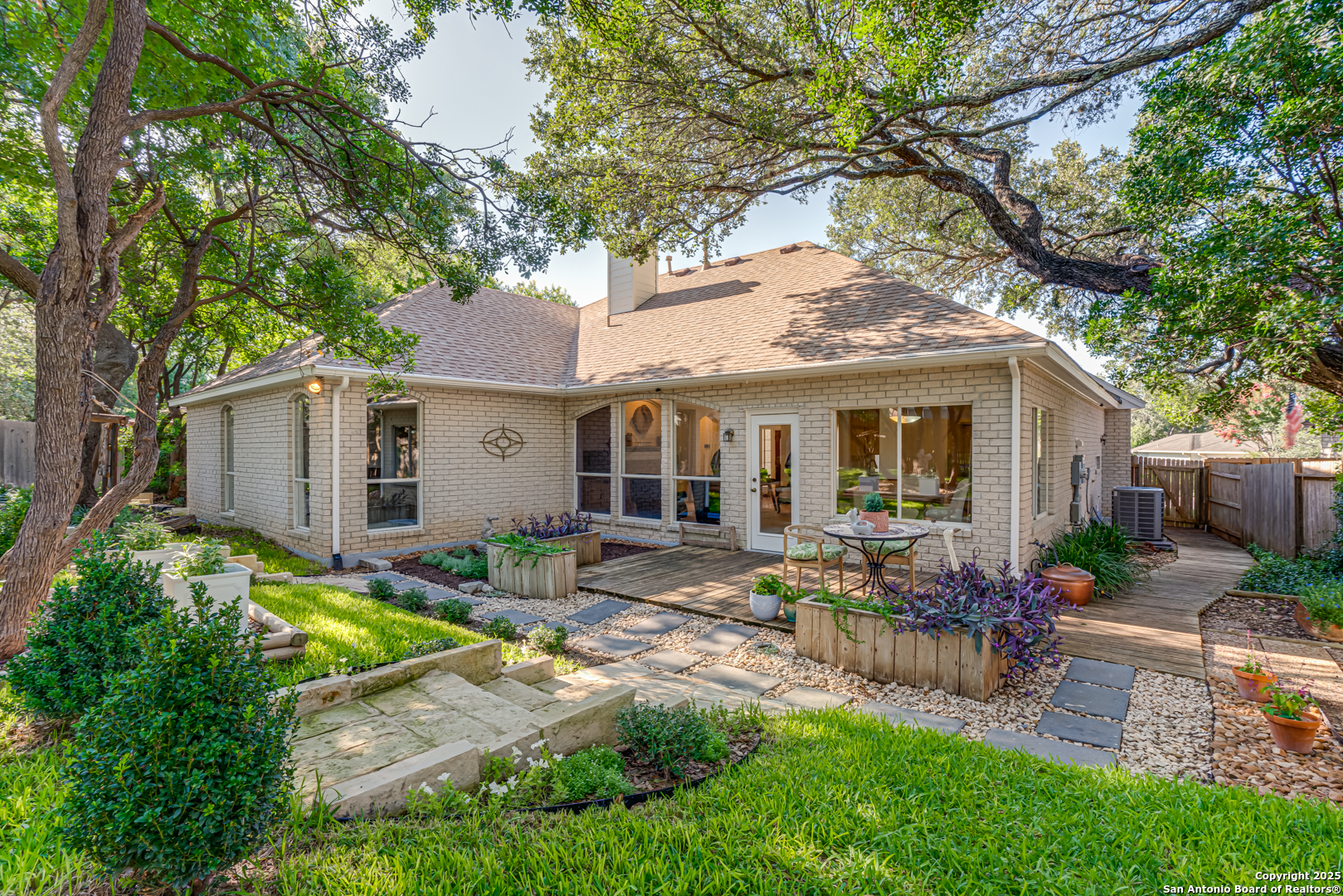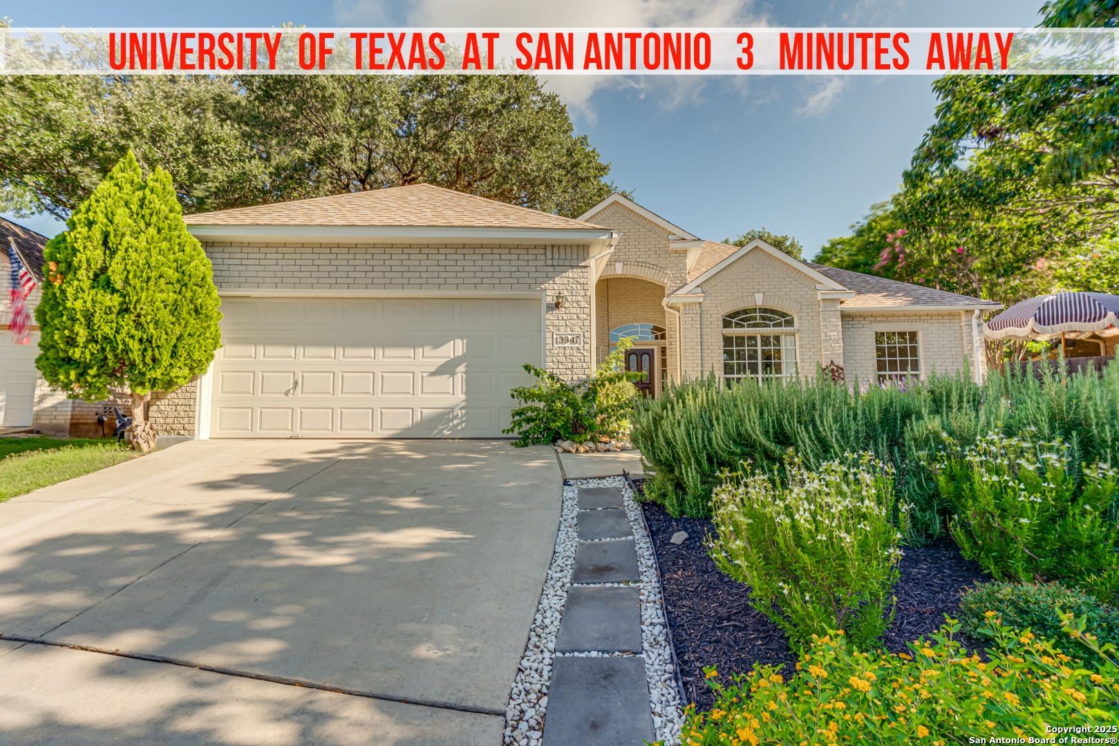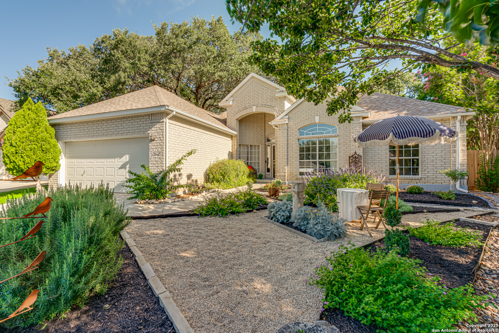 Tucked inside a quiet gated community near UTSA, this charming one-story home offers 4 bedrooms, 2 bathrooms, and just over 2,100 sq ft of thoughtfully maintained living space. From the moment you arrive, the front and backyard greet you with lush, garden-style landscaping, carefully designed as a peaceful oasis. A French-draining irrigation system runs from the backyard to the front, making maintenance easy and efficient. Step inside to a spacious layout featuring a formal dining room and a separate front living area that can easily serve as a second dining space, reading room, or flex area. Natural light pours into the open-concept living space, highlighting the updated kitchen with sleek countertops and a brand-new stove and oven, ready for daily meals or entertaining. The cozy gas fireplace in the living room adds warmth and charm, making it an inviting space to unwind. Each bedroom offers comfort and space, while the primary suite provides a relaxing retreat with a walk-in shower and soaking tub. Located just minutes from UTSA and one of San Antonio's largest entertainment districts, you'll enjoy quick access to shopping such as La Cantera, dining, and fun for all ages. With a blend of quiet comfort and unbeatable location, this home truly has something for everyone.
