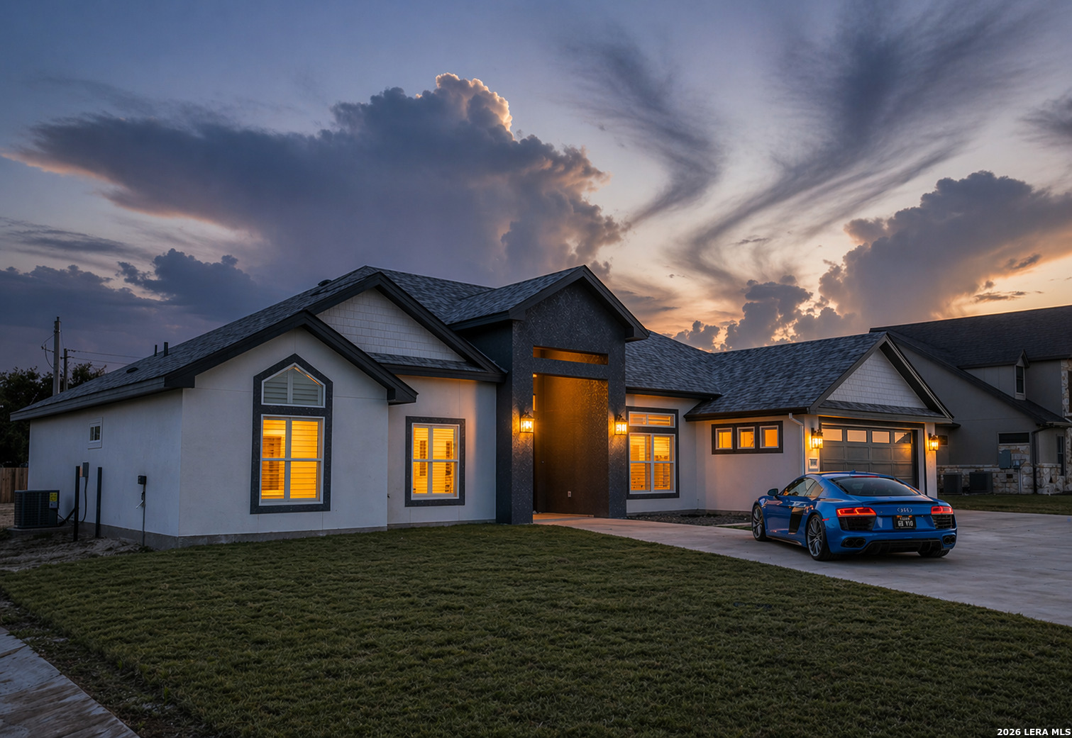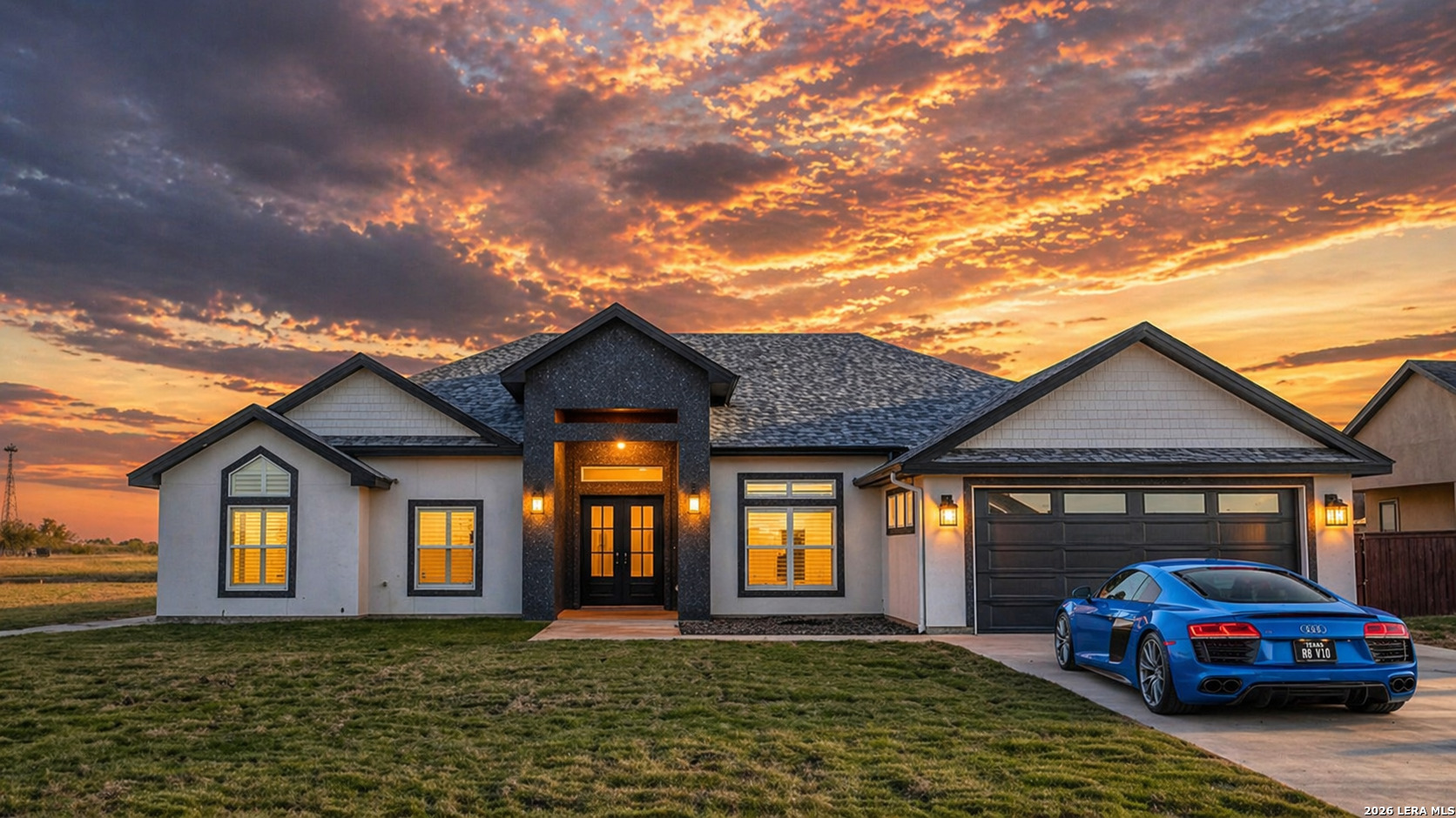 Now offering $5,000 is buyers concessions! This newly completed custom home in one of Uvalde's most desirable new neighborhoods offers a thoughtful blend of modern design, quality craftsmanship, and everyday comfort. With 4 bedrooms, 3.5 baths, and approximately 2,280 sq. ft. of living space, the layout centers around a highly sought-after open concept that brings the kitchen, dining, and living areas together in one inviting setting. The interior is finished with ceramic tile throughout for a clean, cohesive look and easy maintenance. A 10-foot quartz island anchors the custom kitchen, complemented by custom cabinetry, a beautifully tiled backsplash, and a dedicated dining area plus a breakfast nook. A convenient half bath sits just off the kitchen and also opens to the back patio-an ideal setup for entertaining or future outdoor additions like a pool. Large French doors lead to the covered back porch, creating a great place to unwind in the evenings. The primary suite features a coffered ceiling with white-washed exposed beams, a spacious walk-in closet with built-ins, and a stunning bath complete with dual vanities, a custom tile shower with frameless glass, and a private water closet. Two guest bedrooms include plantation-style shutters, generous walk-in closets with built-in storage, and easy access to a beautifully finished guest bath with quartz counters and a custom walk-in shower. Across the main living area, a second master suite offers flexibility for multigenerational living, extended guests, or a private home office. Additional highlights include custom lighting throughout, decorative eave lighting that gives the home incredible curb appeal at night, a custom steel industrial-style front door with smart keypad entry, and two HVAC units for efficient climate control. The laundry room offers excellent natural light, cabinetry, and a built-in folding table. The fully finished two-car garage includes sheetrock, trim, paint, architectural windows, LED lighting, and an electric opener. Outside, the home features fresh sod, a front sprinkler system, and sits on just over one-third of an acre. The location is hard to beat-just blocks from four major schools and less than five minutes from Uvalde's new hospital. This is a true custom build with finishes and details that set it apart from the typical new-construction home