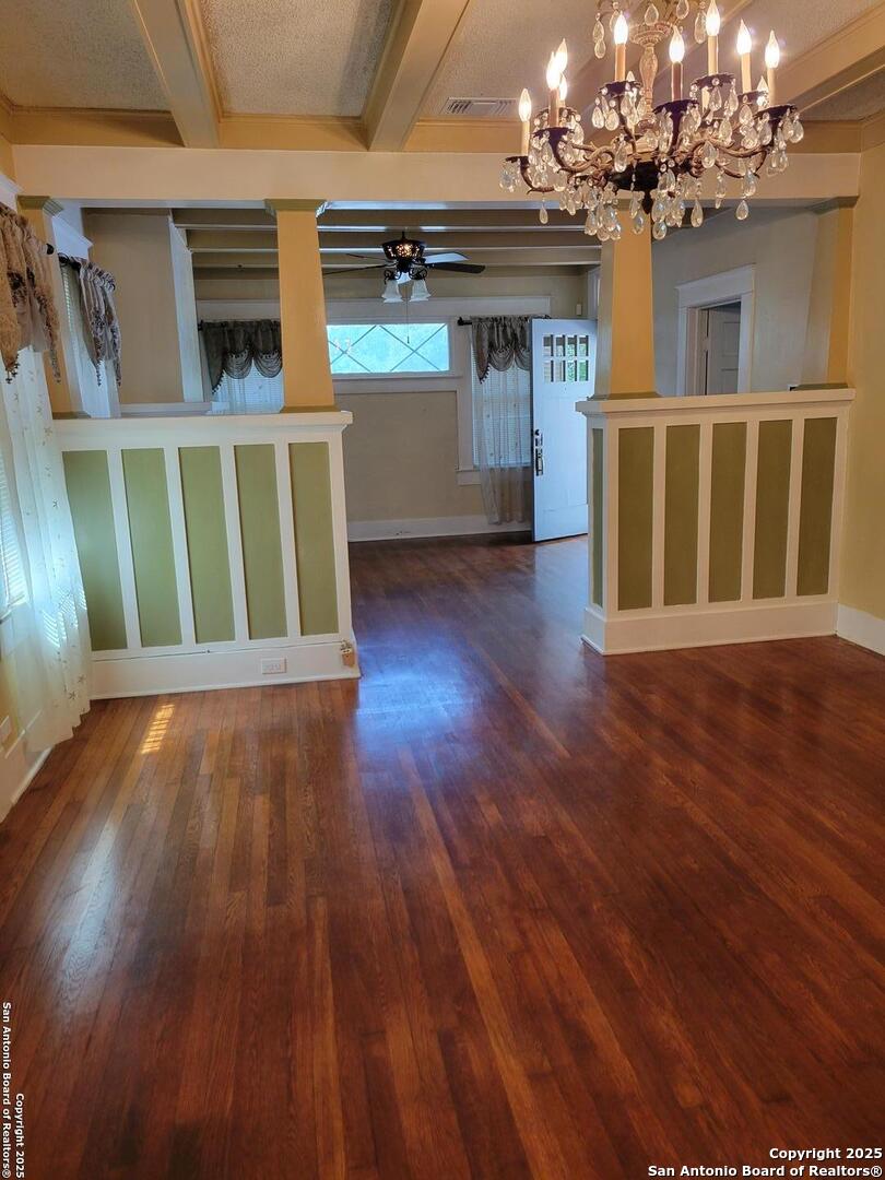 If you like antique architecture, this is one to tour! Over 100 years old, with Coffered ceiling, fireplace, built-in sideboard, chandelier, hardwood floors , huge pantry and clawfoot tub...there are many charming original details. However, the central air is a welcome update, and the covered patio. Three bedrooms plus a bonus room that could be office, nursery, exercise room or just extra storage. Jack and Jill bath plus half half, laundry connections. Just south of downtown, off Presa. Fenced backyard. Not your everyday rental.