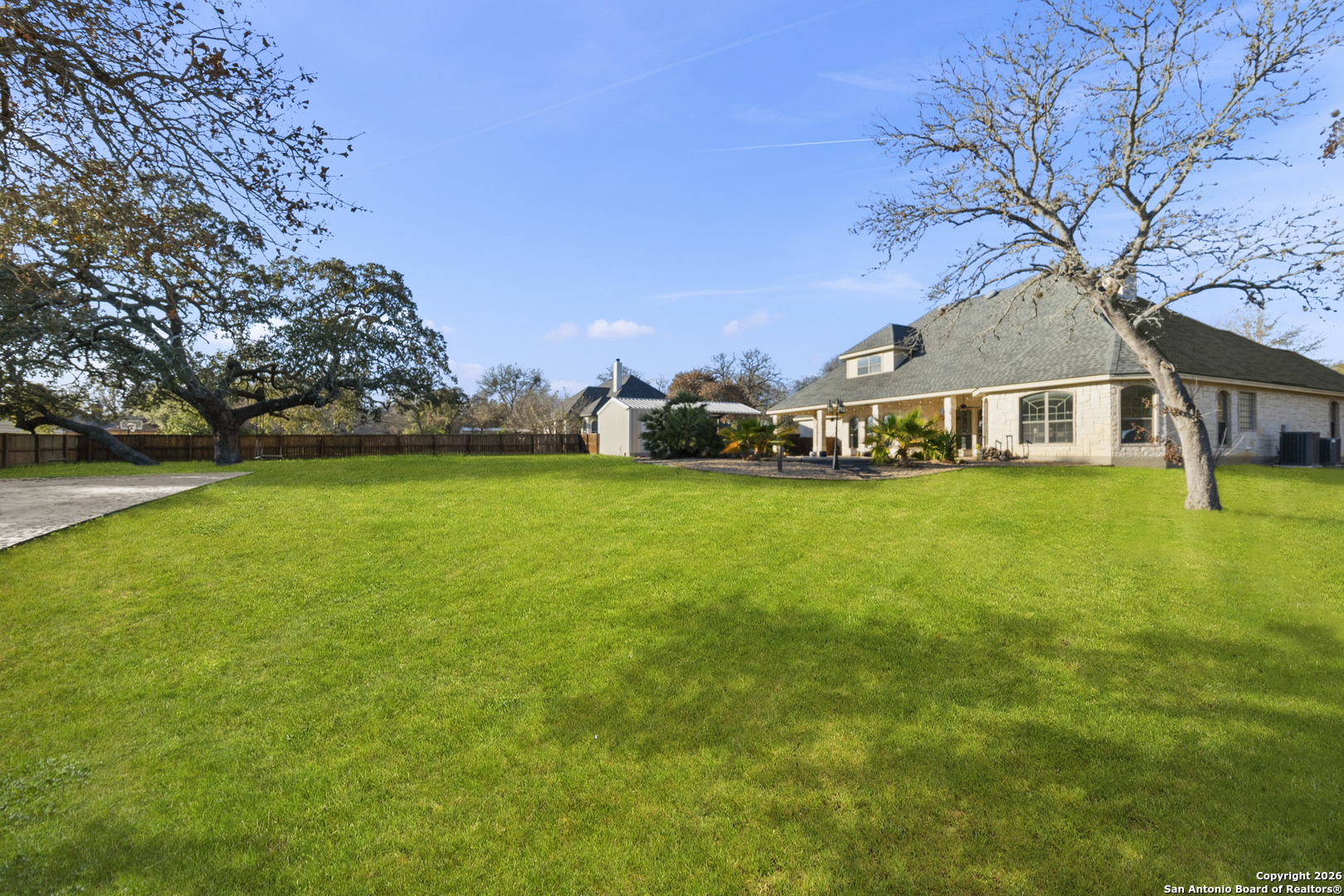 Custom home on over one acre in Legacy Ranch, located on a quiet cul de sac with mature trees and no HOA. This La Vernia acreage property offers privacy, flexibility, and resort style outdoor living. A side entry three car garage and expansive lot create an inviting first impression. Inside, tall ceilings and abundant windows fill the home with natural light. The open floor plan features a large living room with stone fireplace, adjoining the kitchen and dining areas, making an ideal space for everyday living and entertaining. The first floor primary suite includes a sitting area, bathroom with large tub and walk in shower, and a spacious closet. Flexible secondary bedrooms can serve as guest rooms, a home office, or fitness space. Upstairs, a large game room with wet bar and full bath provides additional living space for teenagers seeking their own space or overnight guests. The private backyard retreat includes an inground pool with waterfall, expansive covered patio, outdoor kitchen and bar, fire pit, and sand volleyball court. A detached storage shed offers a loft, pool half bath, additional parking and RV hookup. Located minutes from La Vernia town center with easy access to San Antonio, this beautiful acreage home combines comfort, privacy, and exceptional outdoor amenities.