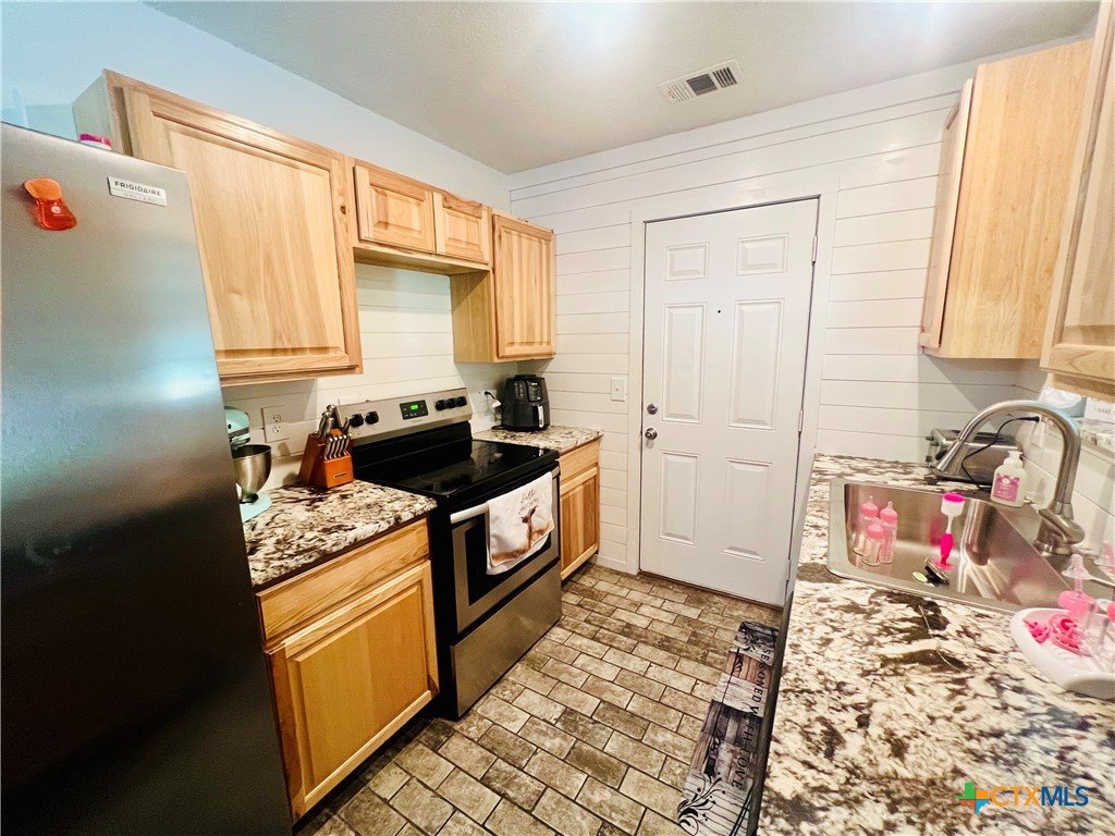Charming 4-Bedroom Brick Home in Quiet Neighborhood – Minutes from Downtown Lampasas! Welcome to this beautifully updated 4-bedroom, 1.5-bath brick home located in a peaceful neighborhood just minutes from downtown Lampasas and local schools. This cozy, well-maintained home features a spacious master bedroom complete with a large walk-in closet for ample storage. Enjoy the convenience of indoor laundry, a bright and functional layout, and a warm, inviting atmosphere throughout. Step outside to a generously sized covered back patio—perfect for entertaining or relaxing—plus an additional covered patio area and a large storage building to meet all your outdoor needs. The home also includes a covered front entrance and a large covered 2-car carport, offering both curb appeal and practicality. Don’t miss this opportunity to own a move-in ready home with great updates, comfortable living spaces, and a fantastic location!